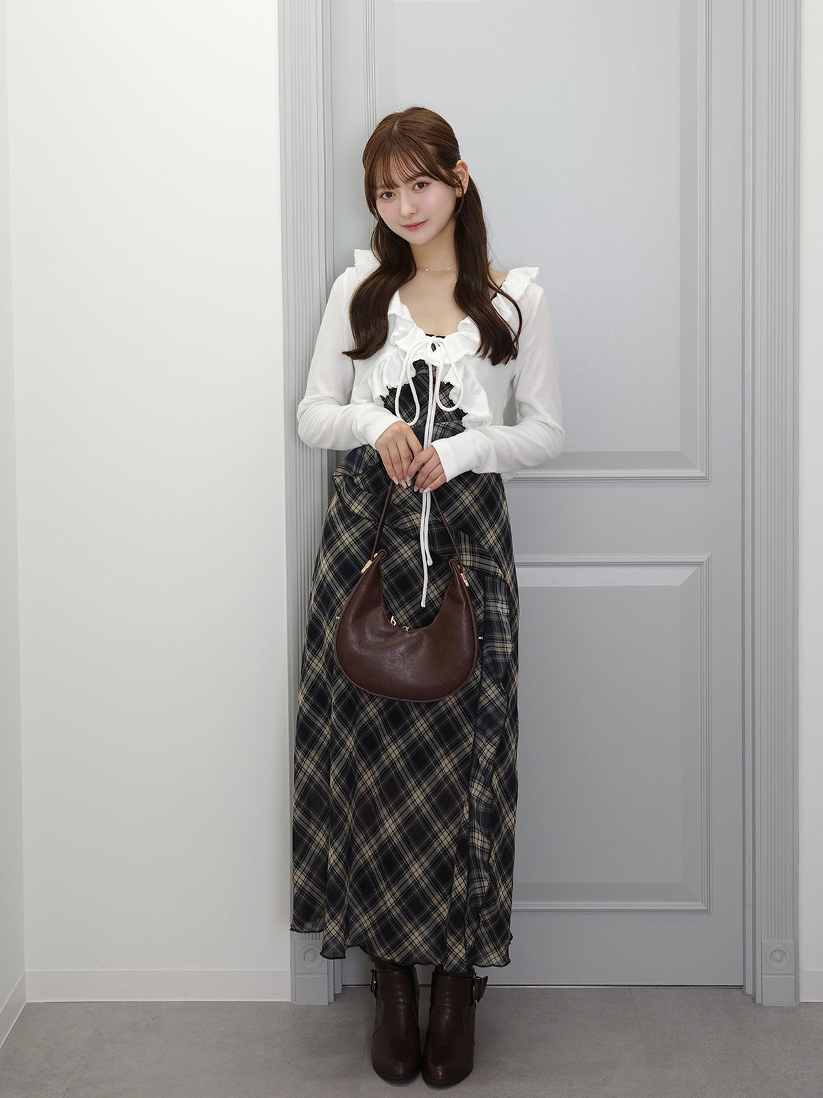 カーディガンはフロントのリボンで留めるデザインで、さりげないアクセントを添えます。