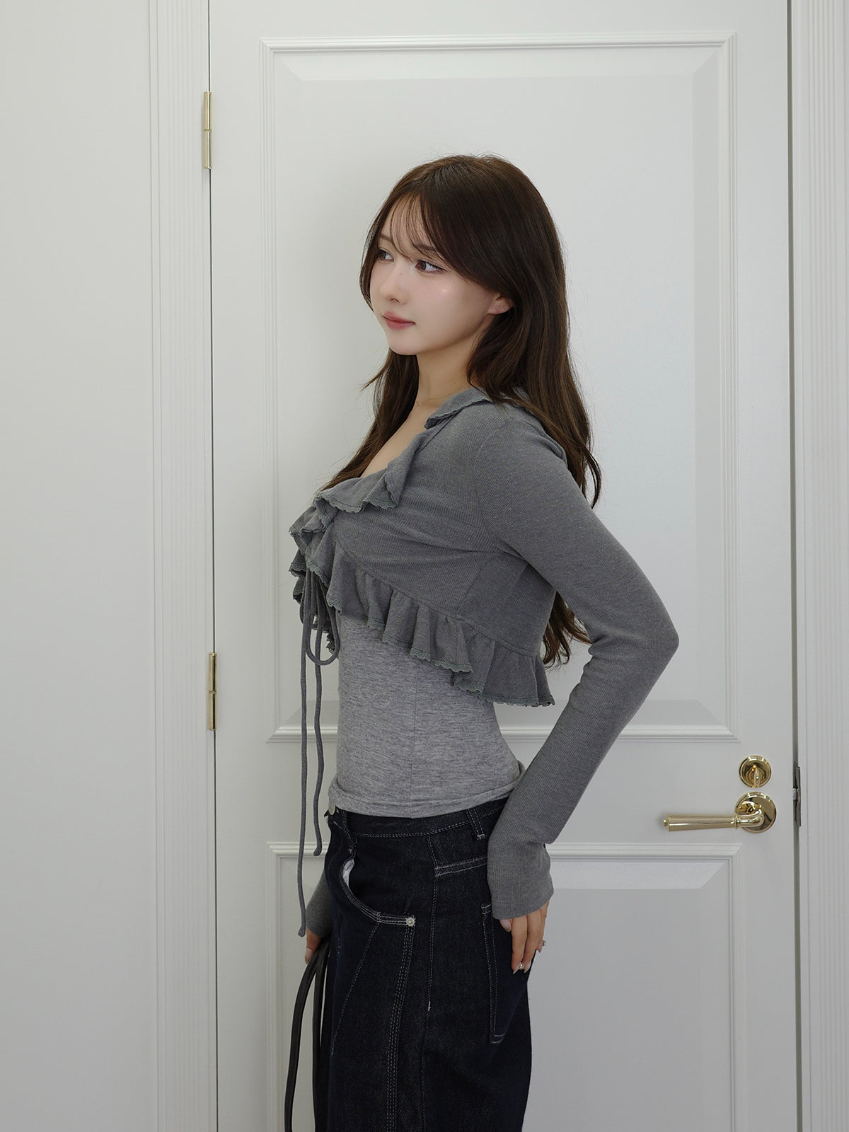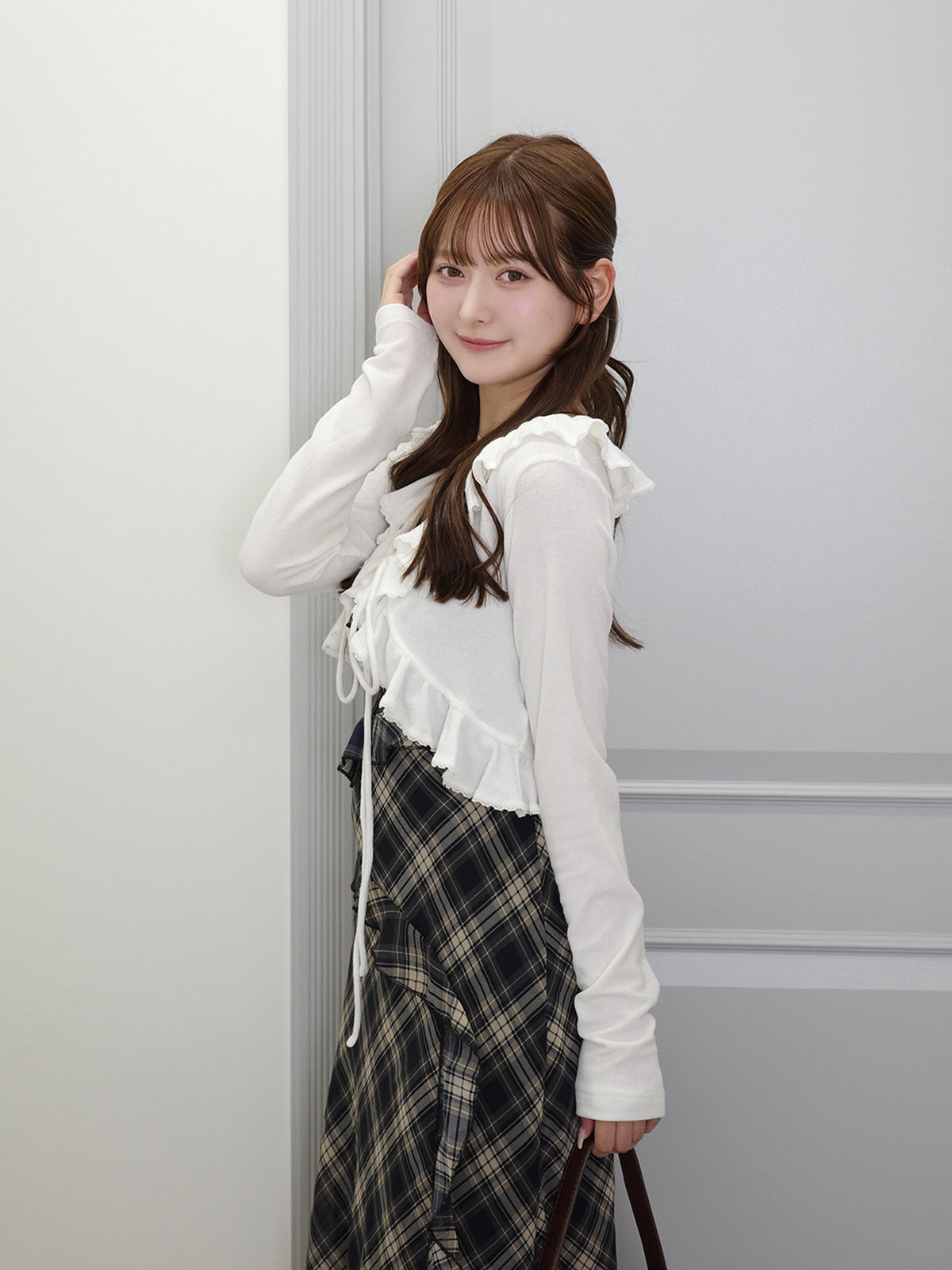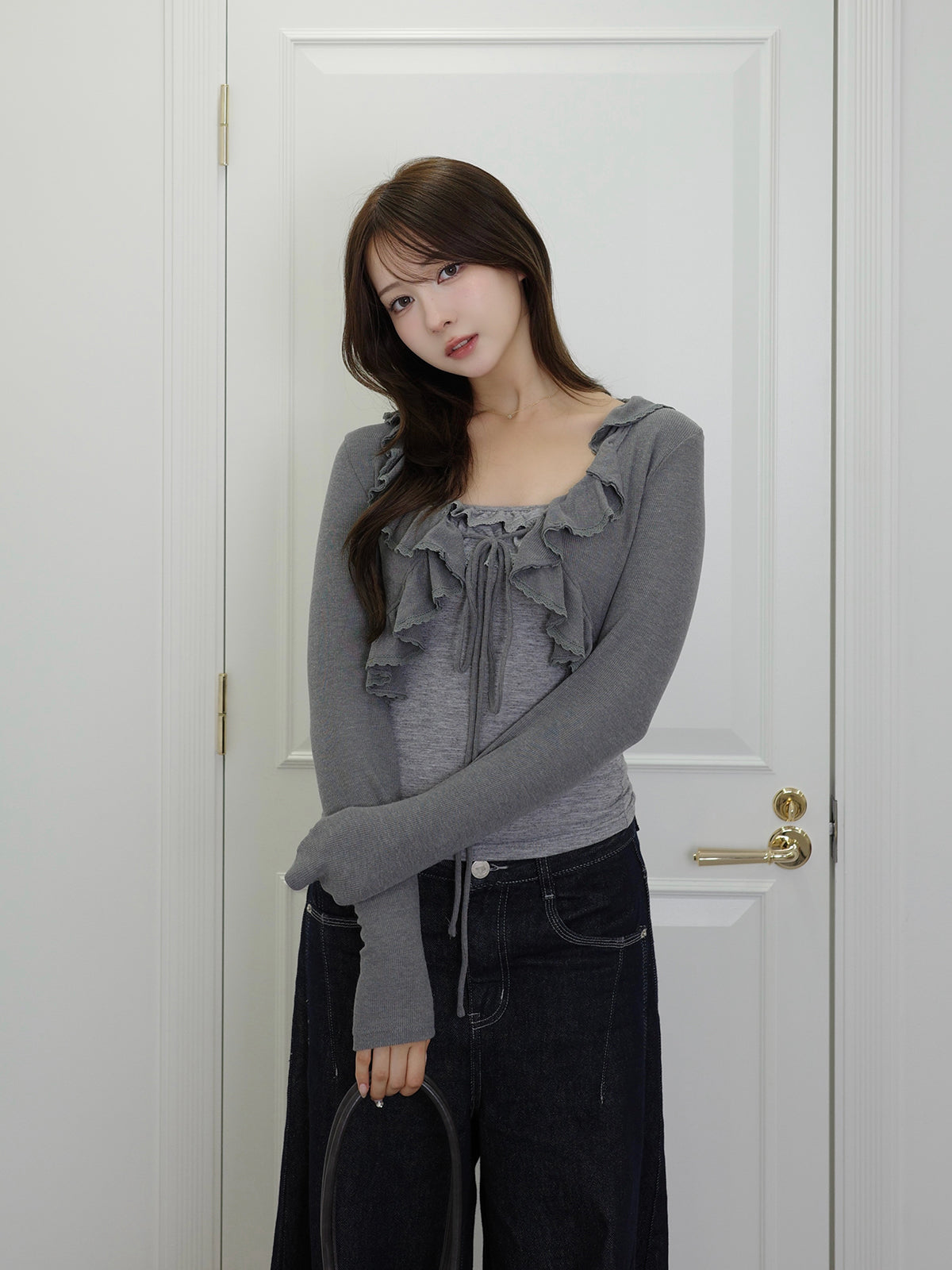 フリルを贅沢にあしらったキャミソールとカーディガンのセットアップ。