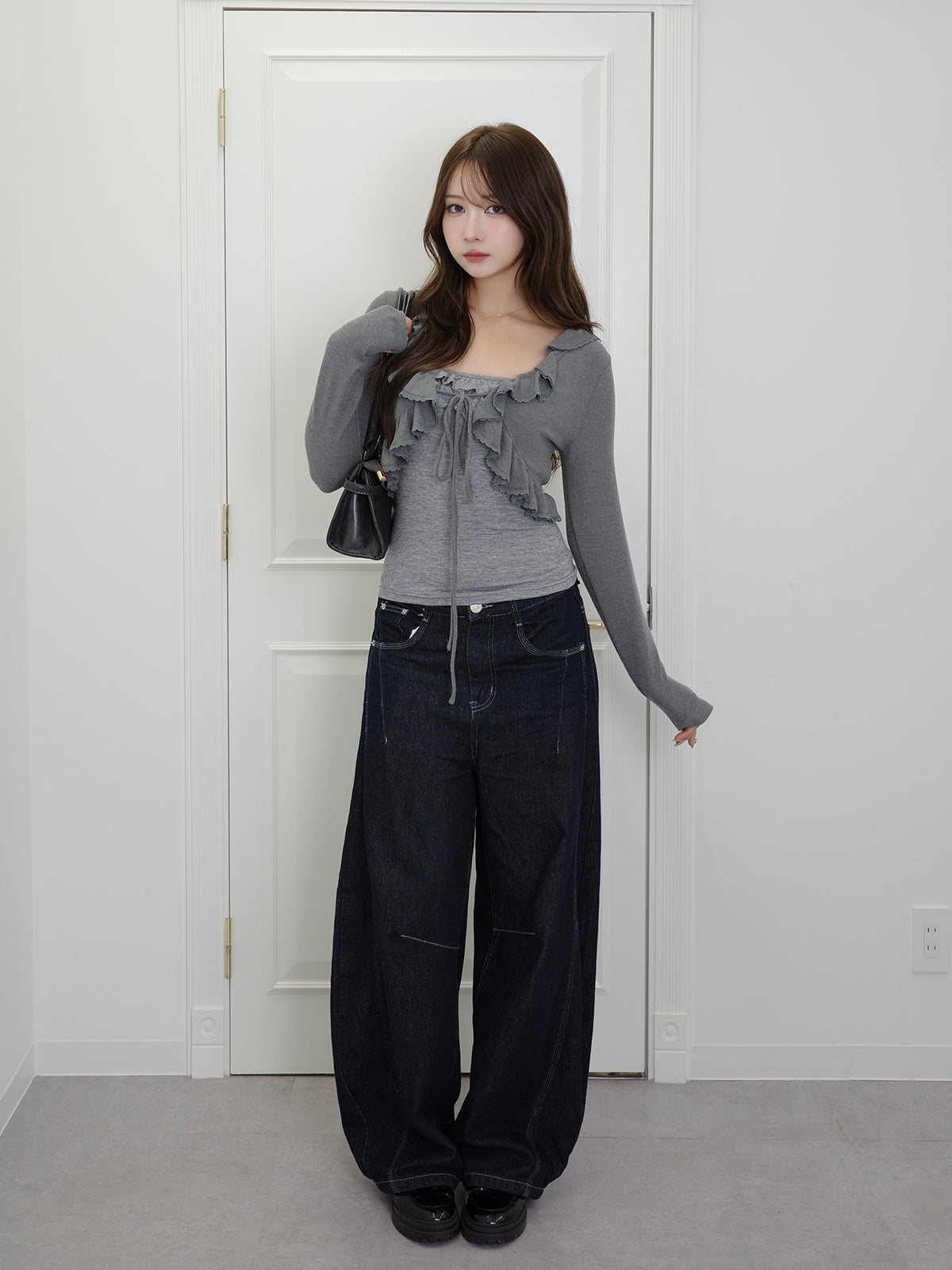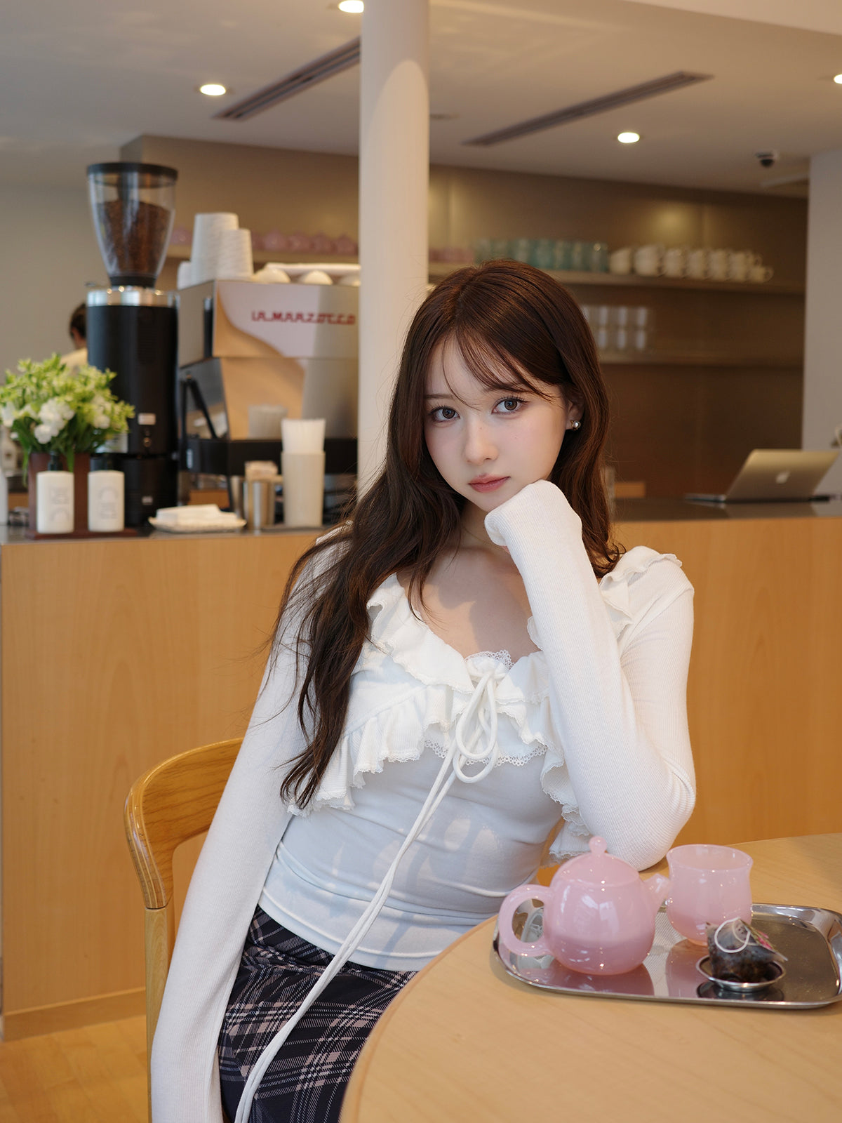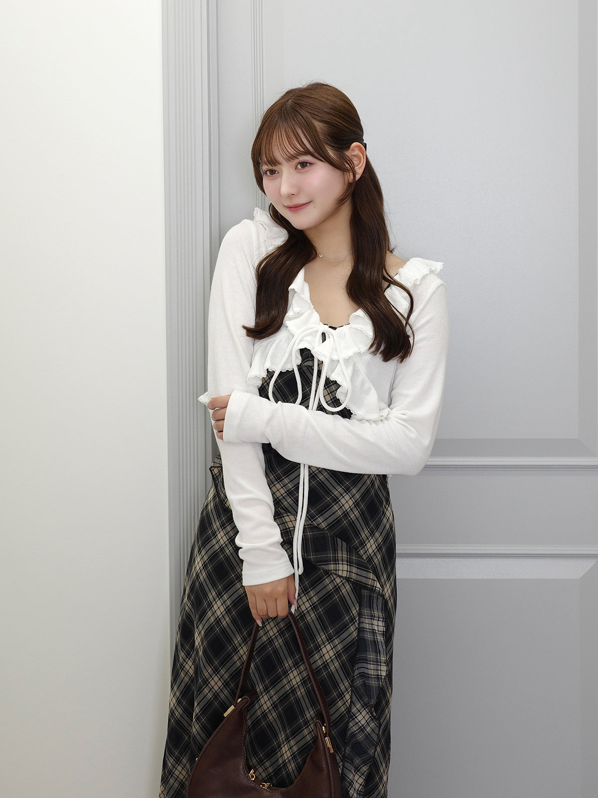 フリルを贅沢にあしらったキャミソールとカーディガンのセットアップ。