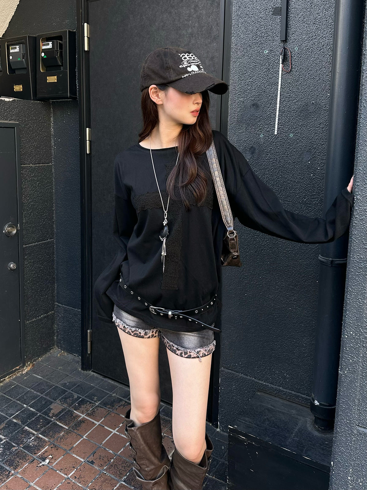 フロントにあしらったフラワーレースのクロスデザインが目を惹くロングスリーブTシャツ。