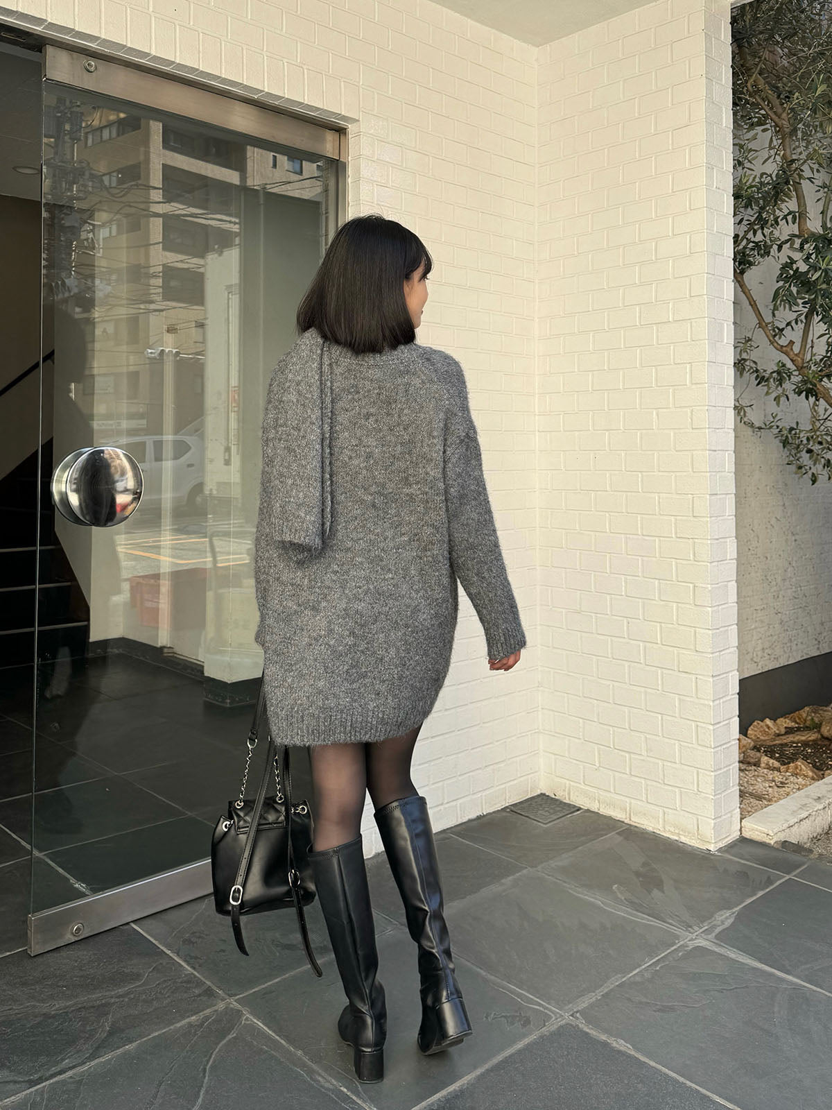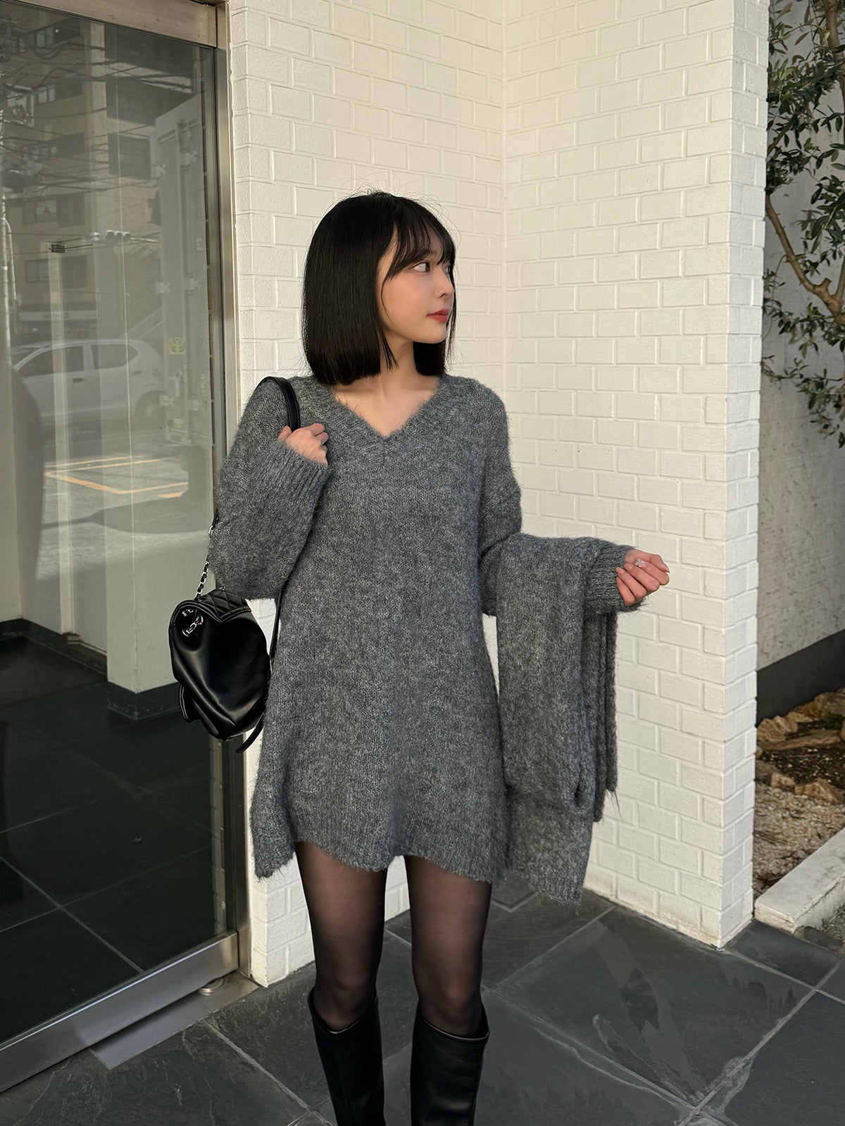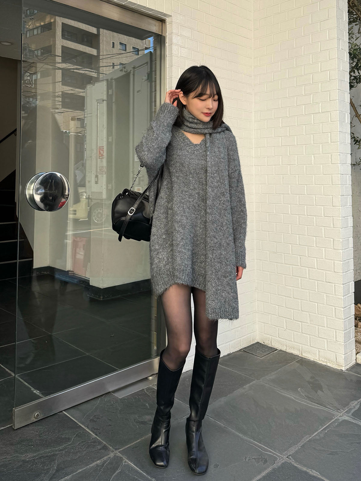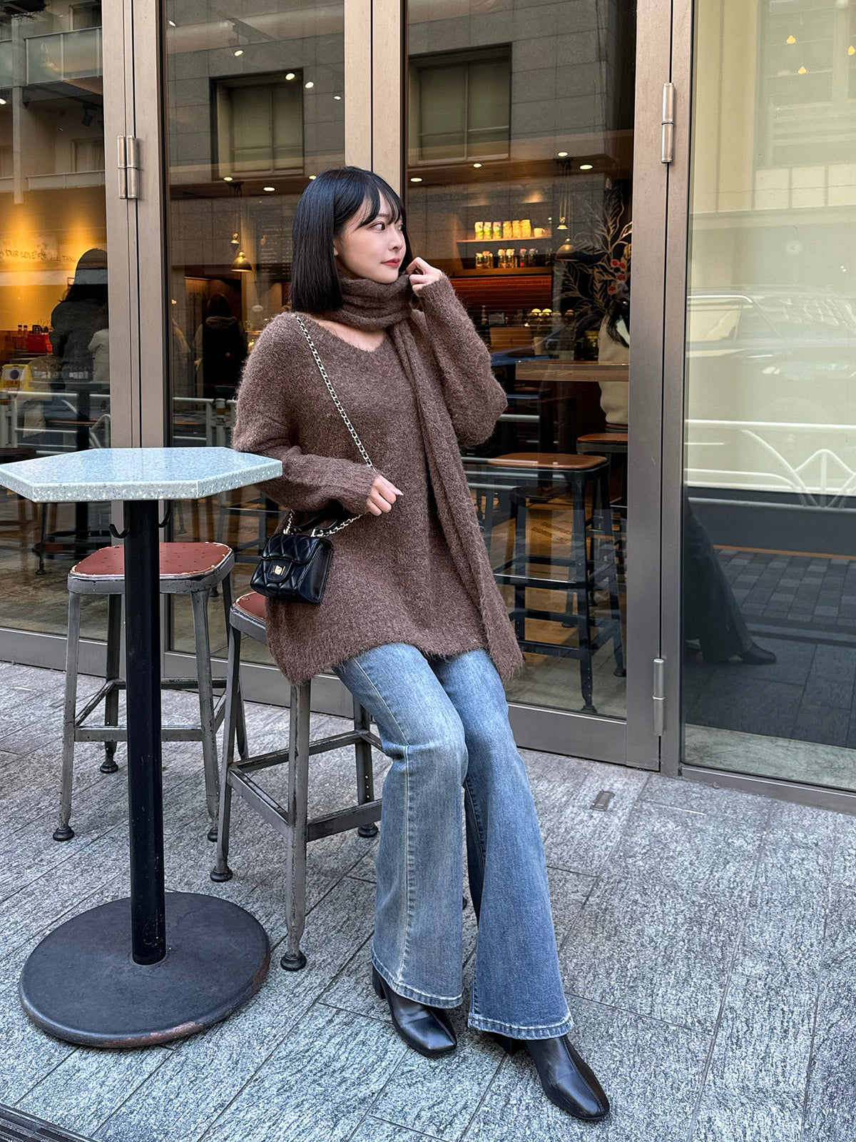 This item comes as a set of a V-neck sweater and scarf made from brushed knit material.