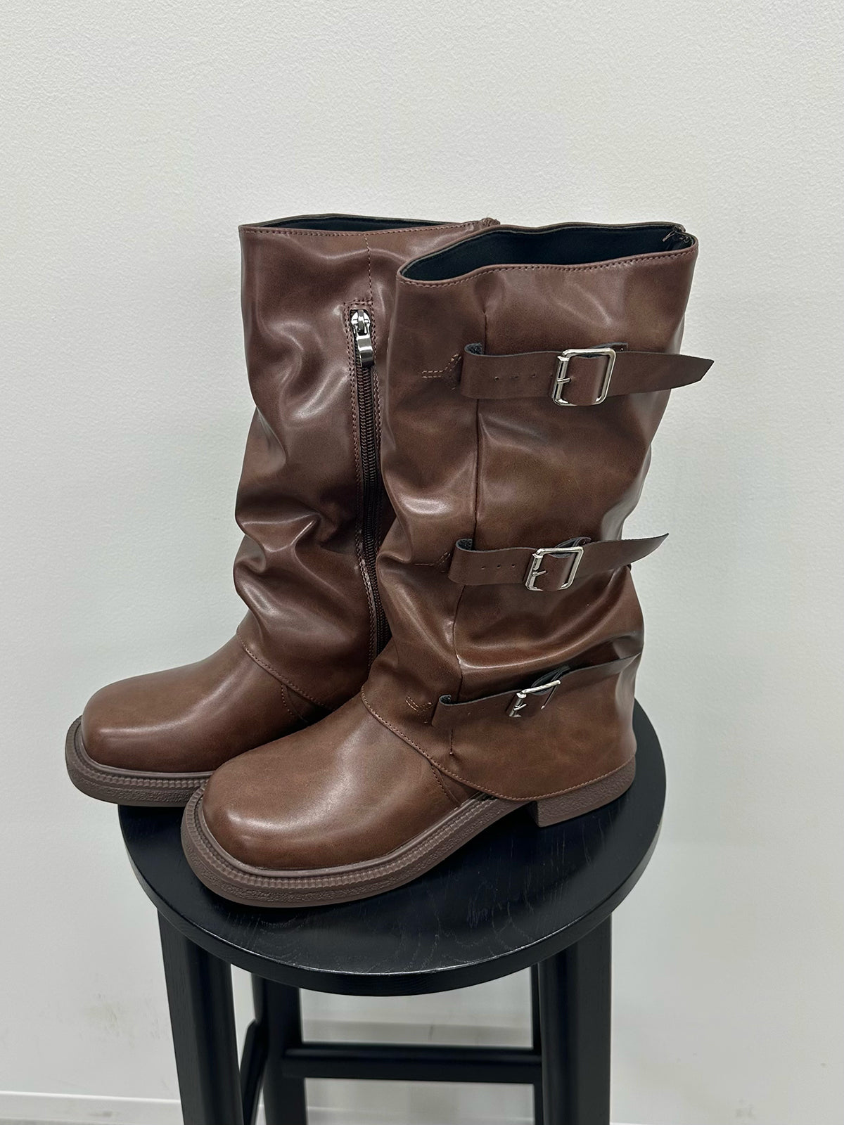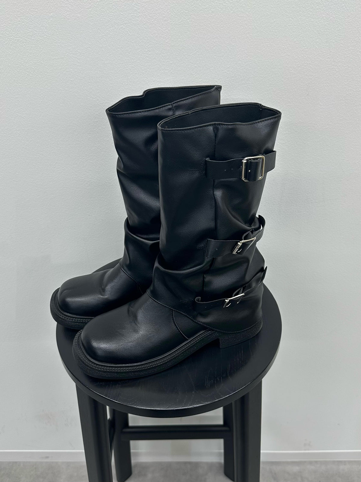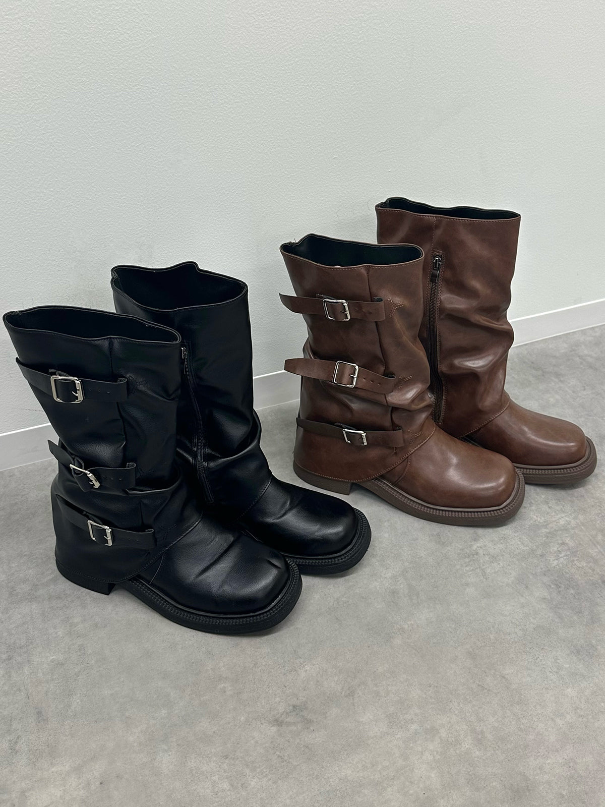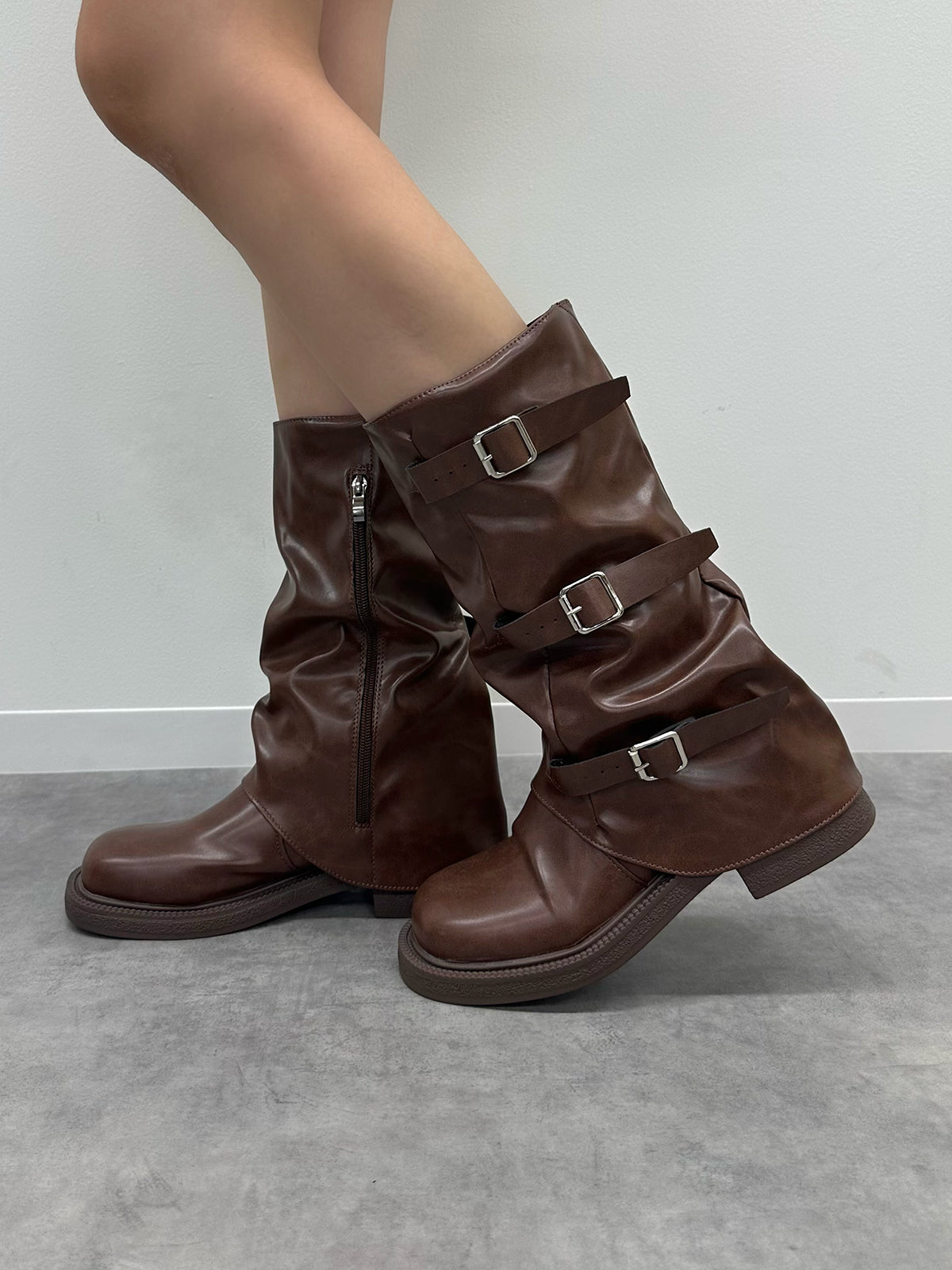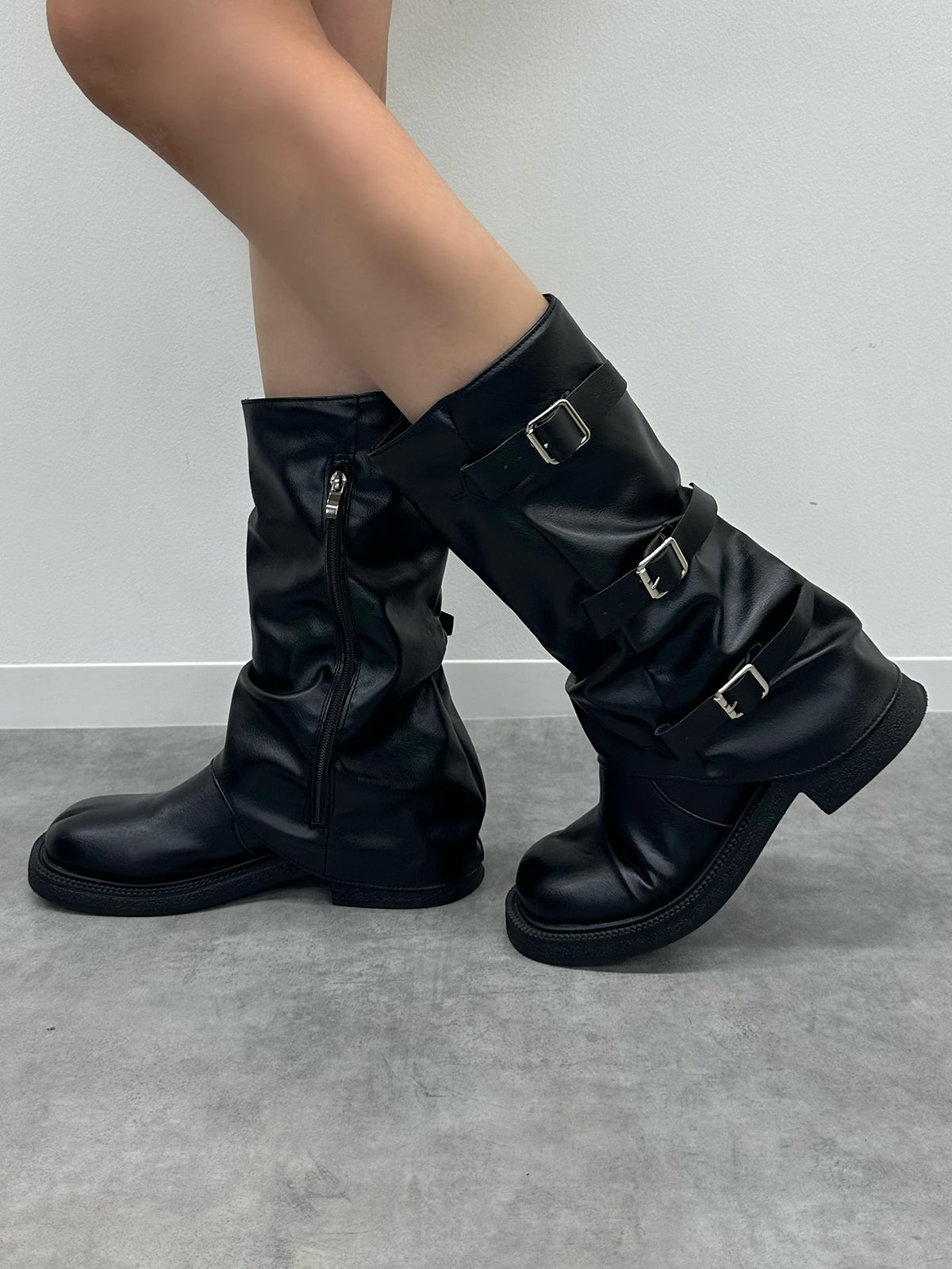 サイドに3つのベルトをあしらったトレンド感たっぷりのミドルカバーブーツ。