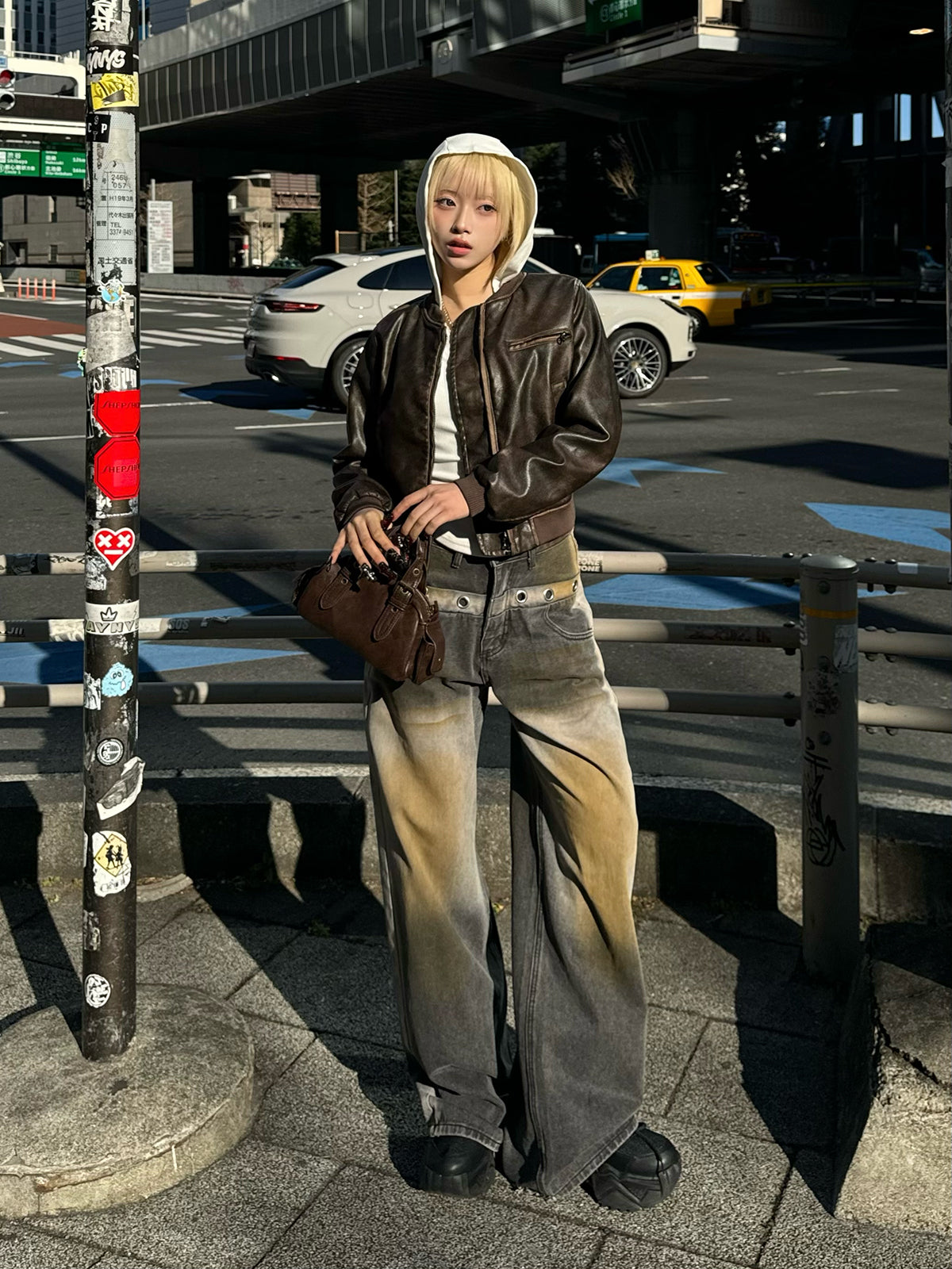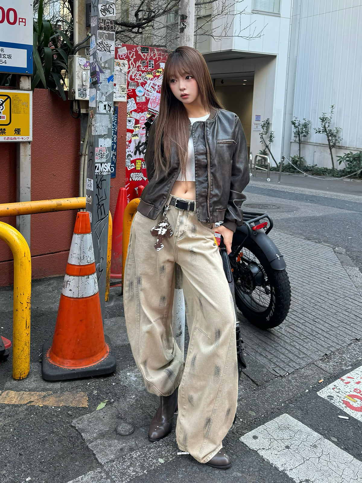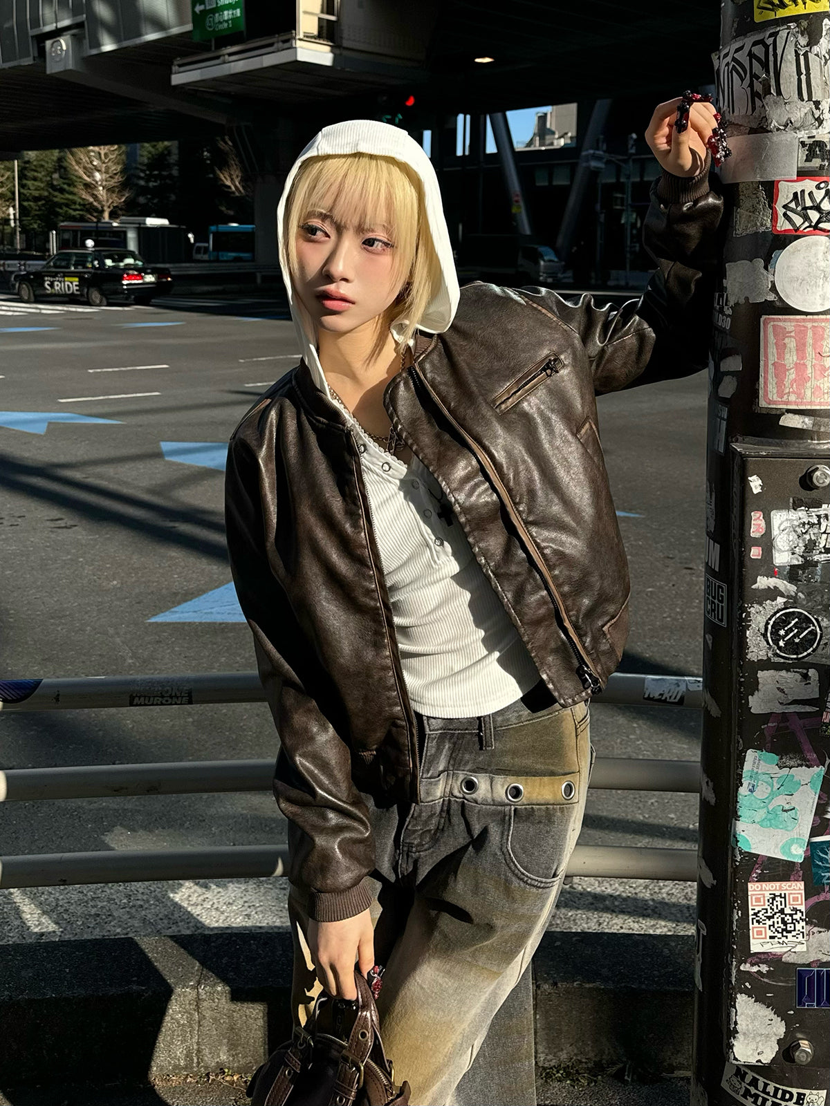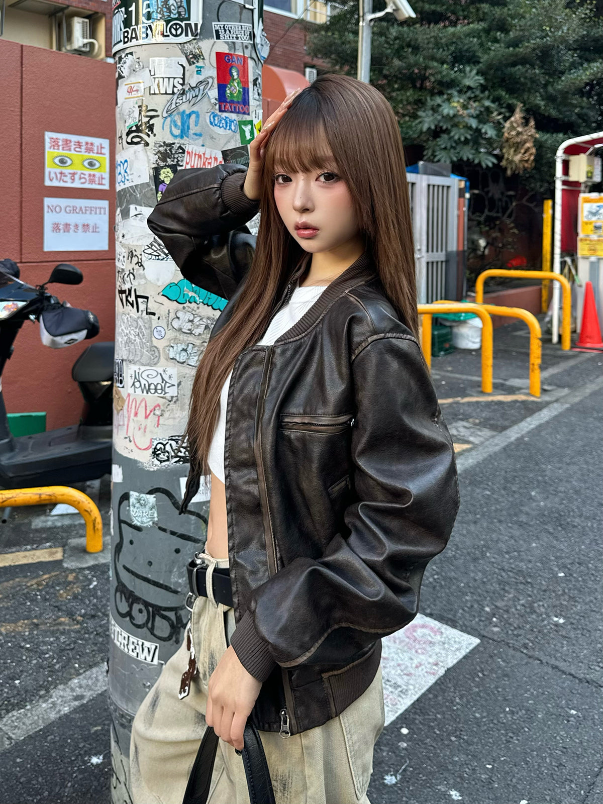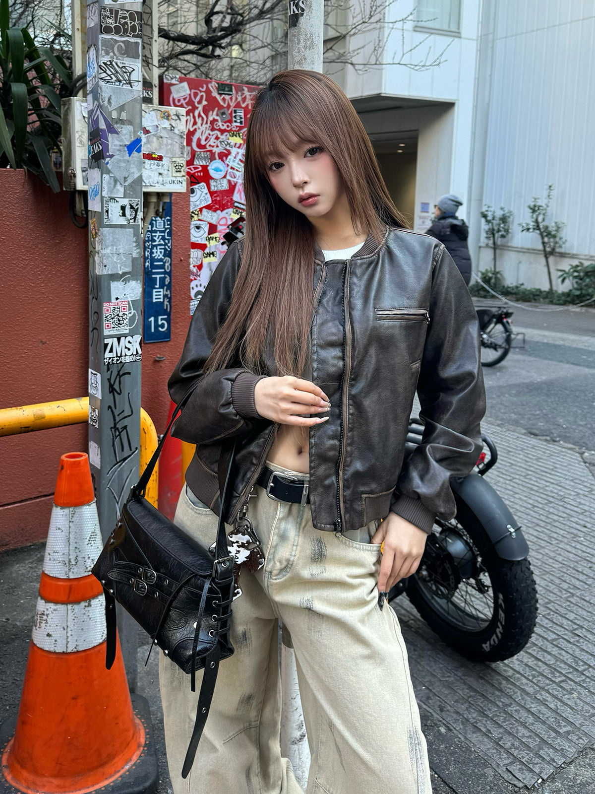 洗いをかけたようなレザータッチ素材で、こなれたヴィンテージムードを演出。