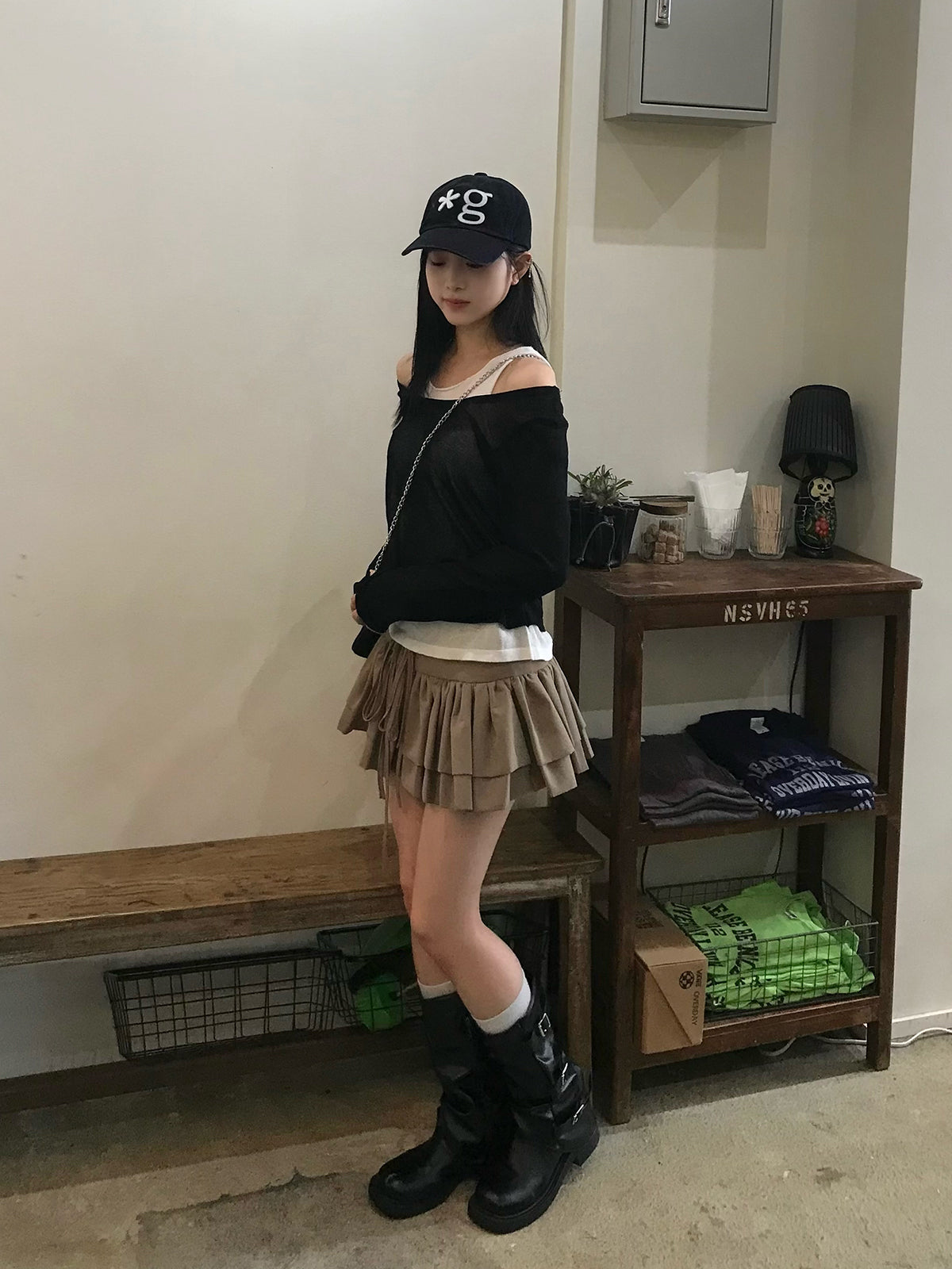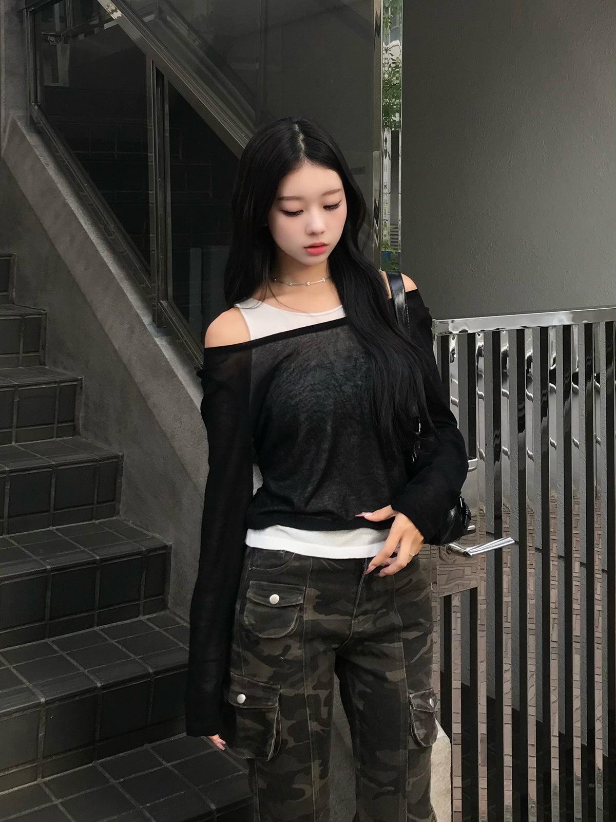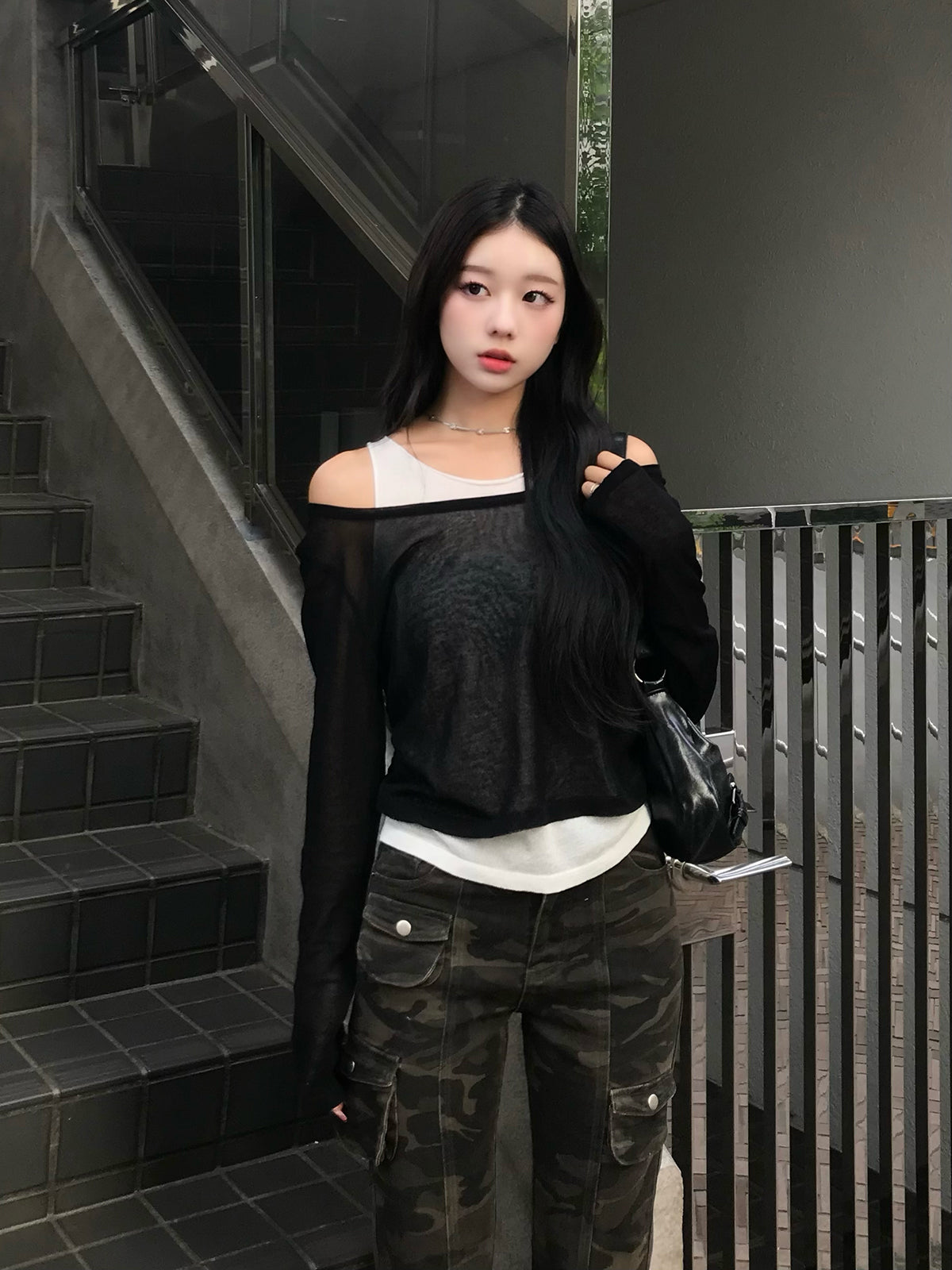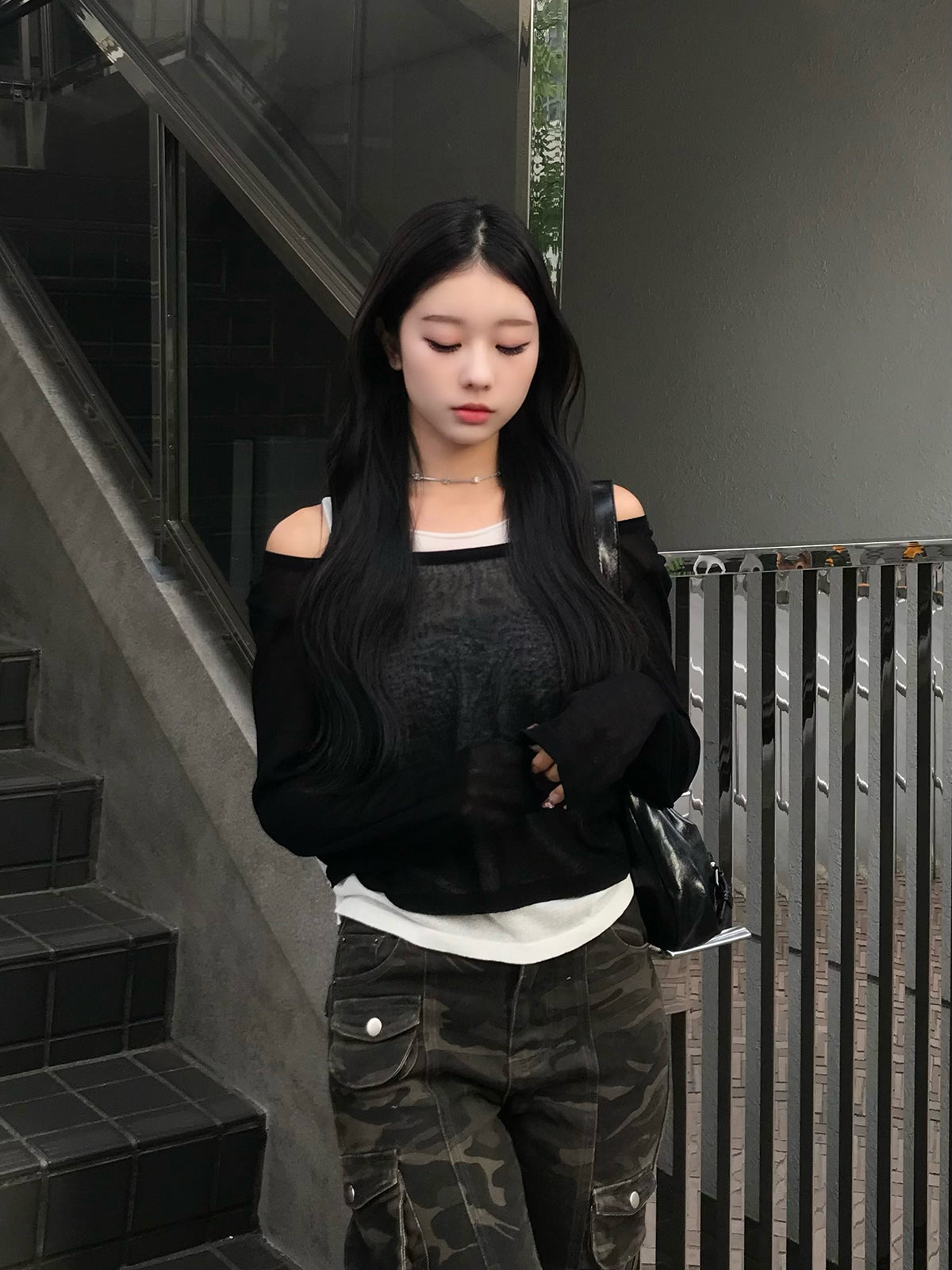 肩の肌見せデザインが抜け感をプラスし、シンプルながらスタイリングの主役になる存在感。