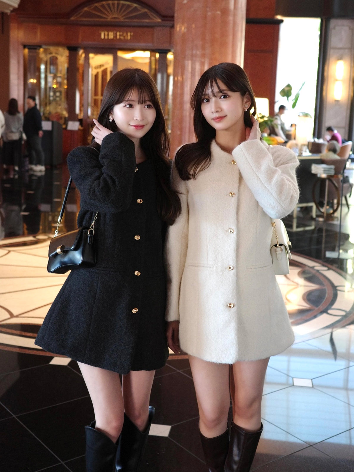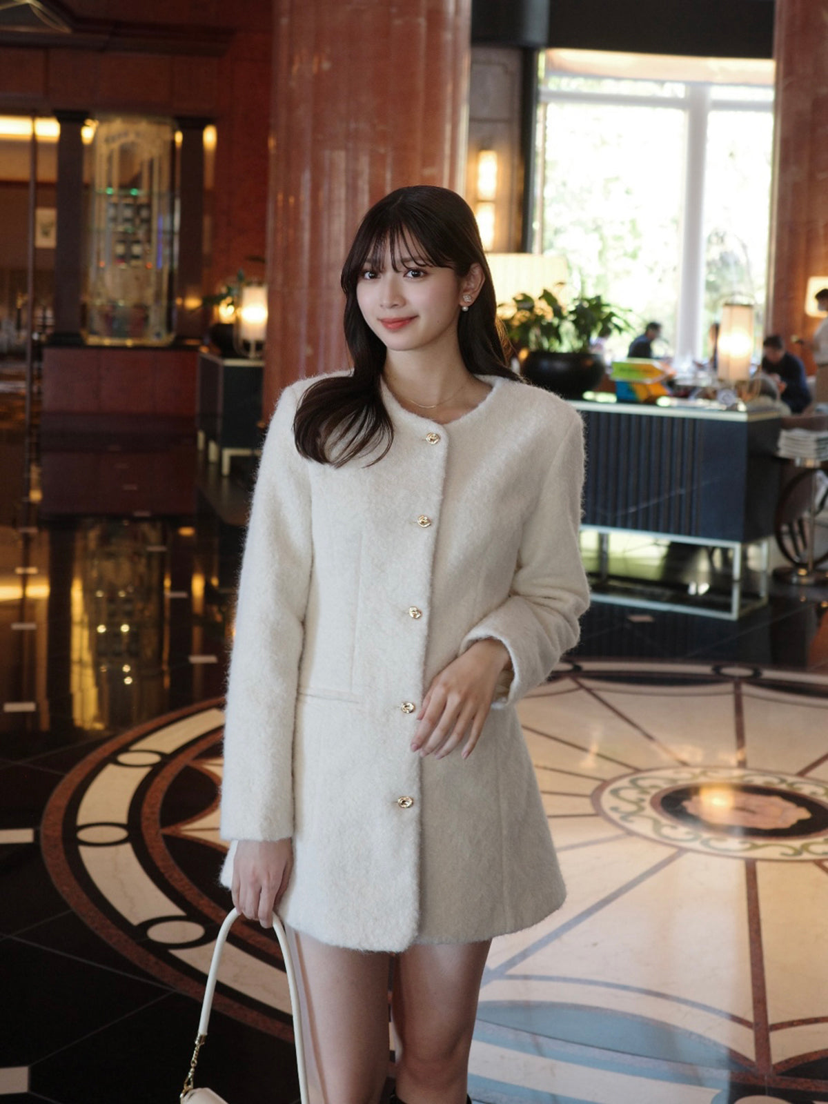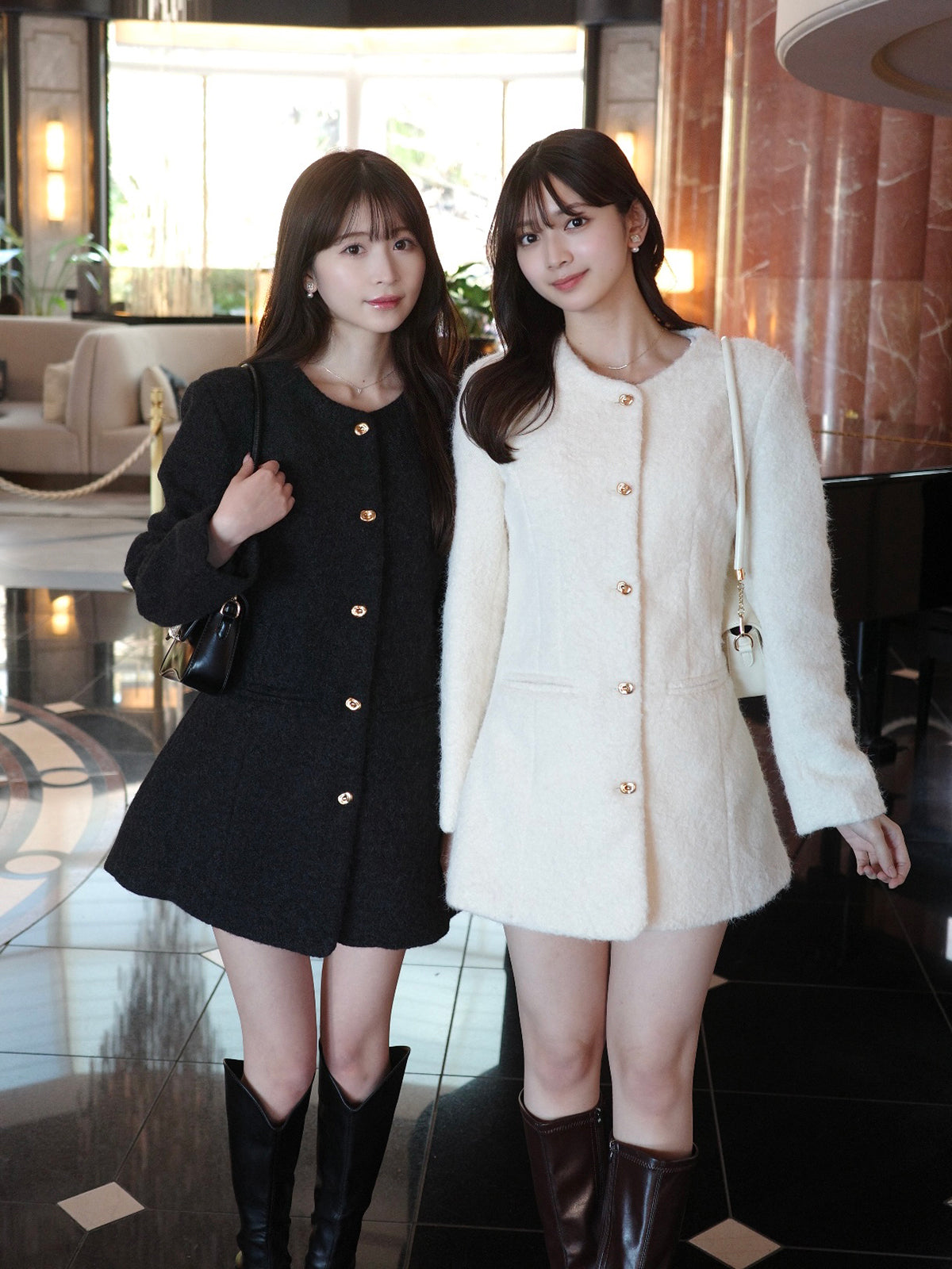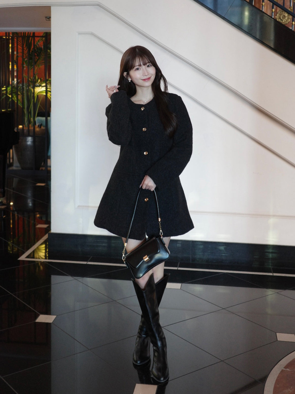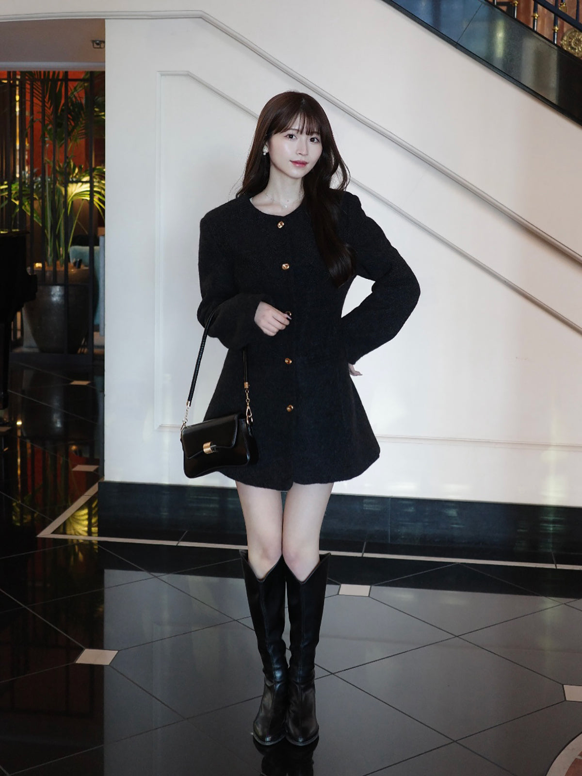 ニュアンス感のあるゴールドボタンが華やかさを添え、シンプルながら上品な印象のミドルコート。