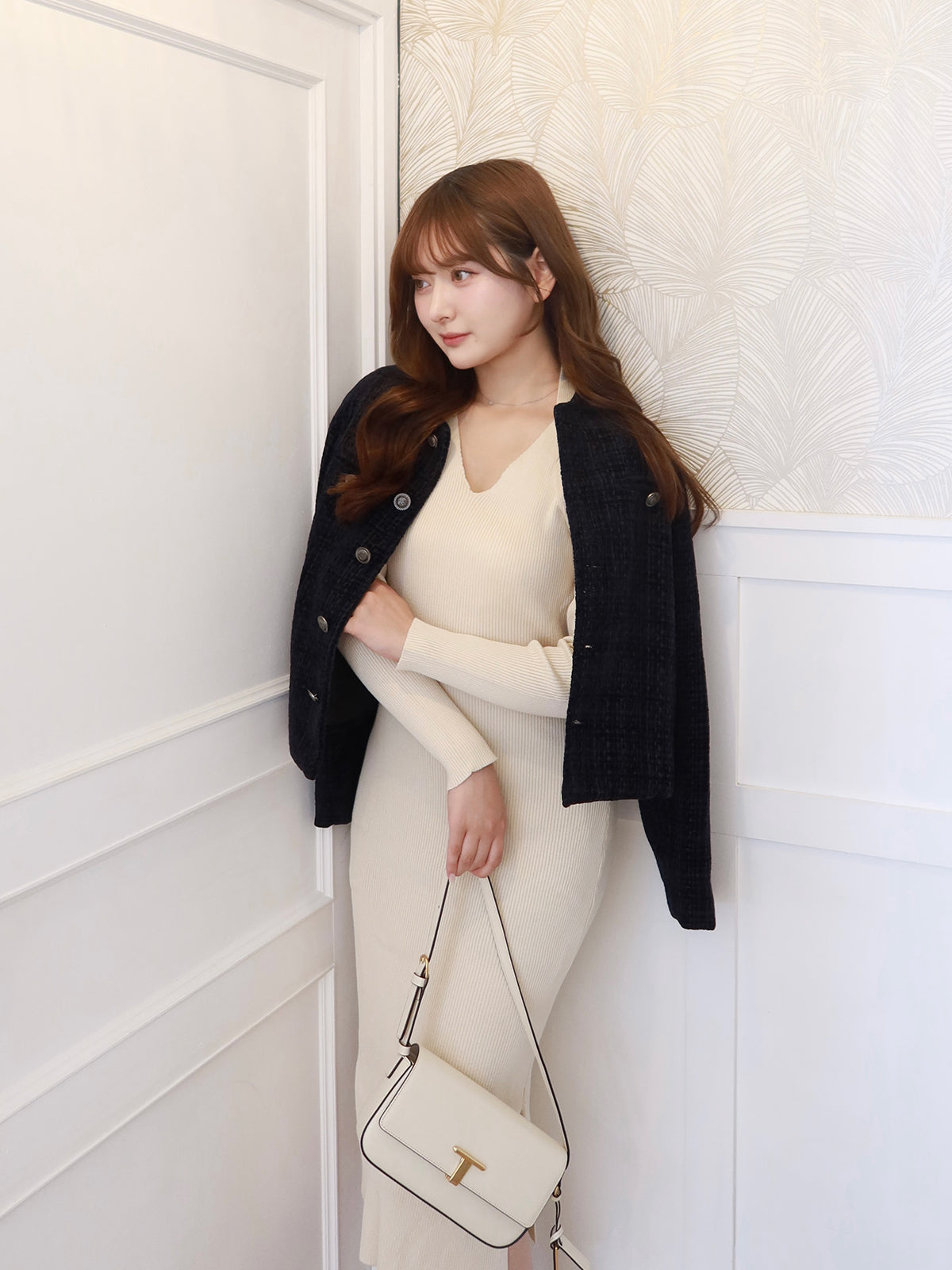 フィット感のあるリブ素材が女性らしさを引き立てる一枚。