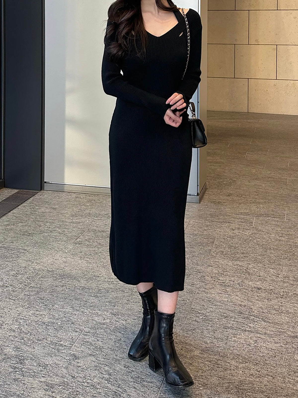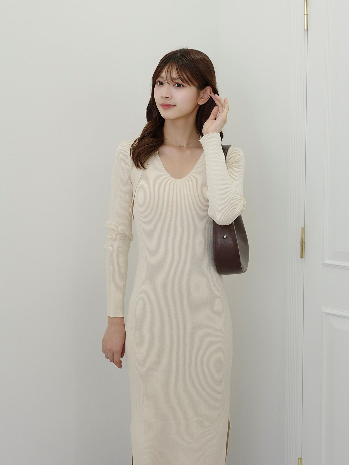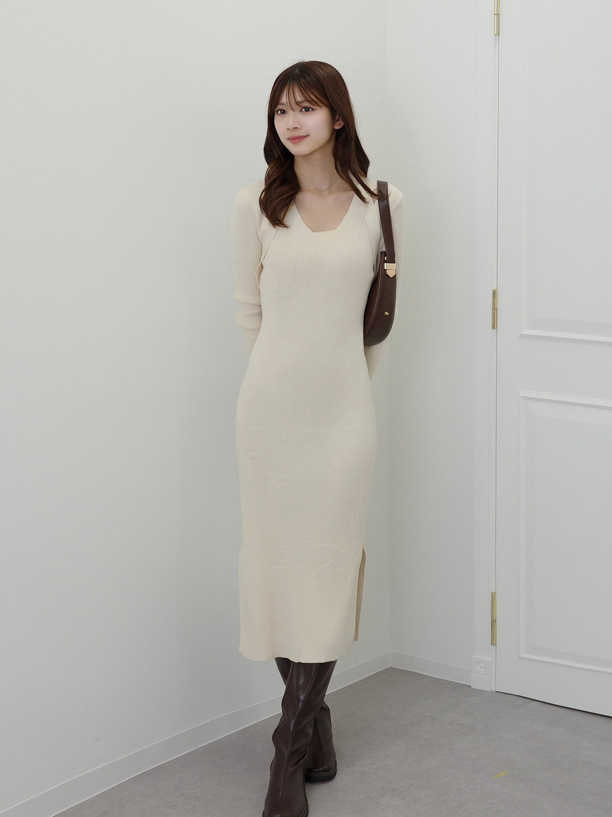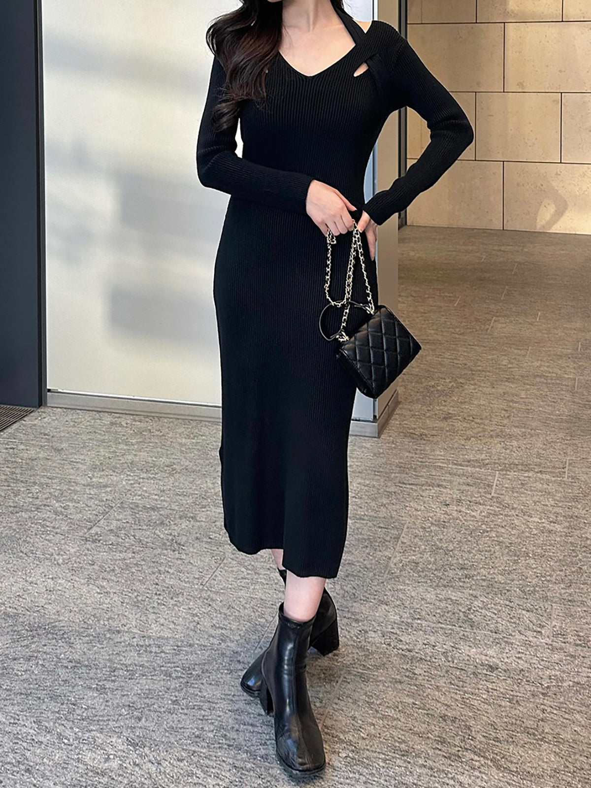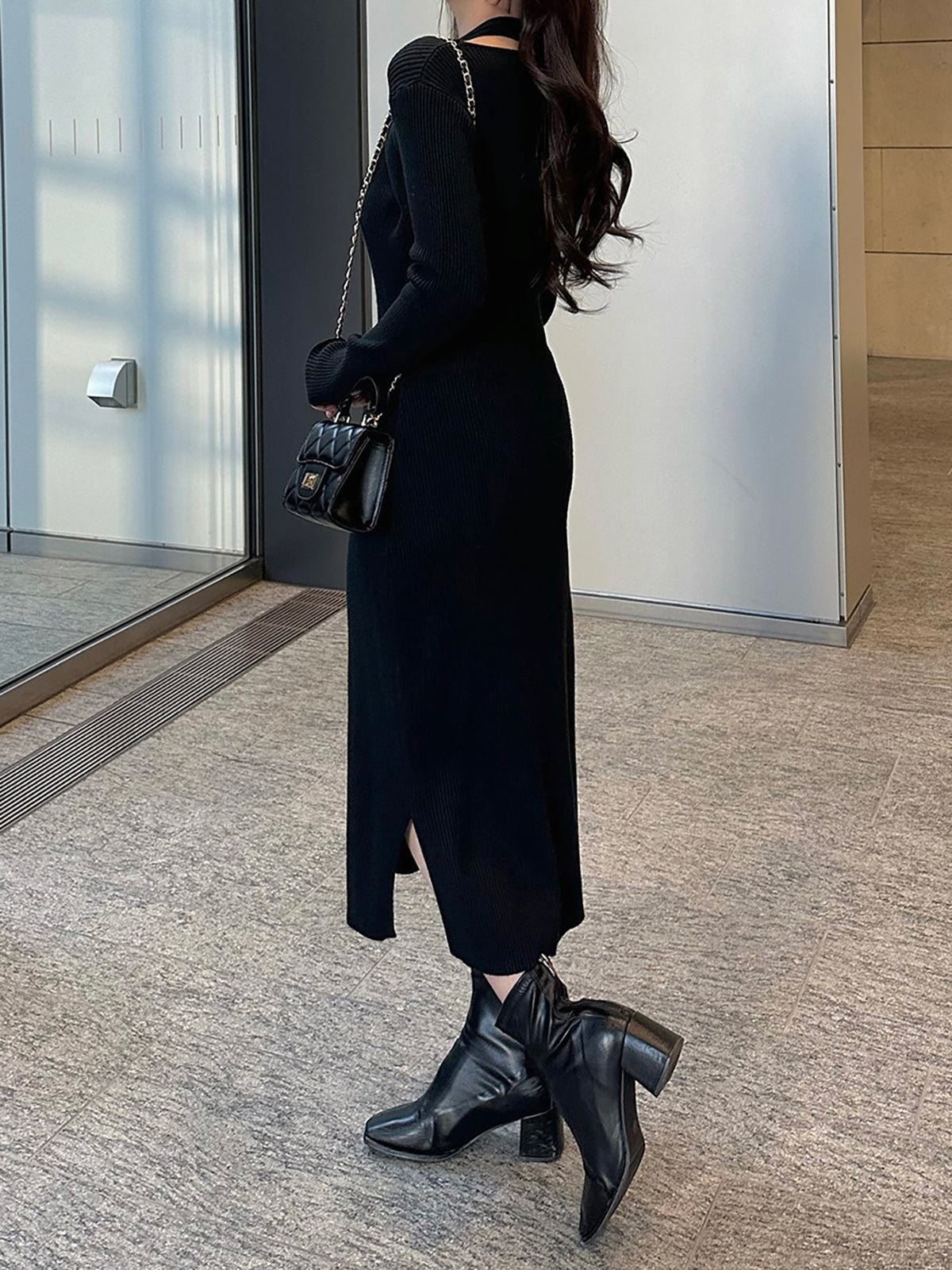 ホルターネックデザインがポイントのニットワンピース。