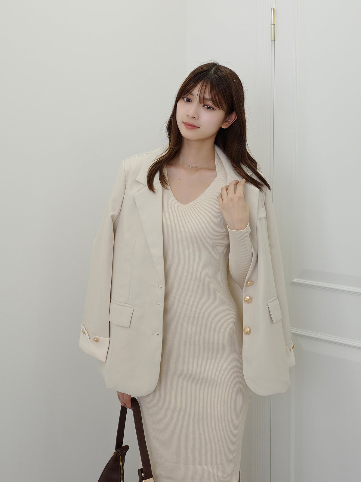 首元のホルターネックと広めにあいたネックラインがすっきりとした印象です。