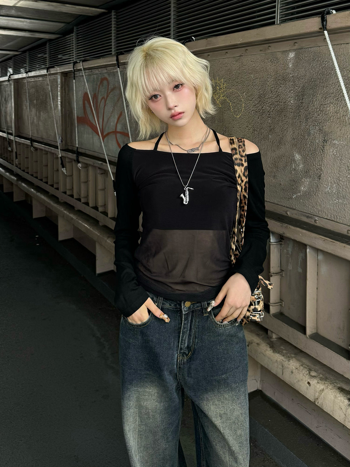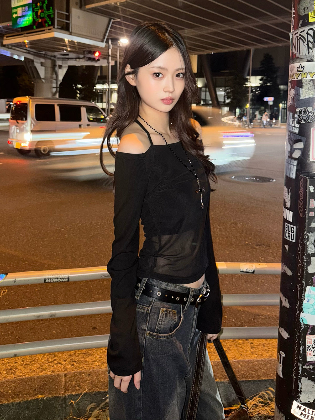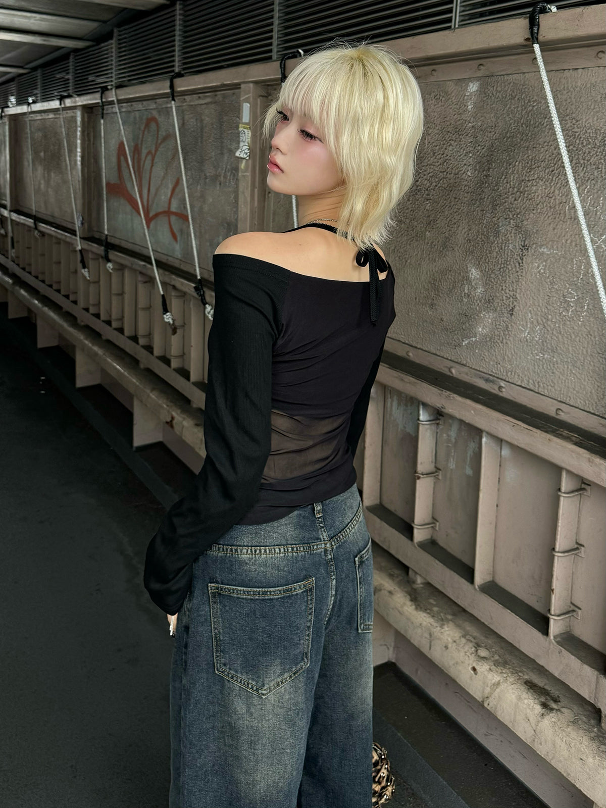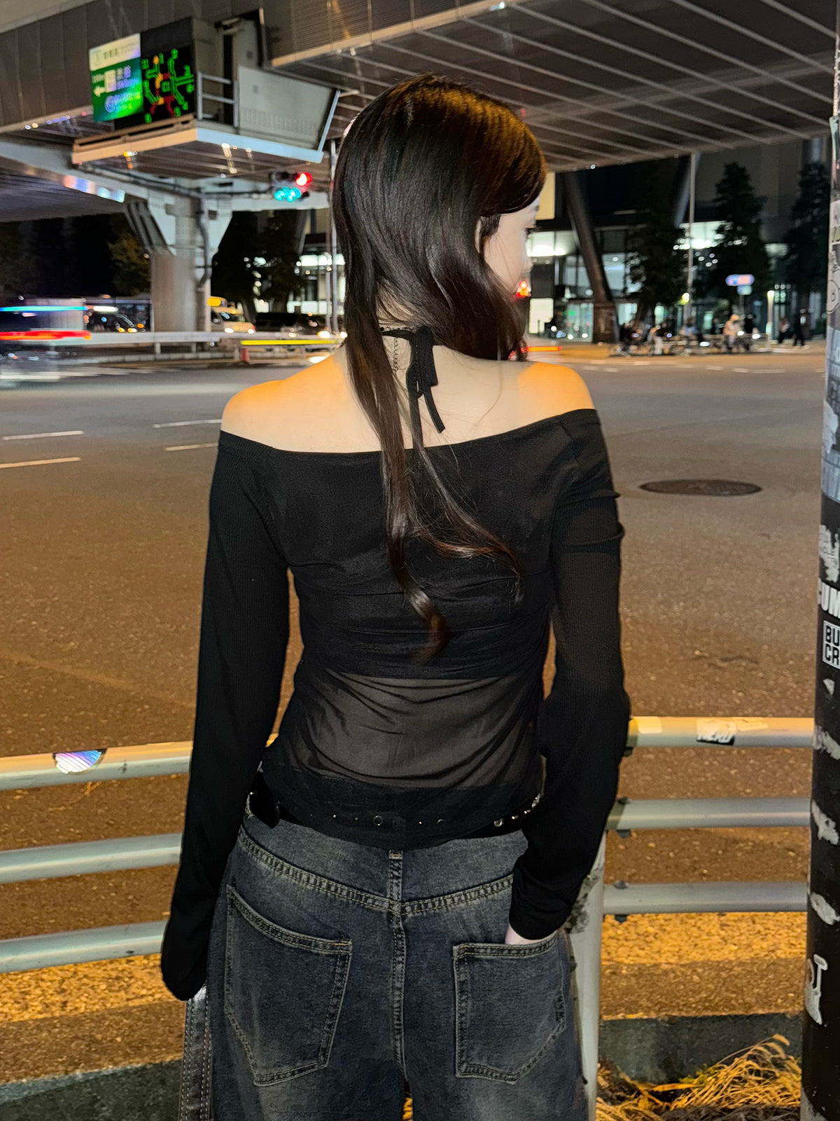 オフショル仕様に華奢なホルターストラップが女性らしさを際立てるトップス。