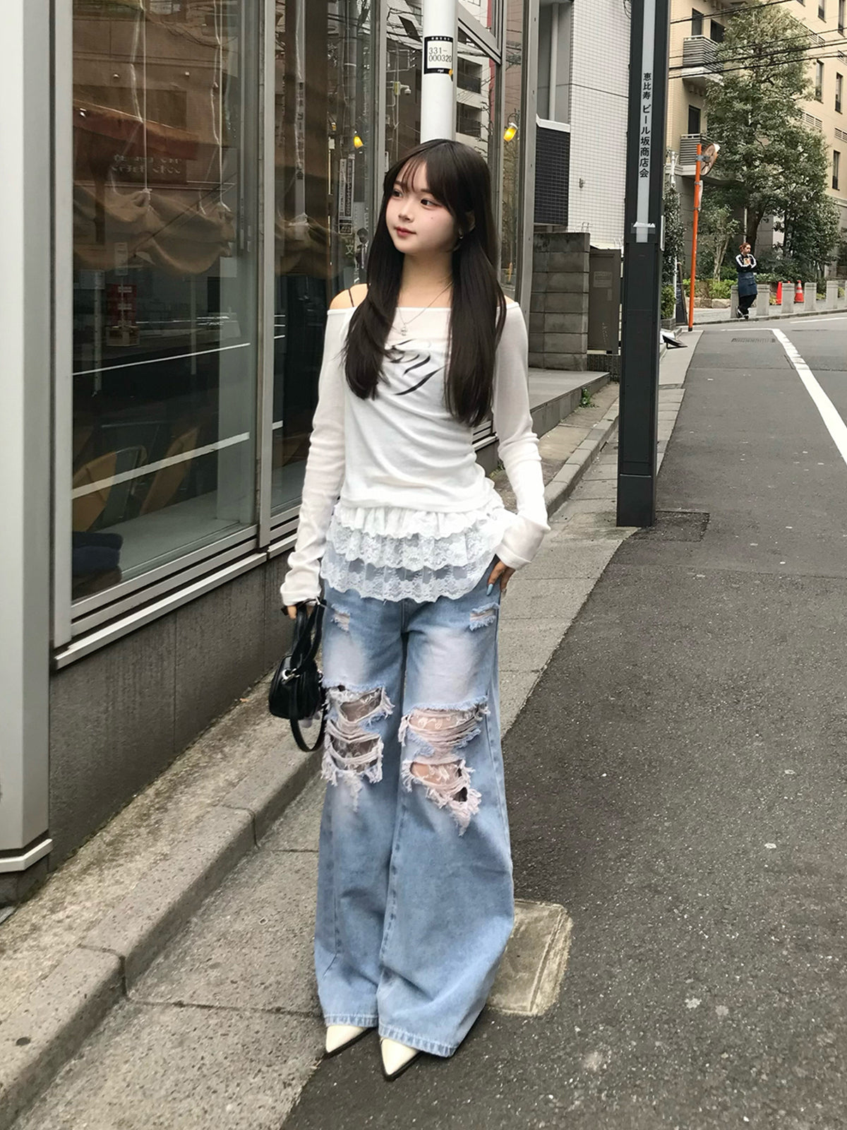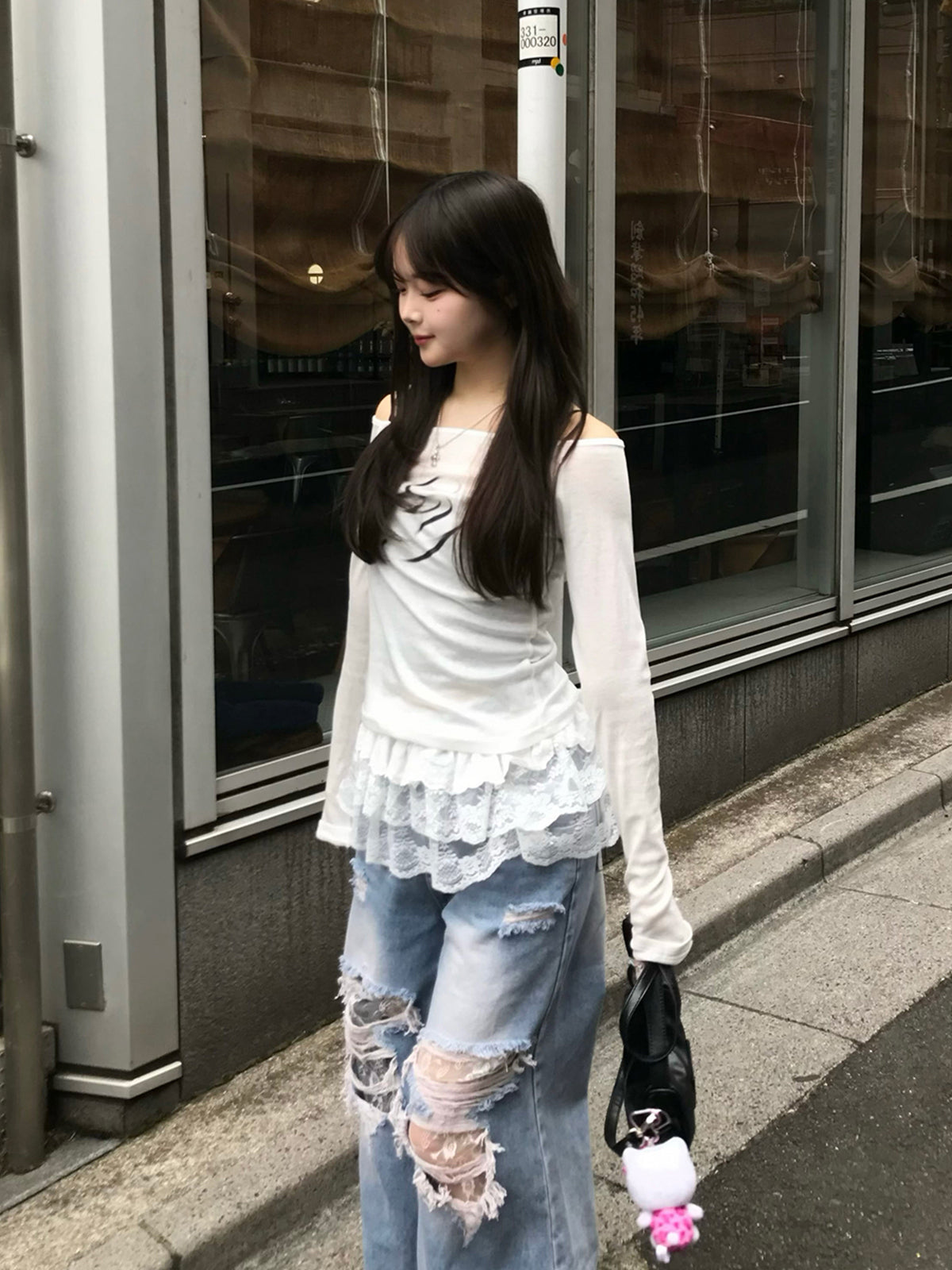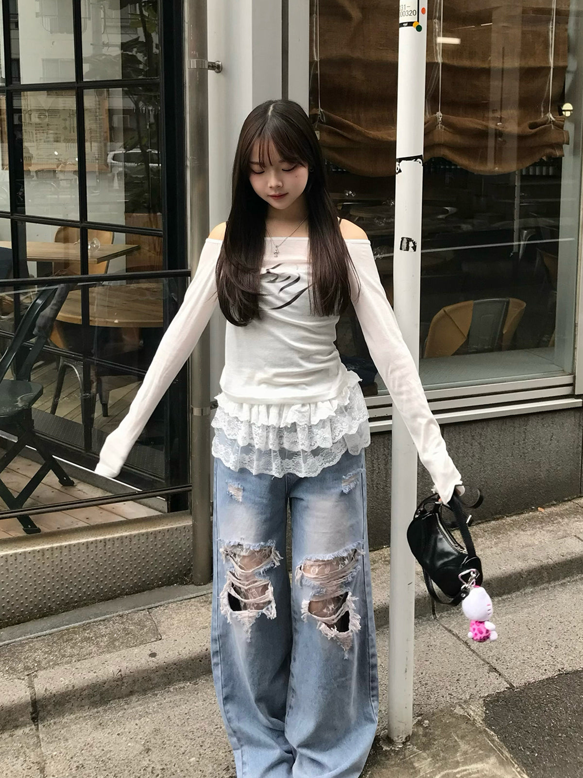 The damaged area features a lace design, soThis is a piece that minimizes skin exposure and is easy to challenge.