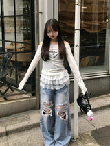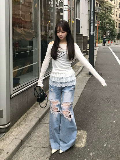 Layered Lace Distressed Denim Pants