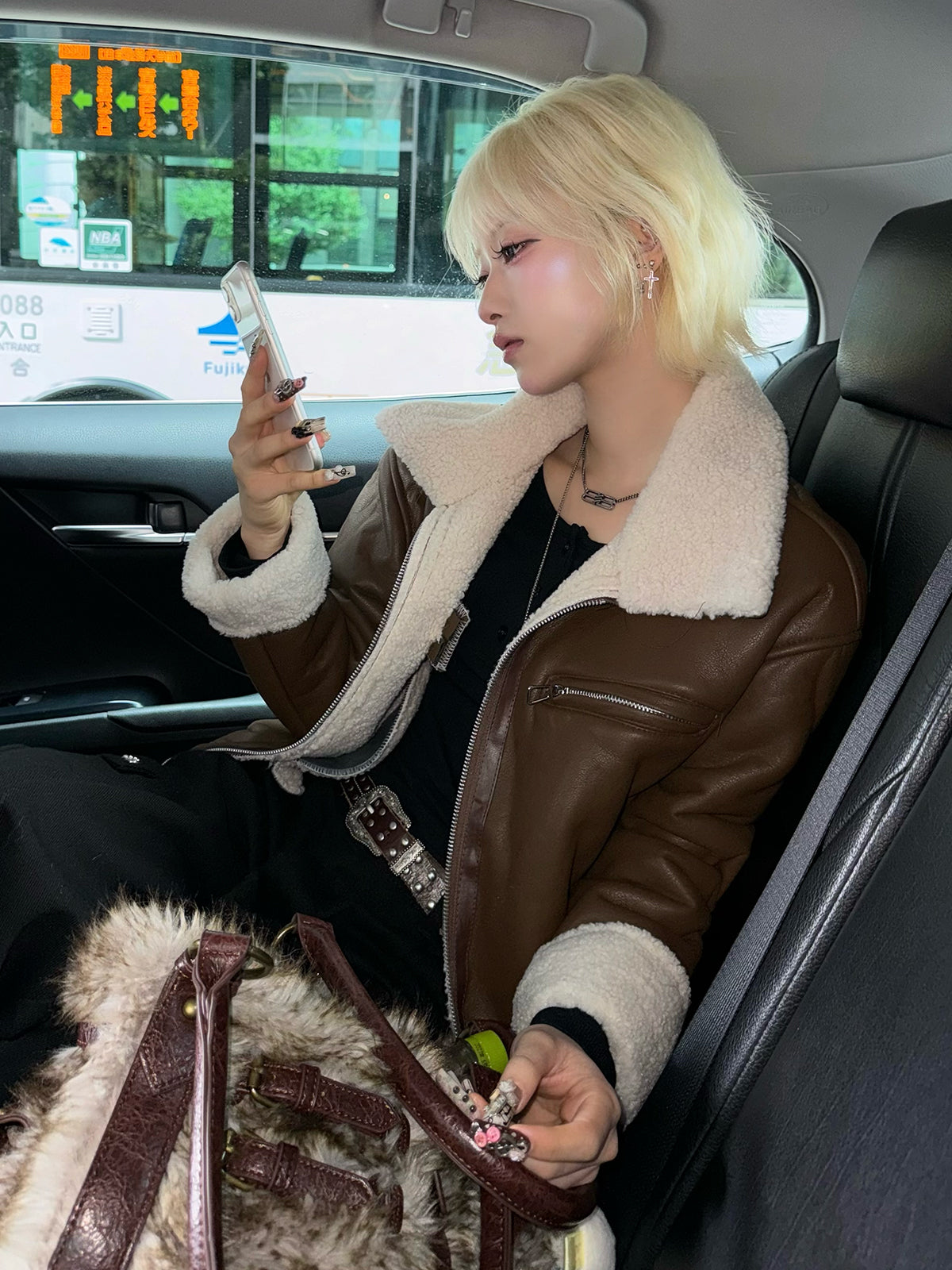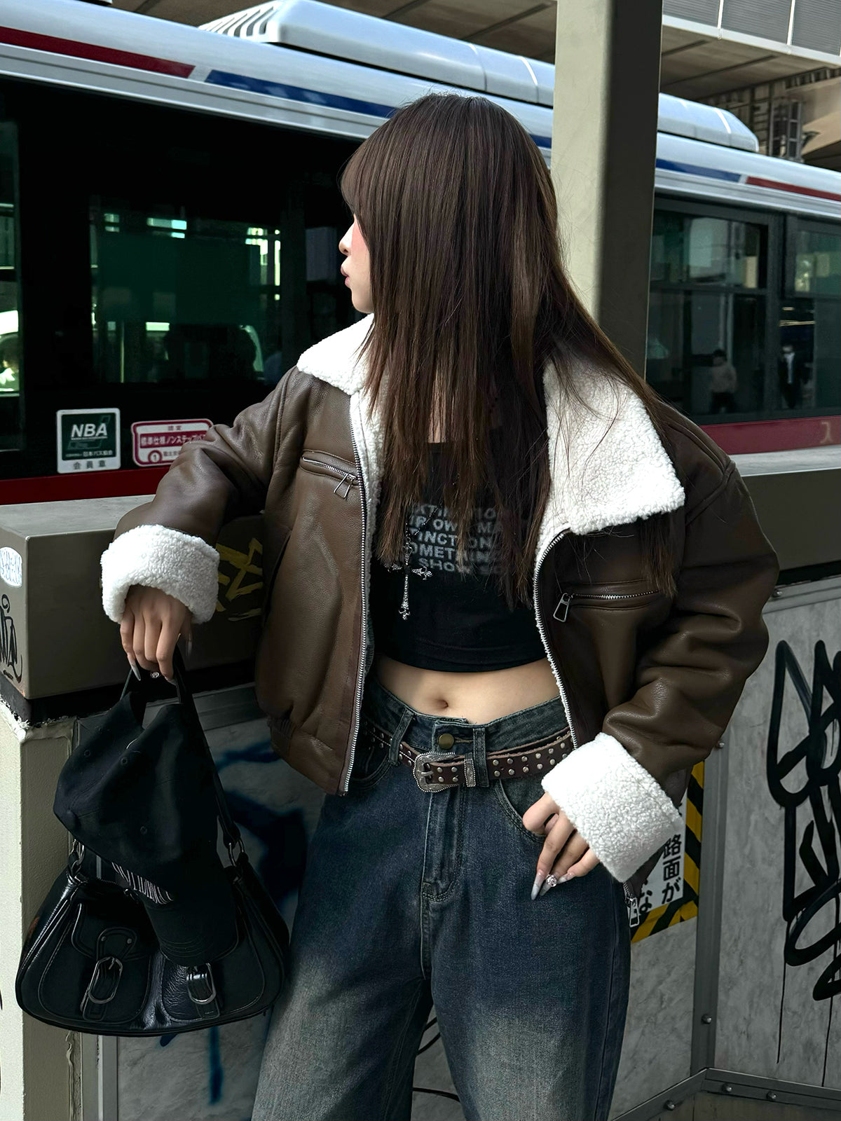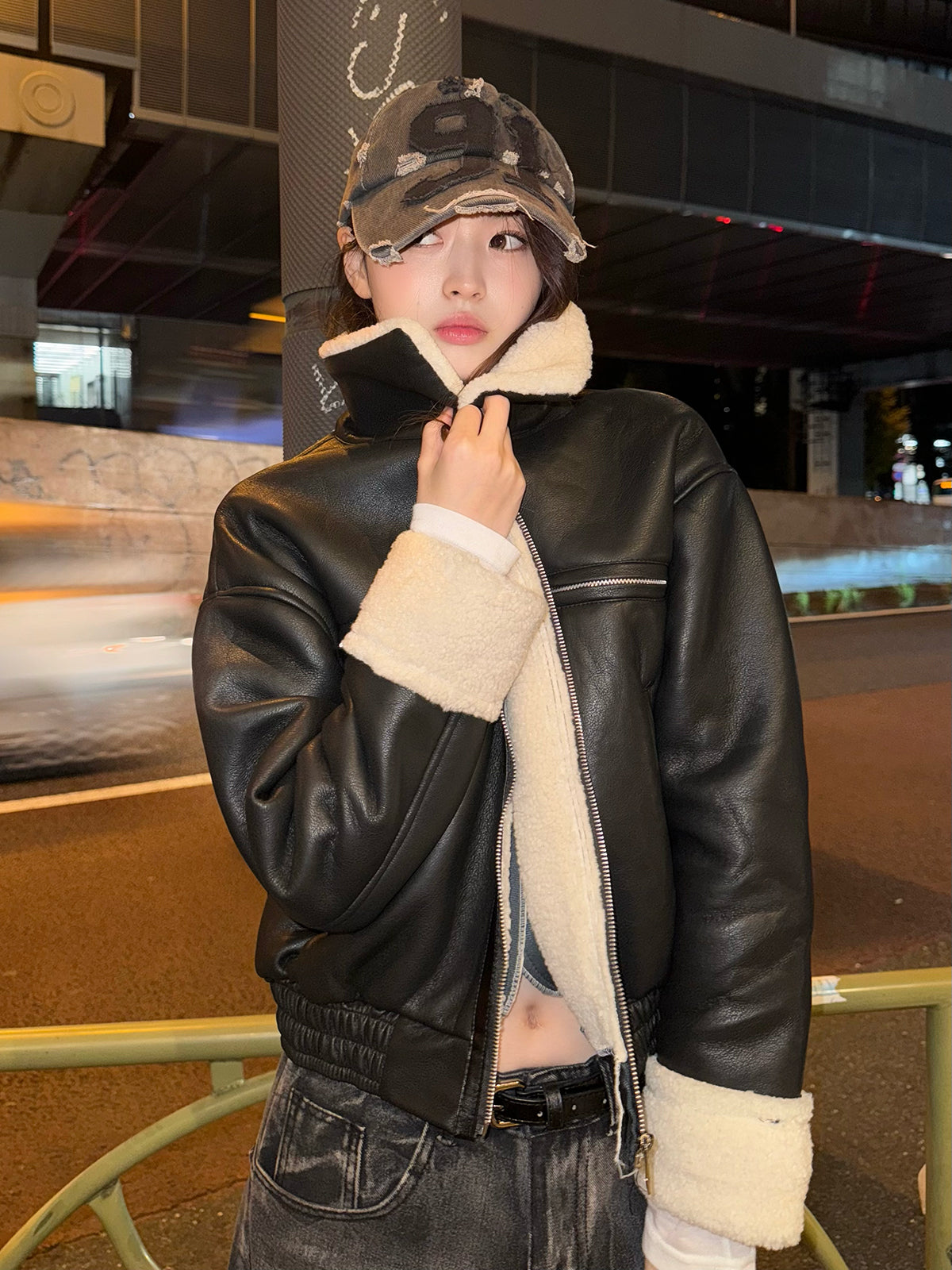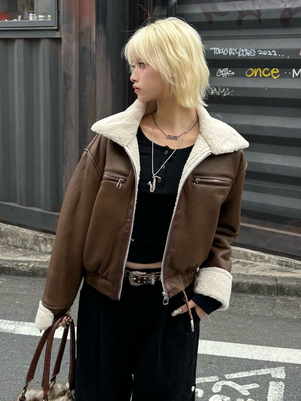 ふんわりとしたボアで季節感を引き立てるレザータッチジャケット。