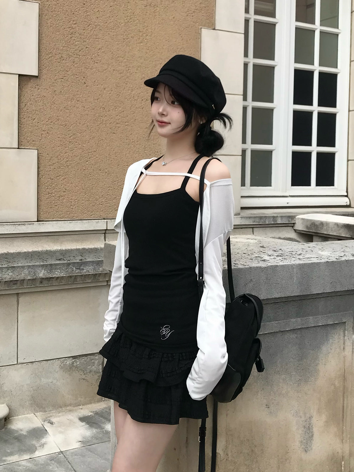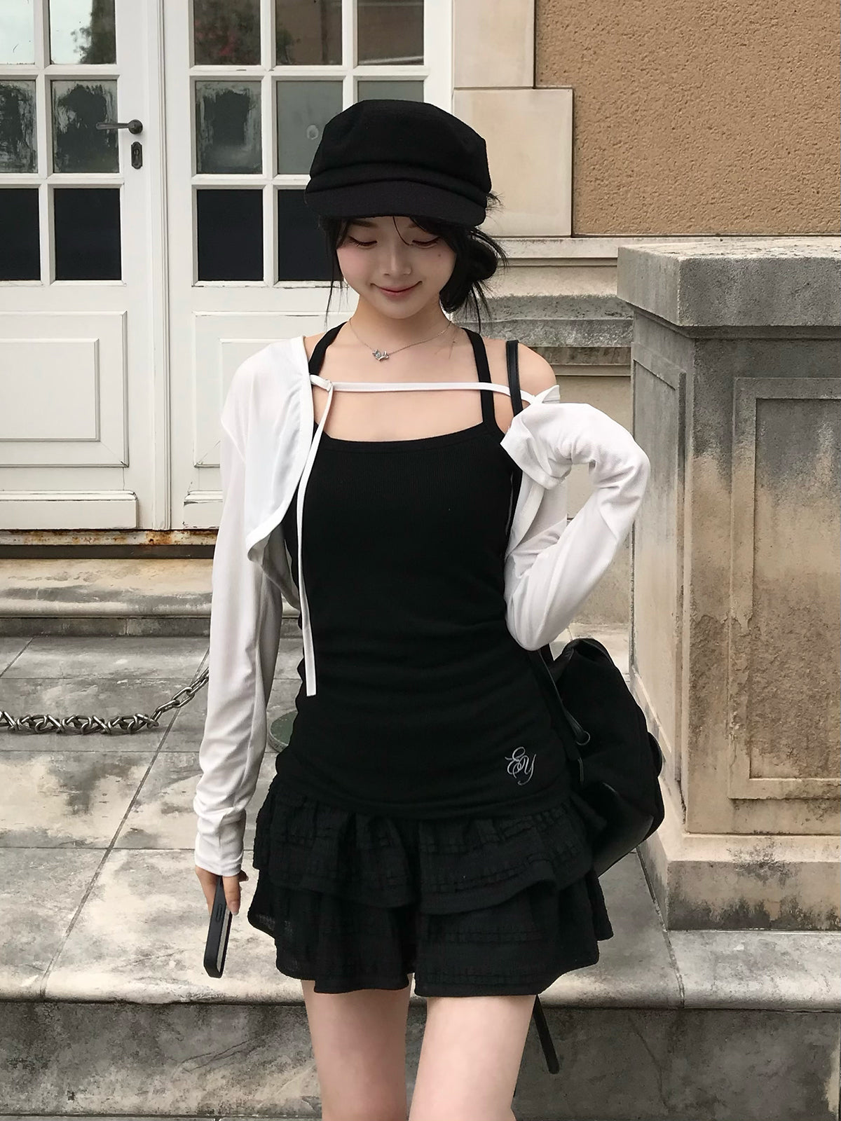 ボレロはフロントの紐でシルエットを調整でき、コーデにニュアンスをプラス。