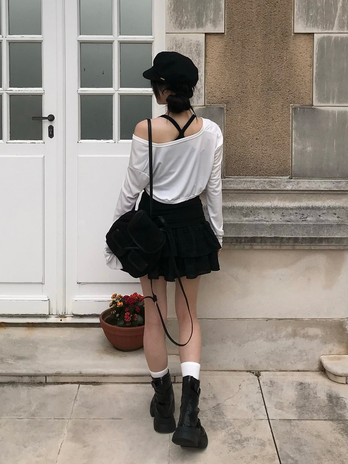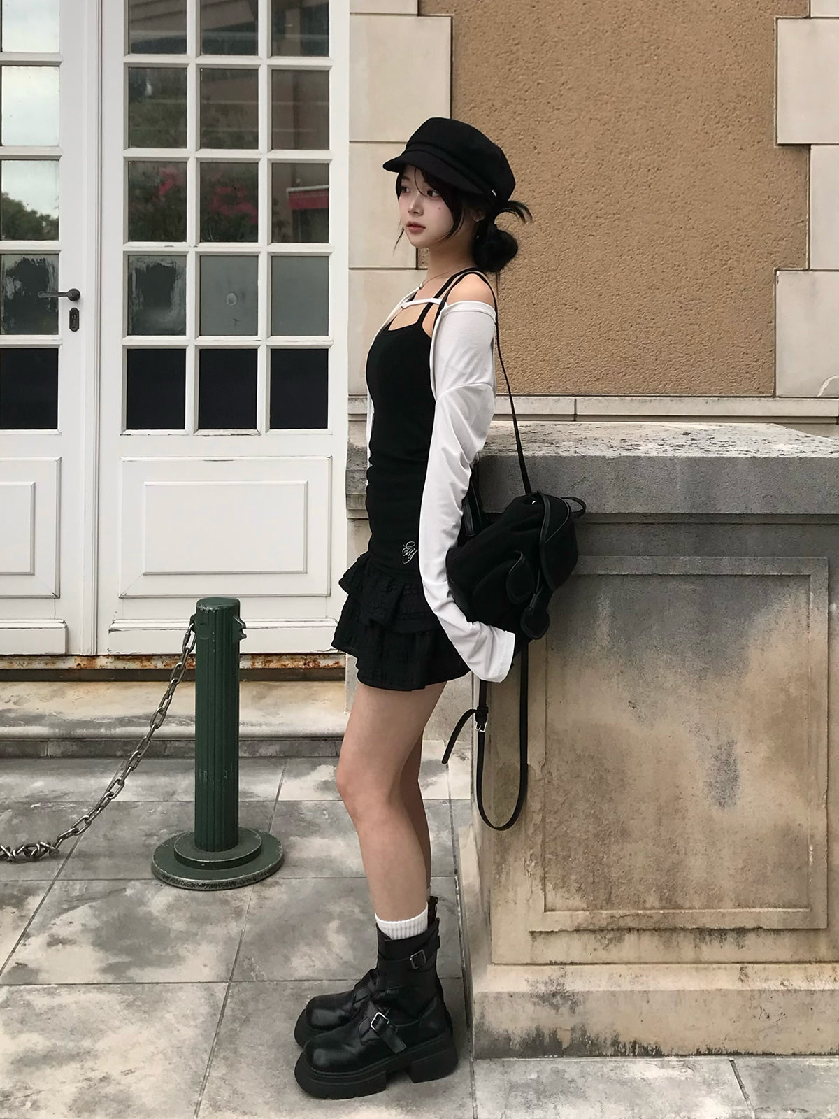 ホワイト×ブラック、ブラック×グレーのモノトーン配色で、レイヤードスタイルを楽しめる一枚です。