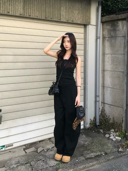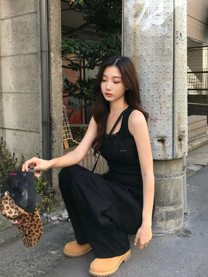 フロントに配されたフラップポケットとスクエアバックルが目を引くタンクトップ。
