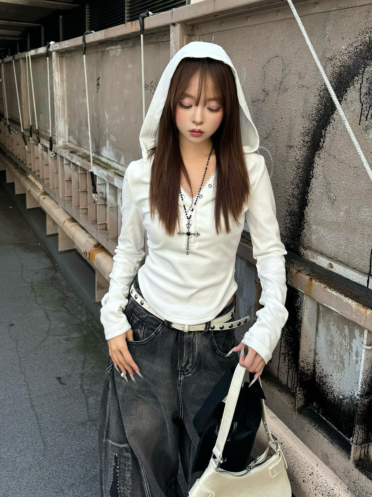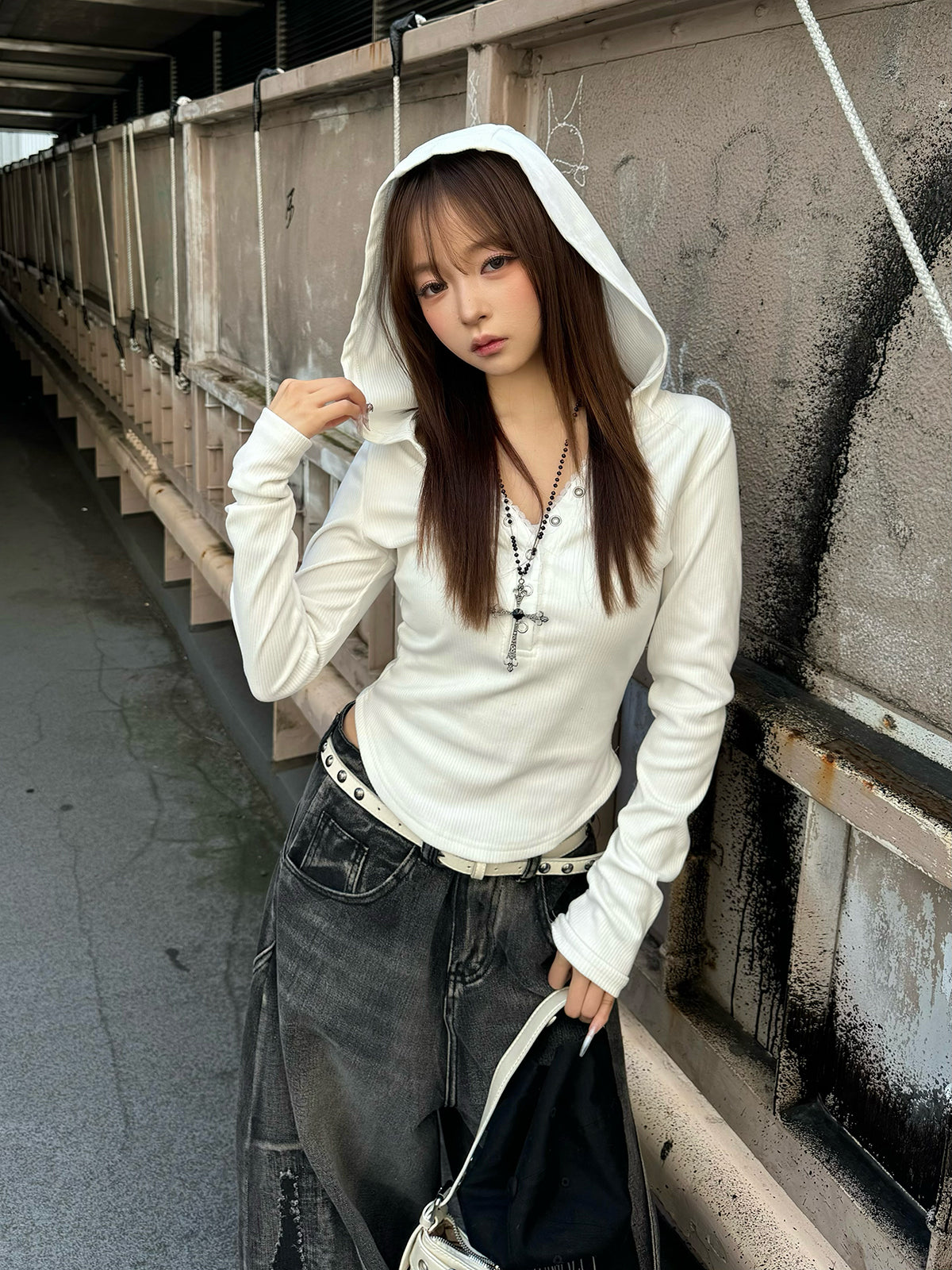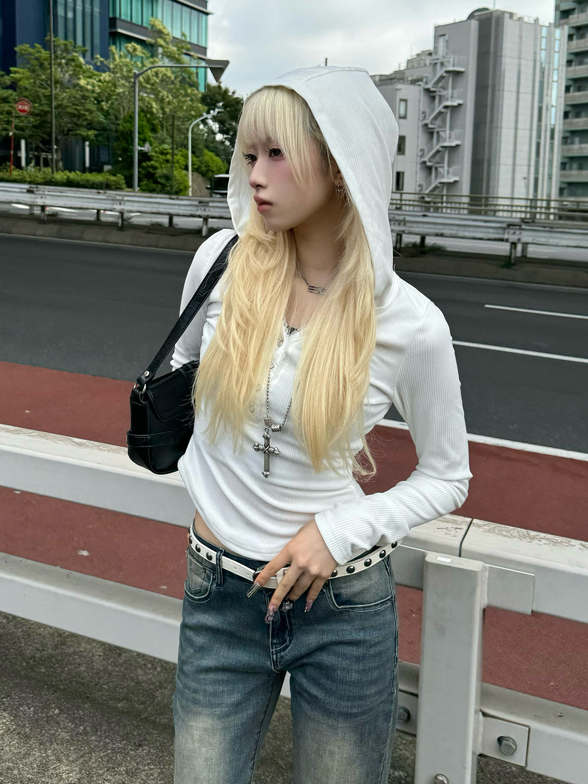 斜めに並んだボタンディテールがアクセントになるリブボタンフーディーカットソー。