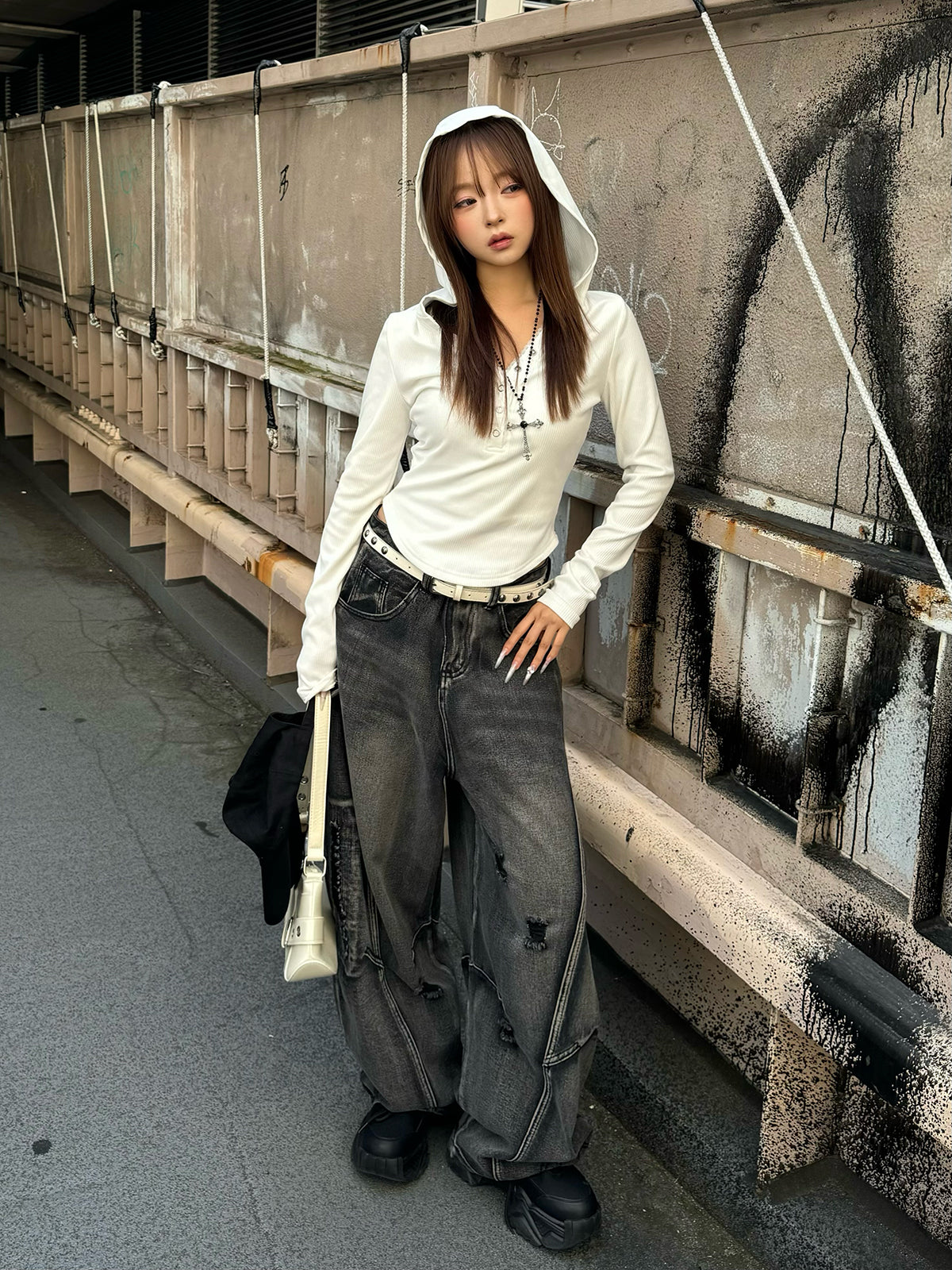 ・ダメージバレルレッグデニムパンツ