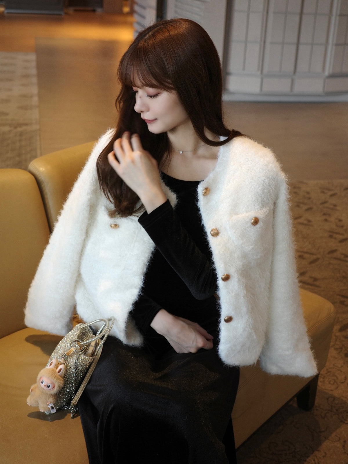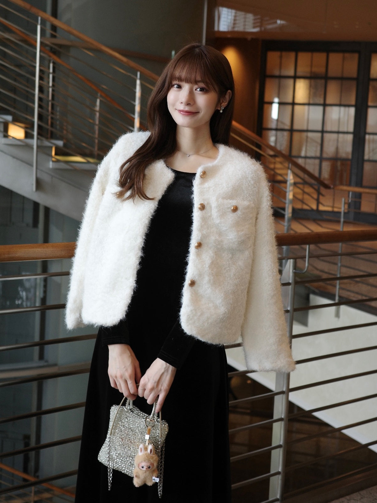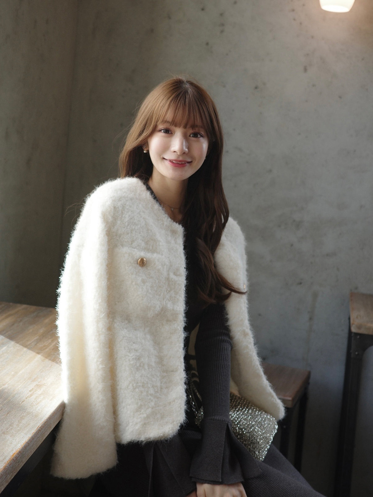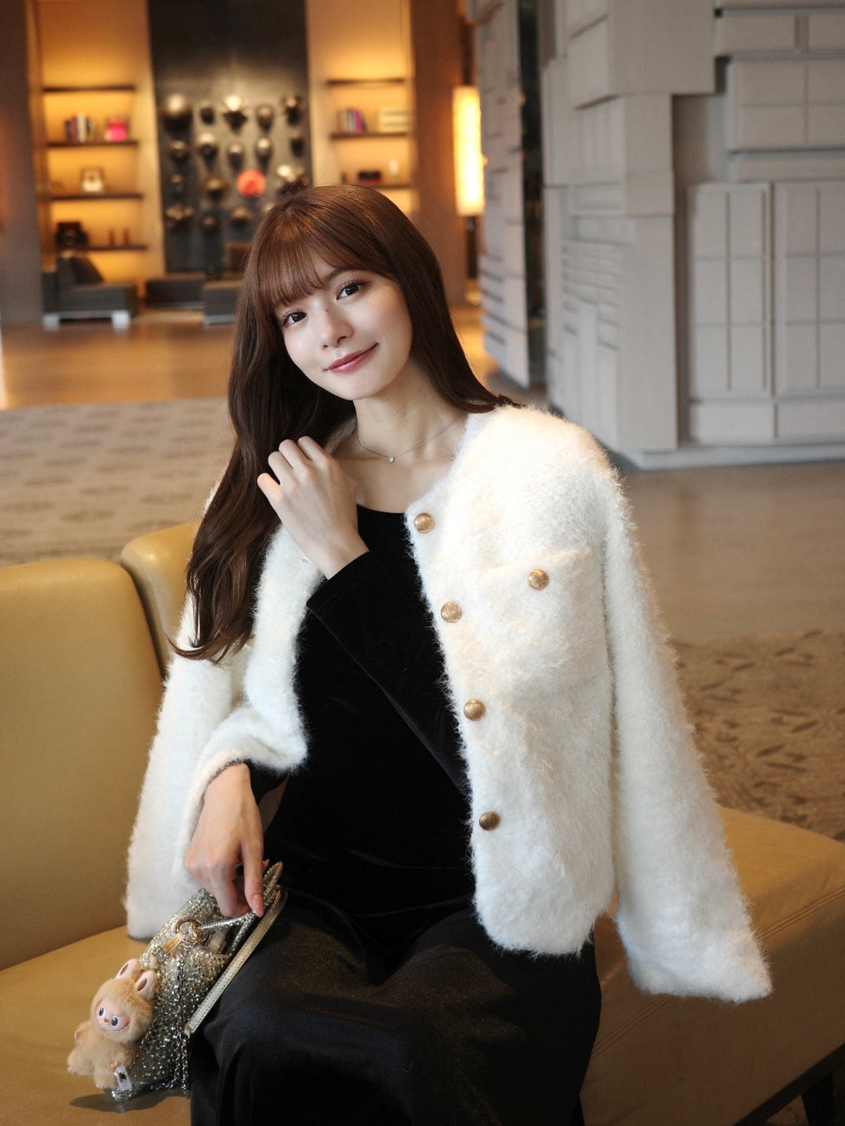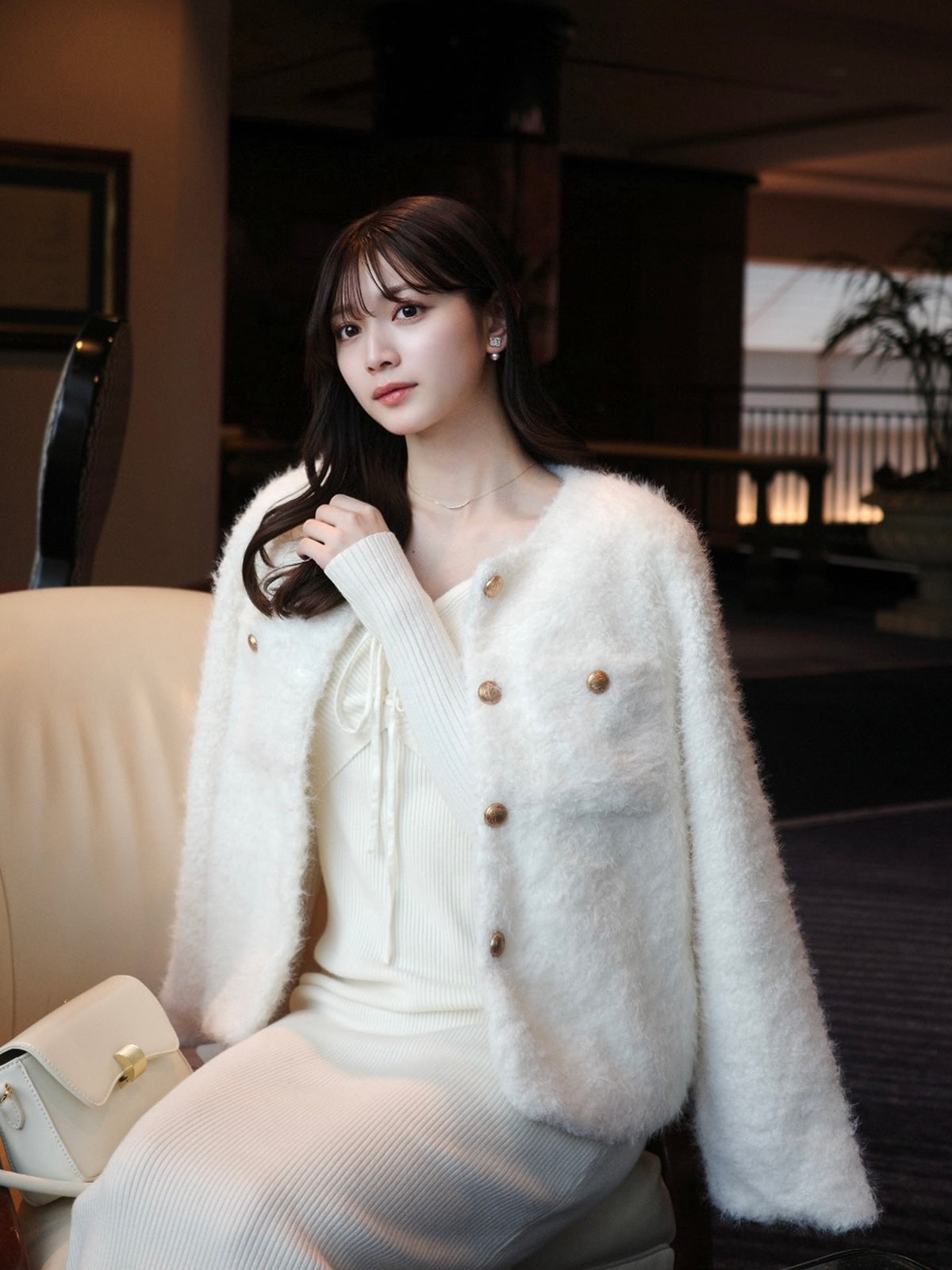 柔らかな起毛感に、ゴールドボタンがさりげないアクセントを添える、上品な印象のデザイン。