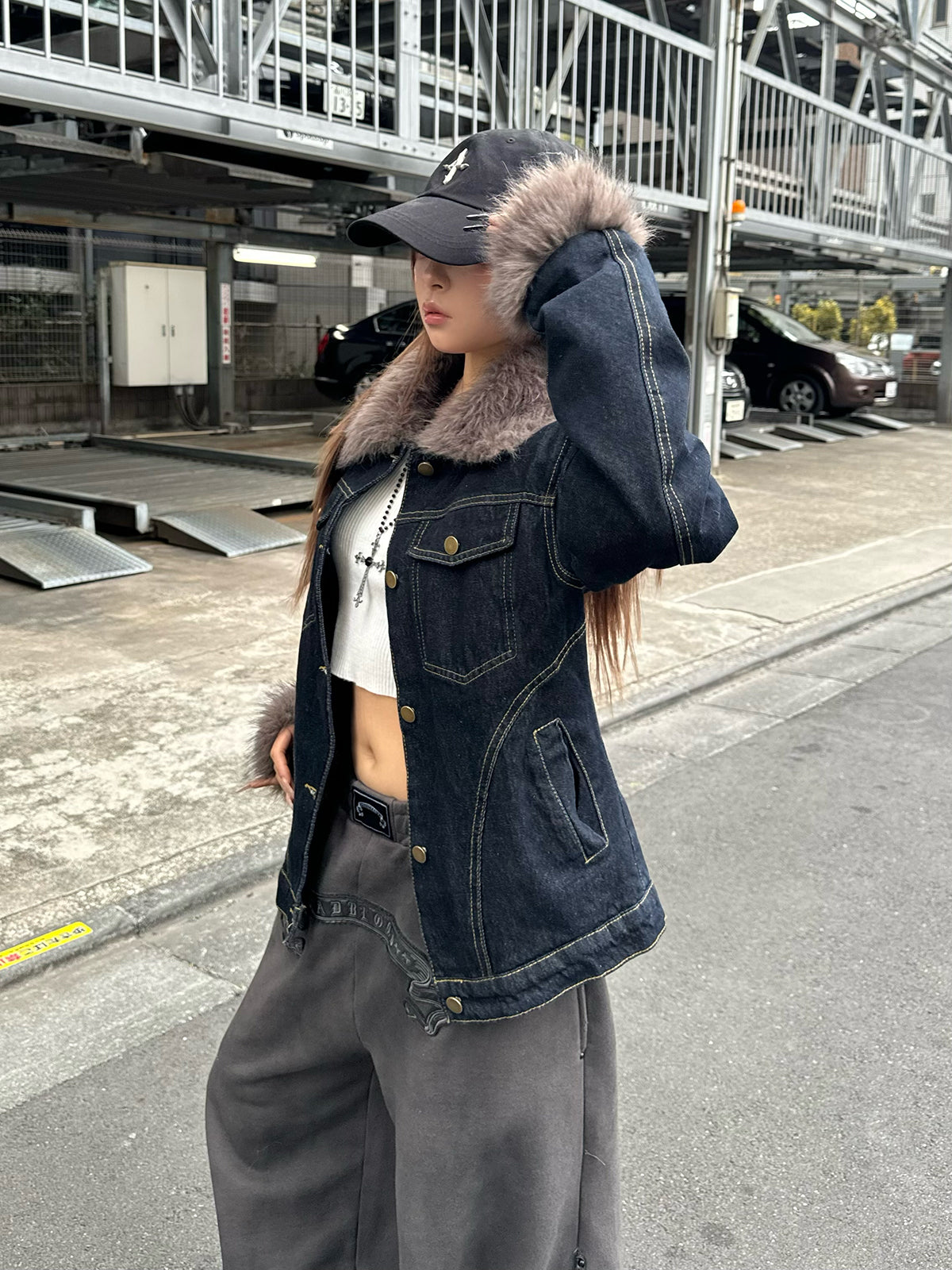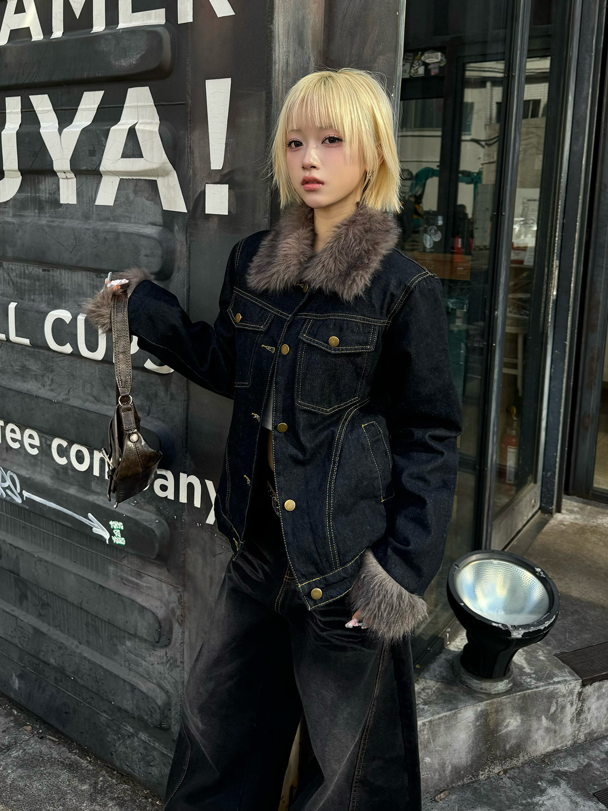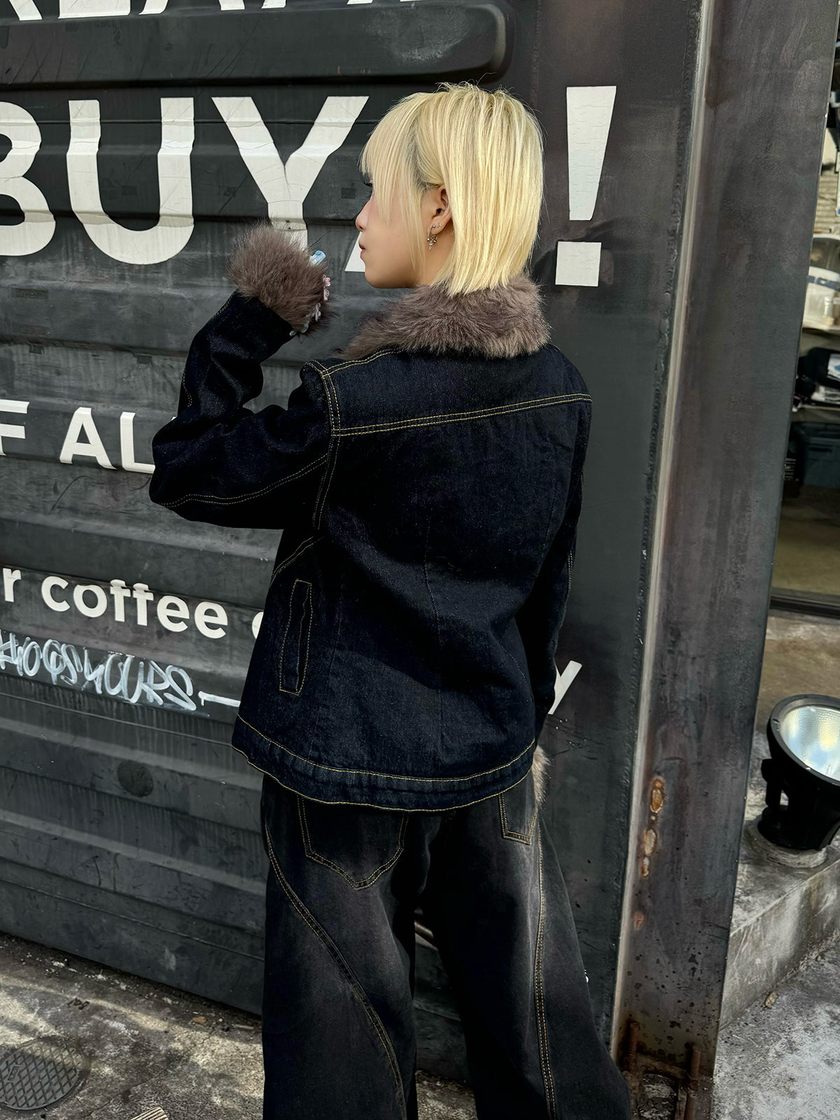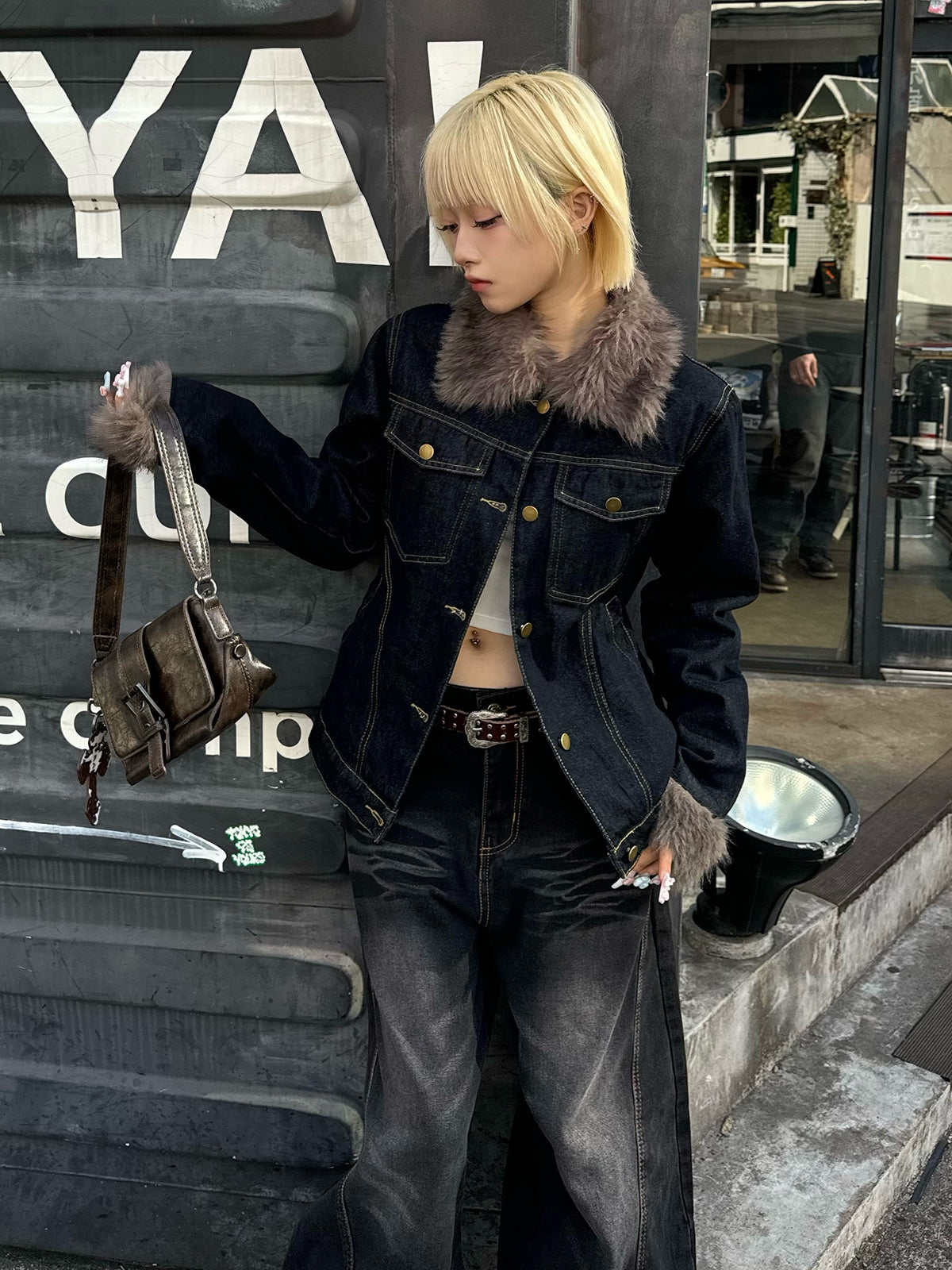 ファーライク素材の襟と袖が目を惹くデニムジャケット。