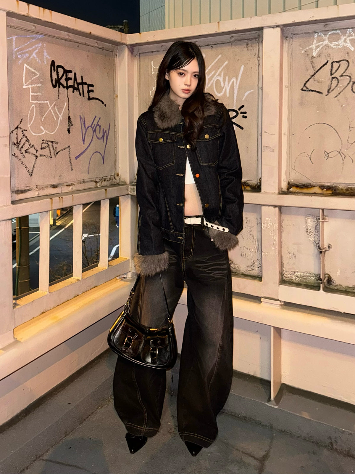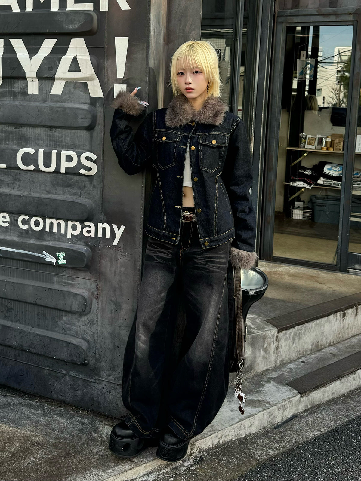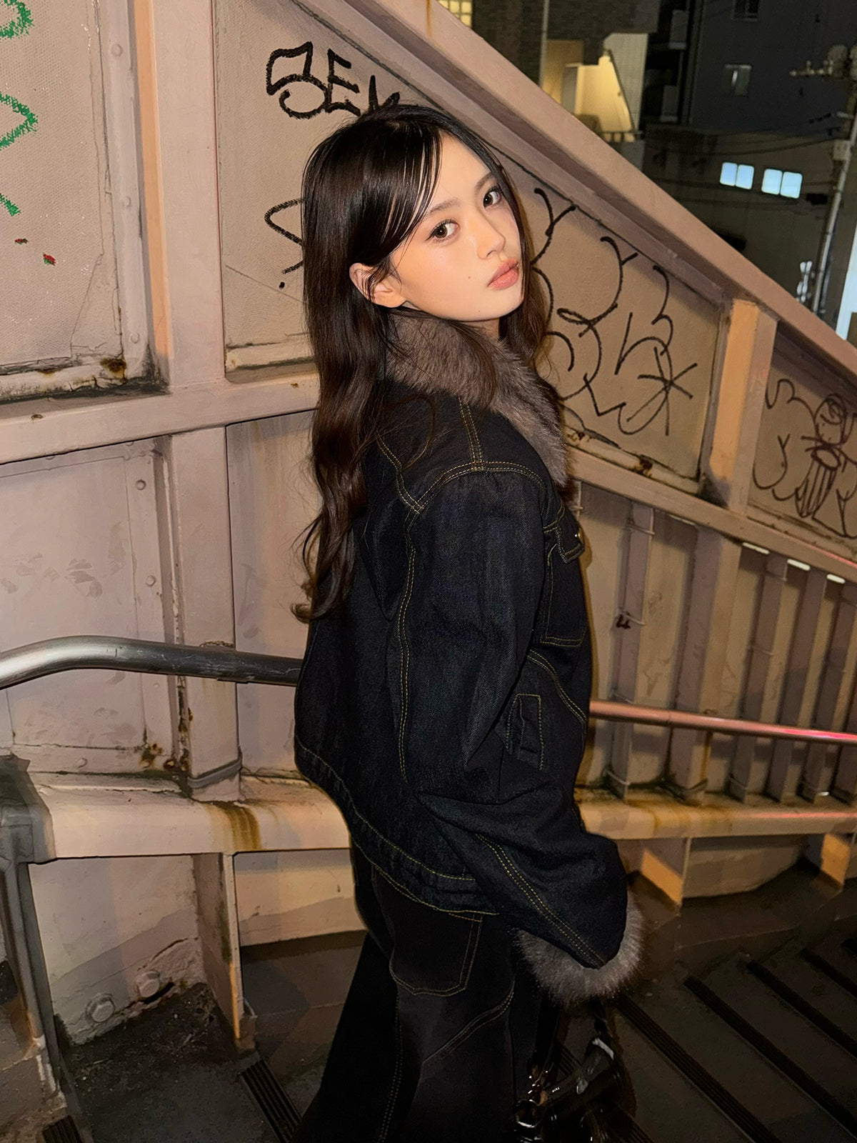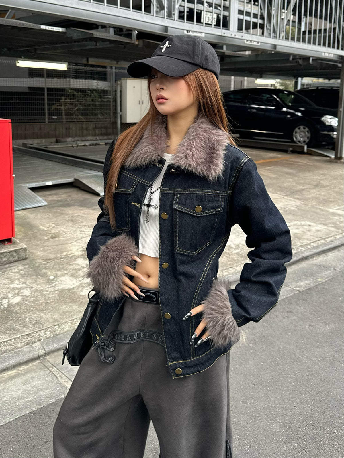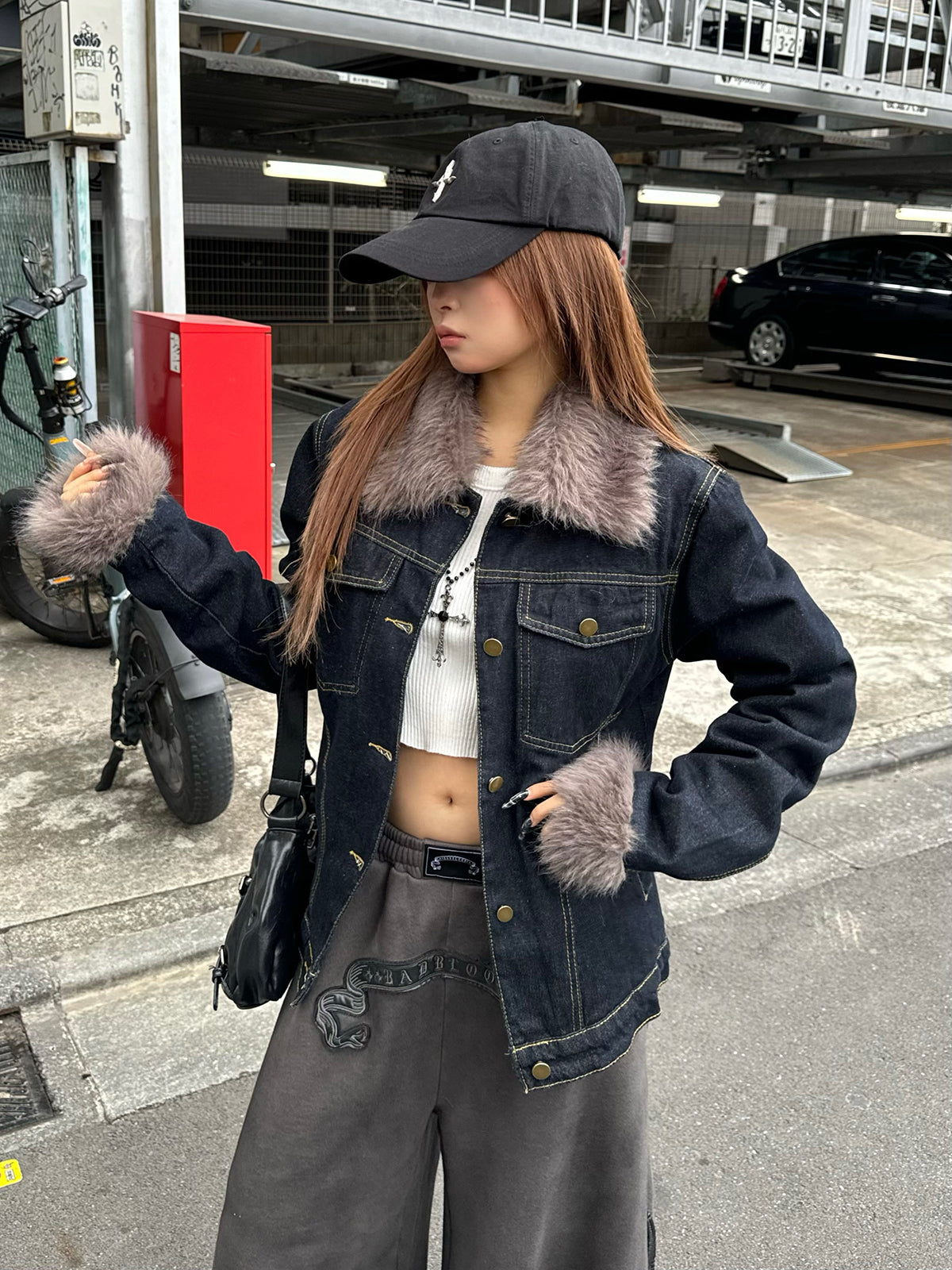 ファーライク素材の襟と袖が目を惹くデニムジャケット。