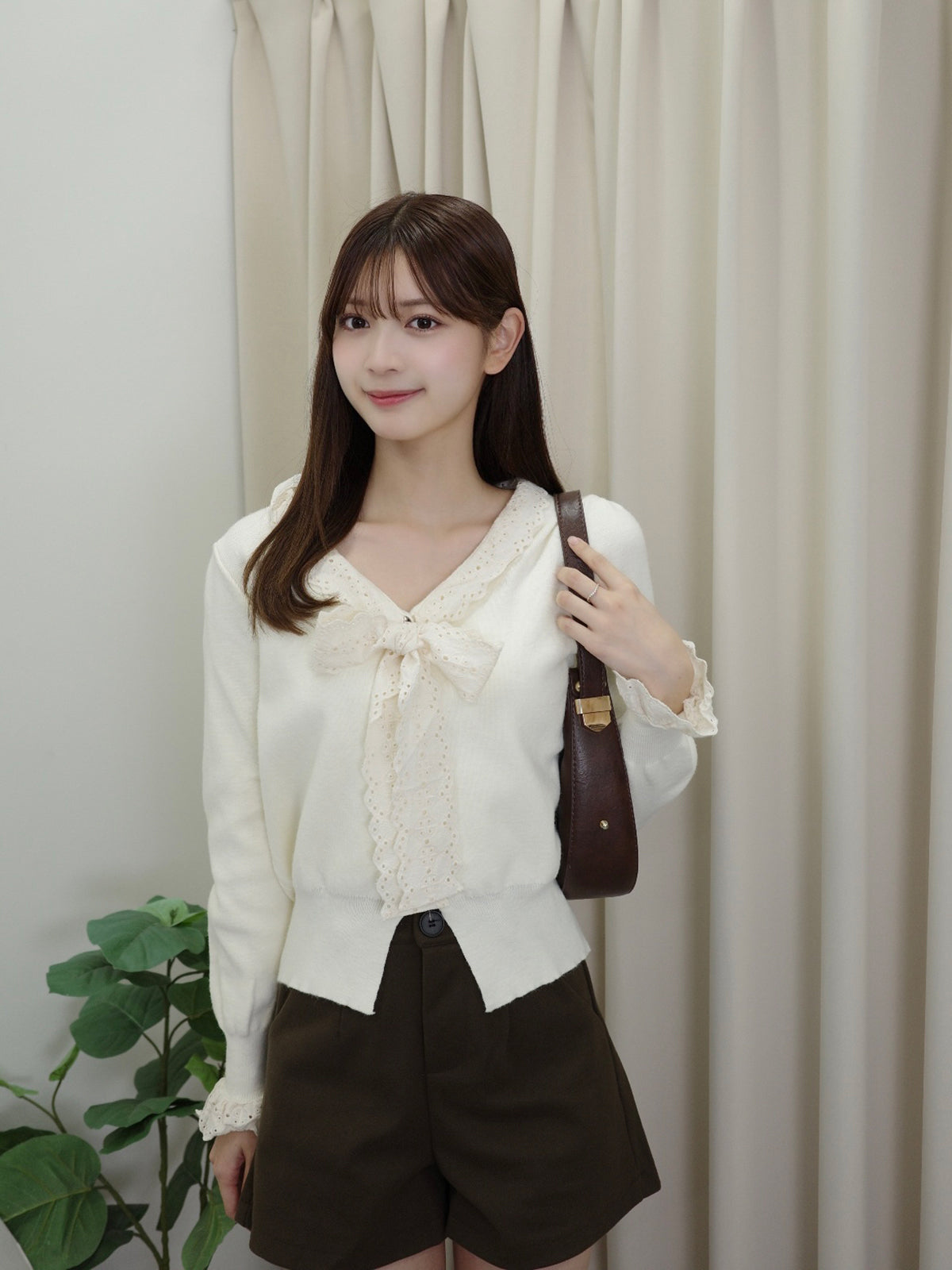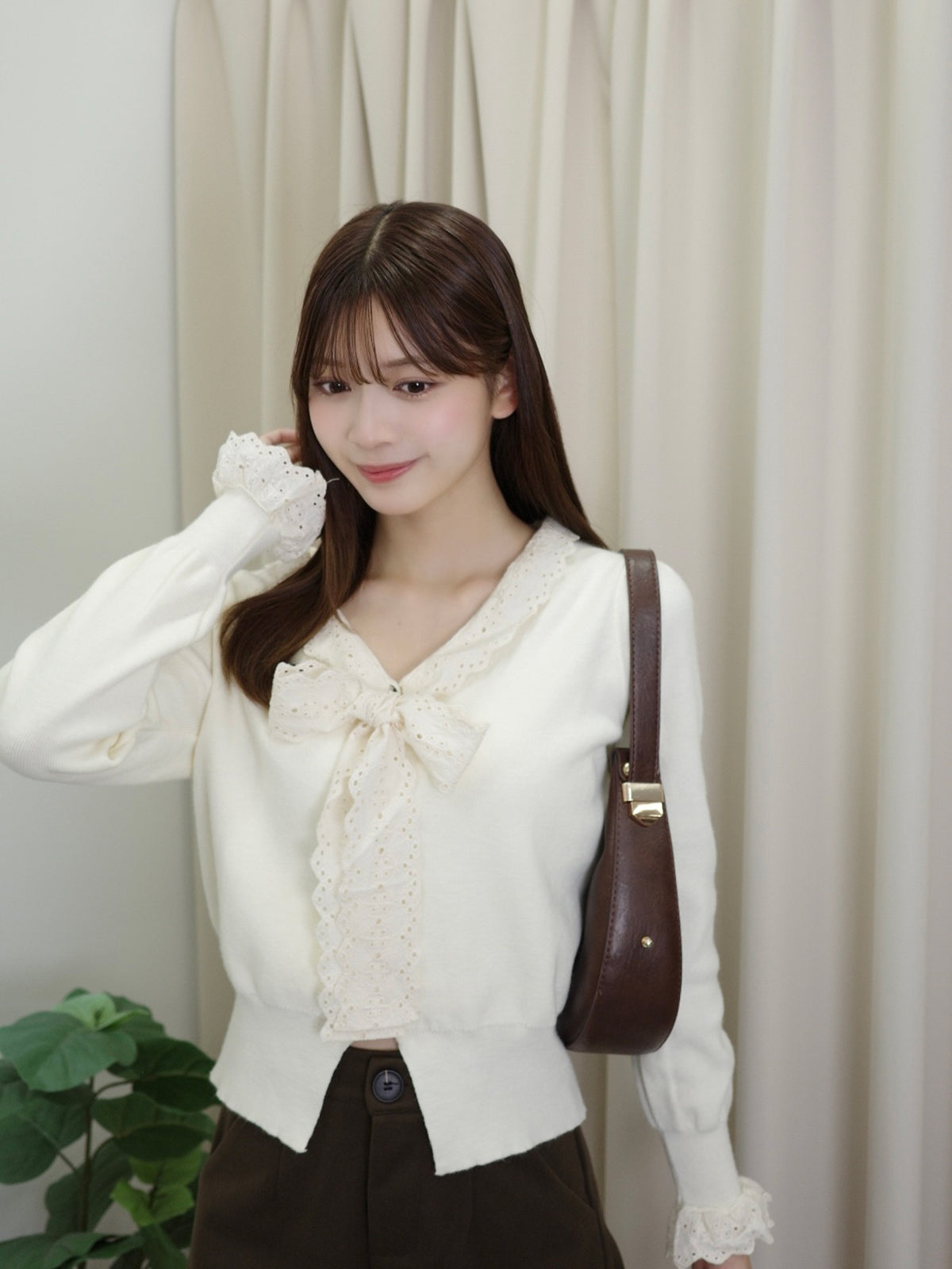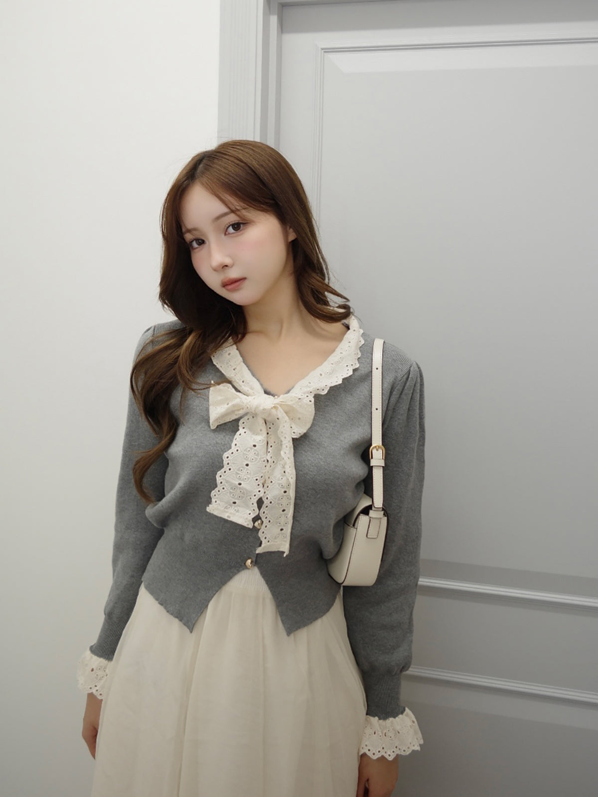 ハートボタンが可愛らしさを添えるレースリボンボウタイニットカーディガン。
