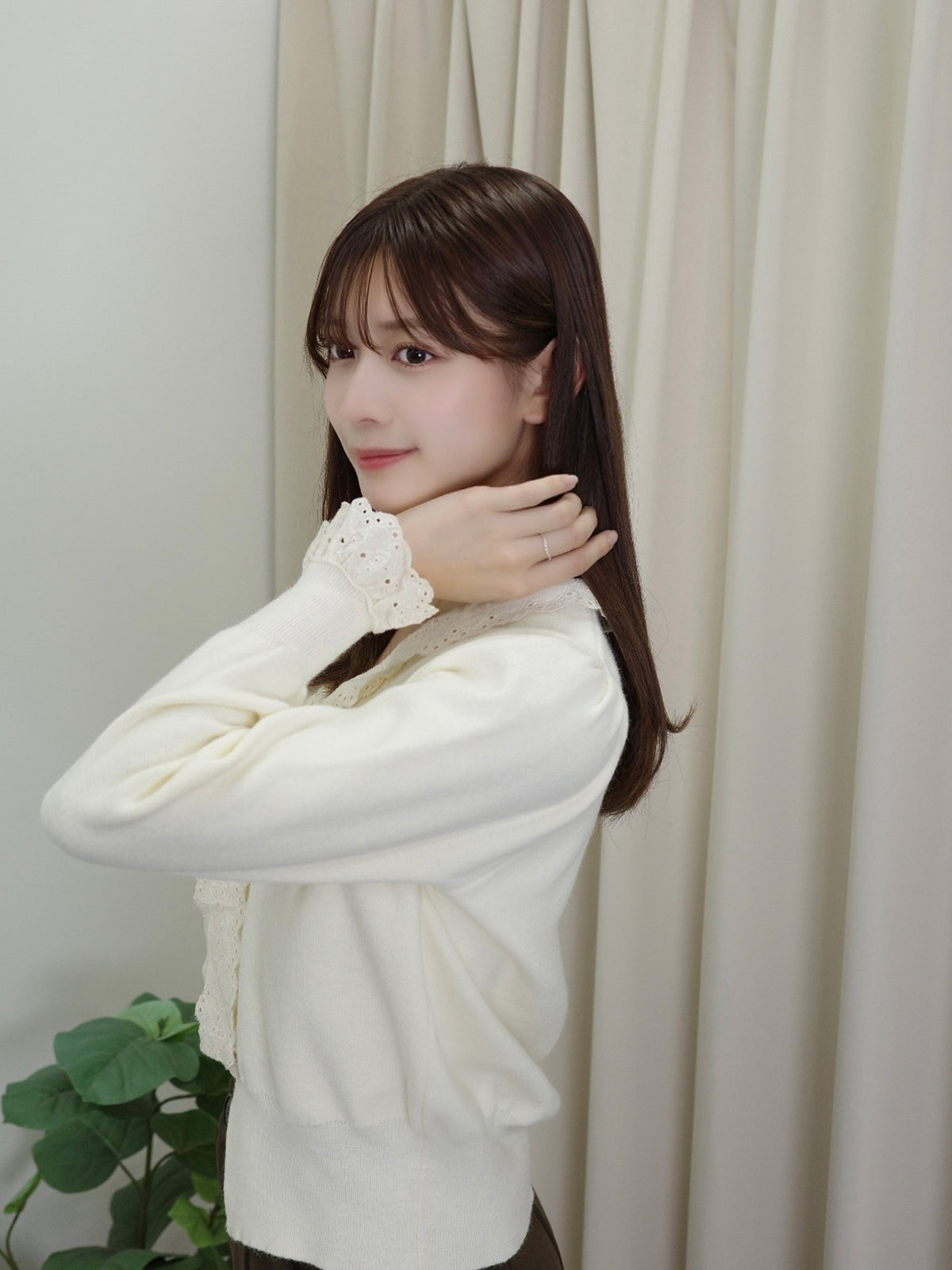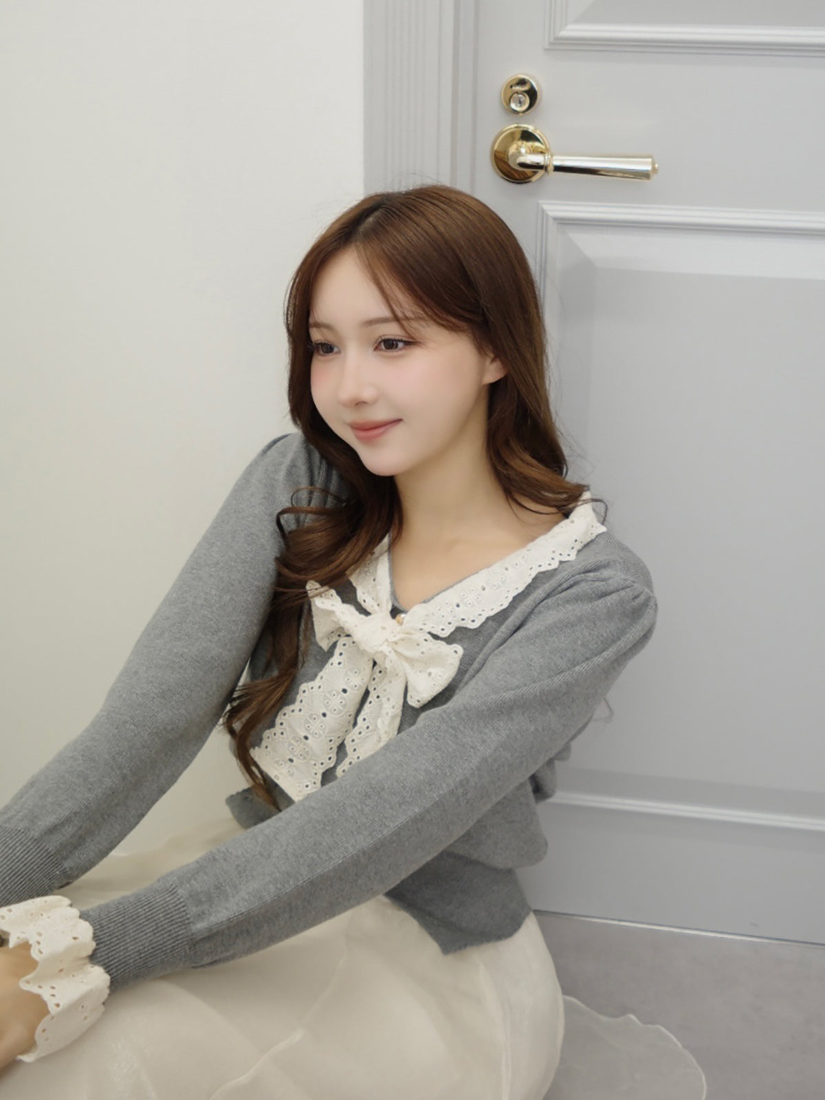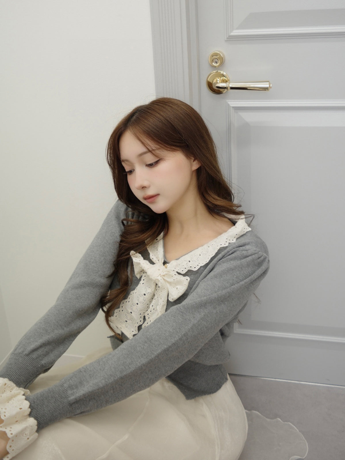 ハートボタンが可愛らしさを添えるレースリボンボウタイニットカーディガン。