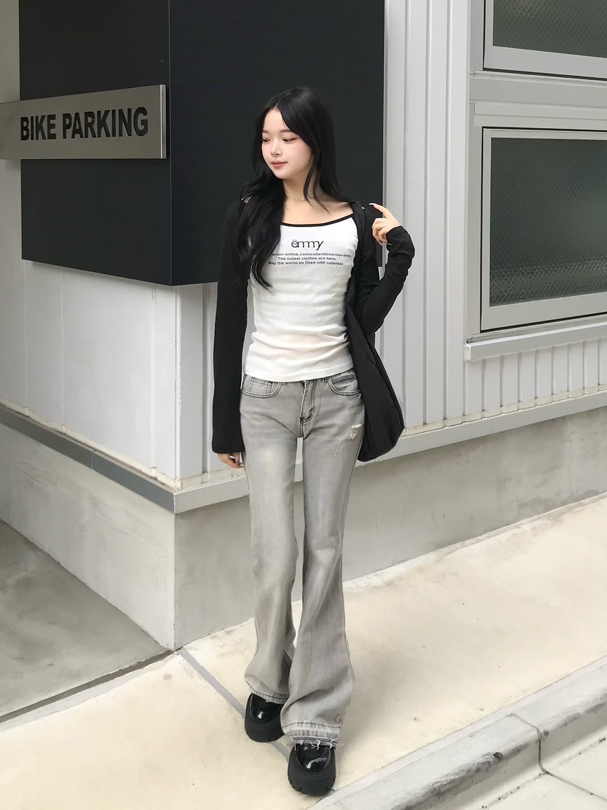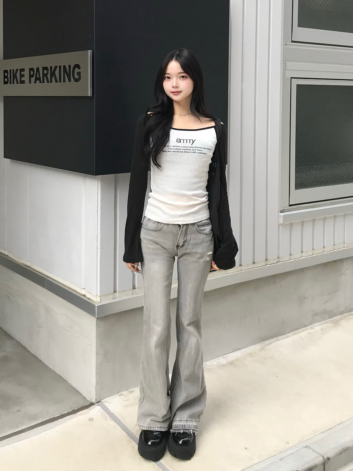 ヒップラインに刺繍を施した、ローライズ×フレアシルエットのグレーデニムパンツ。