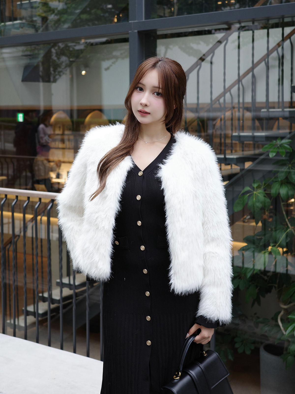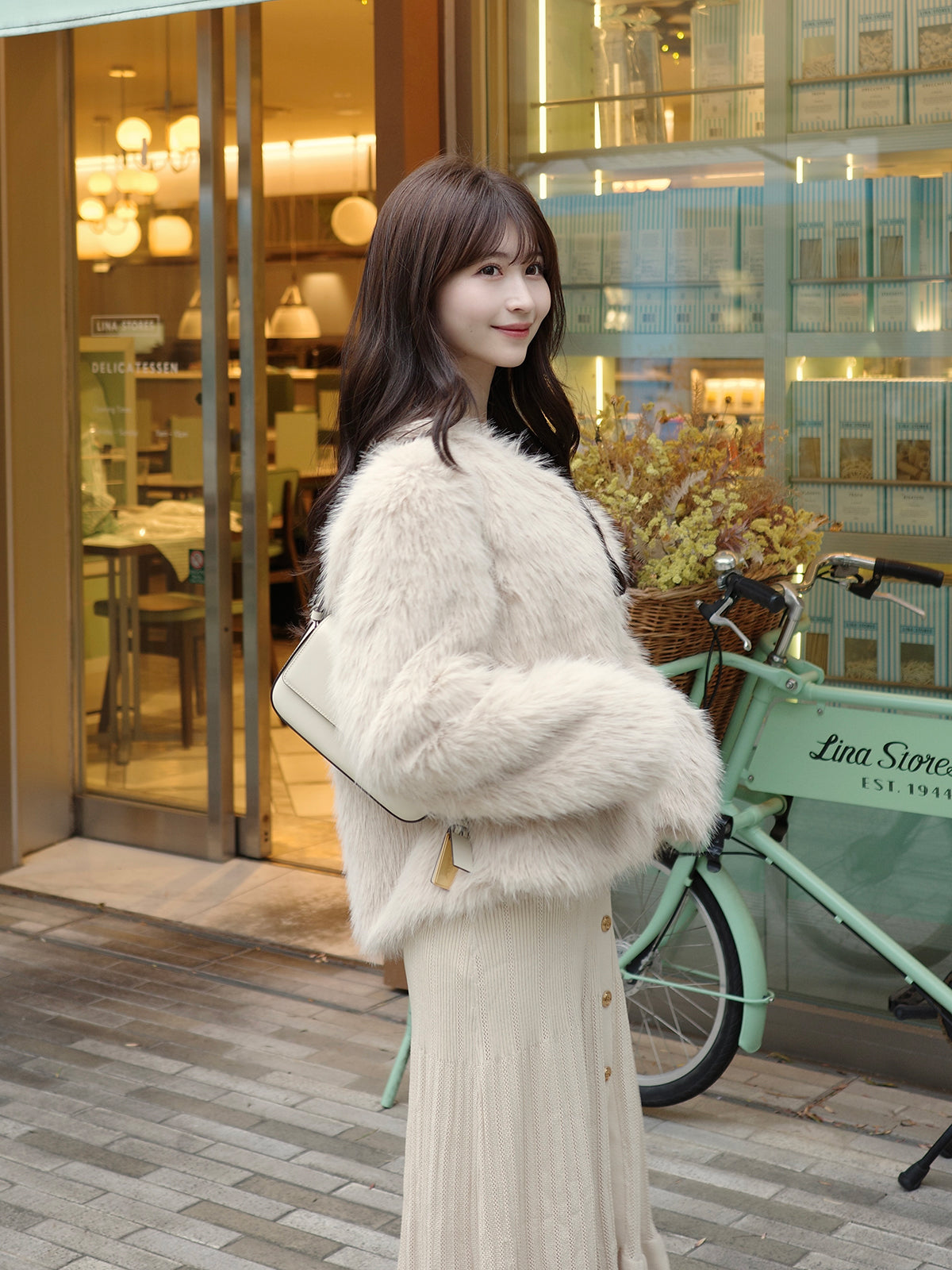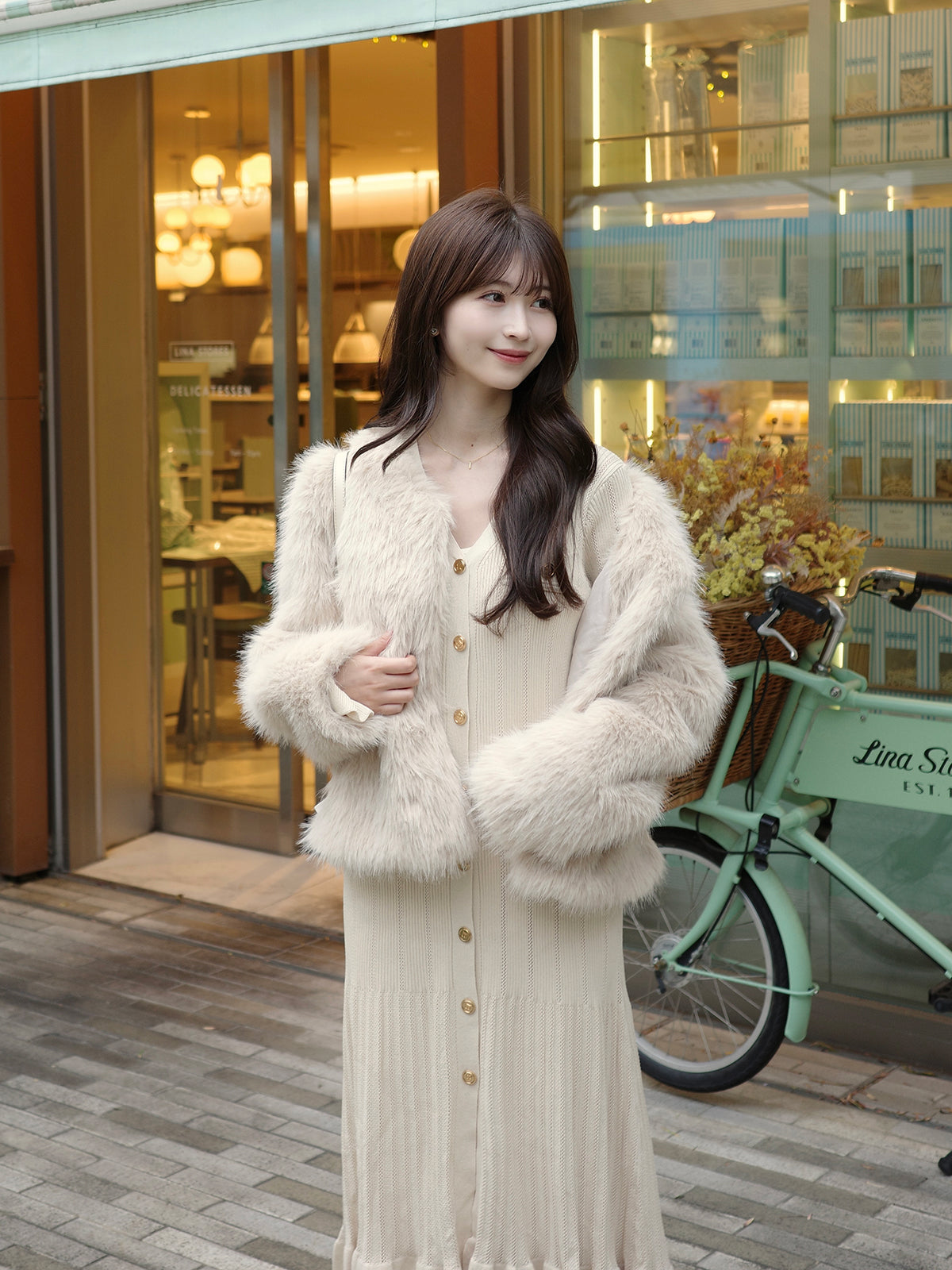 ふんわりとしたファーライク素材のボリューム感と、贅沢な肌触りが魅力のコート。
