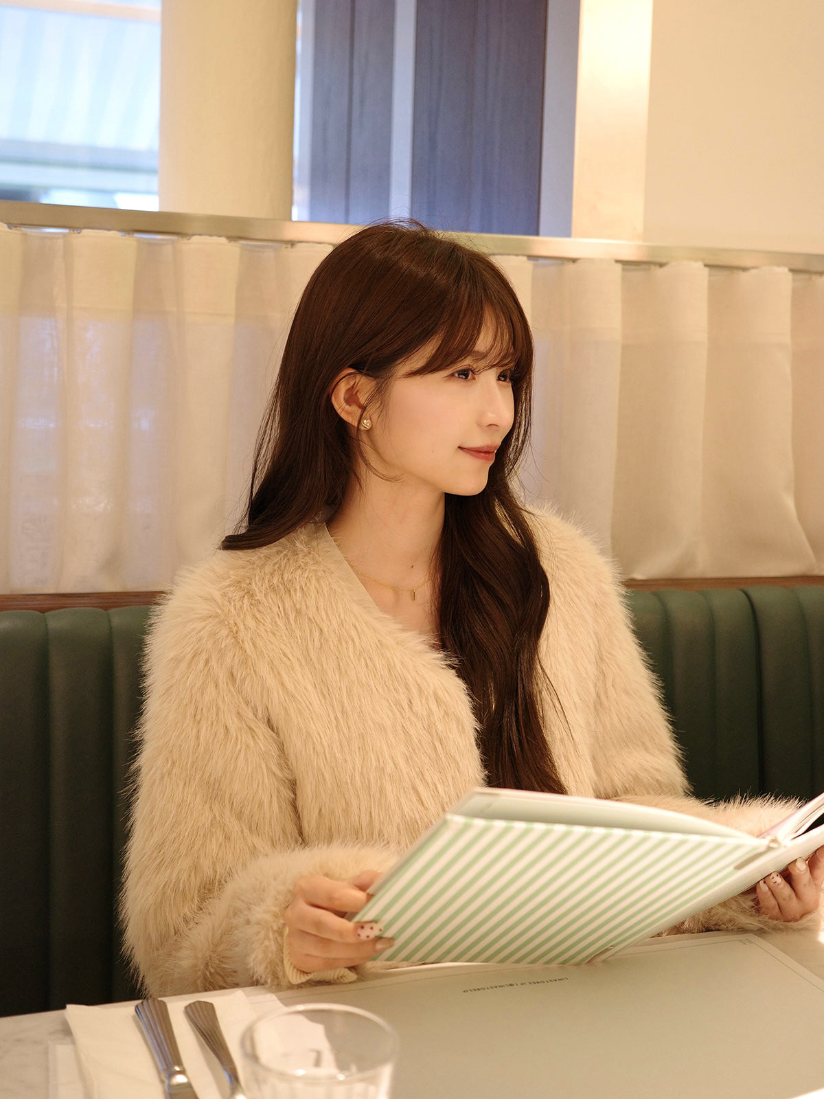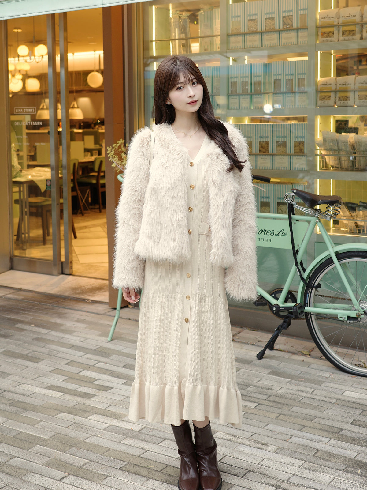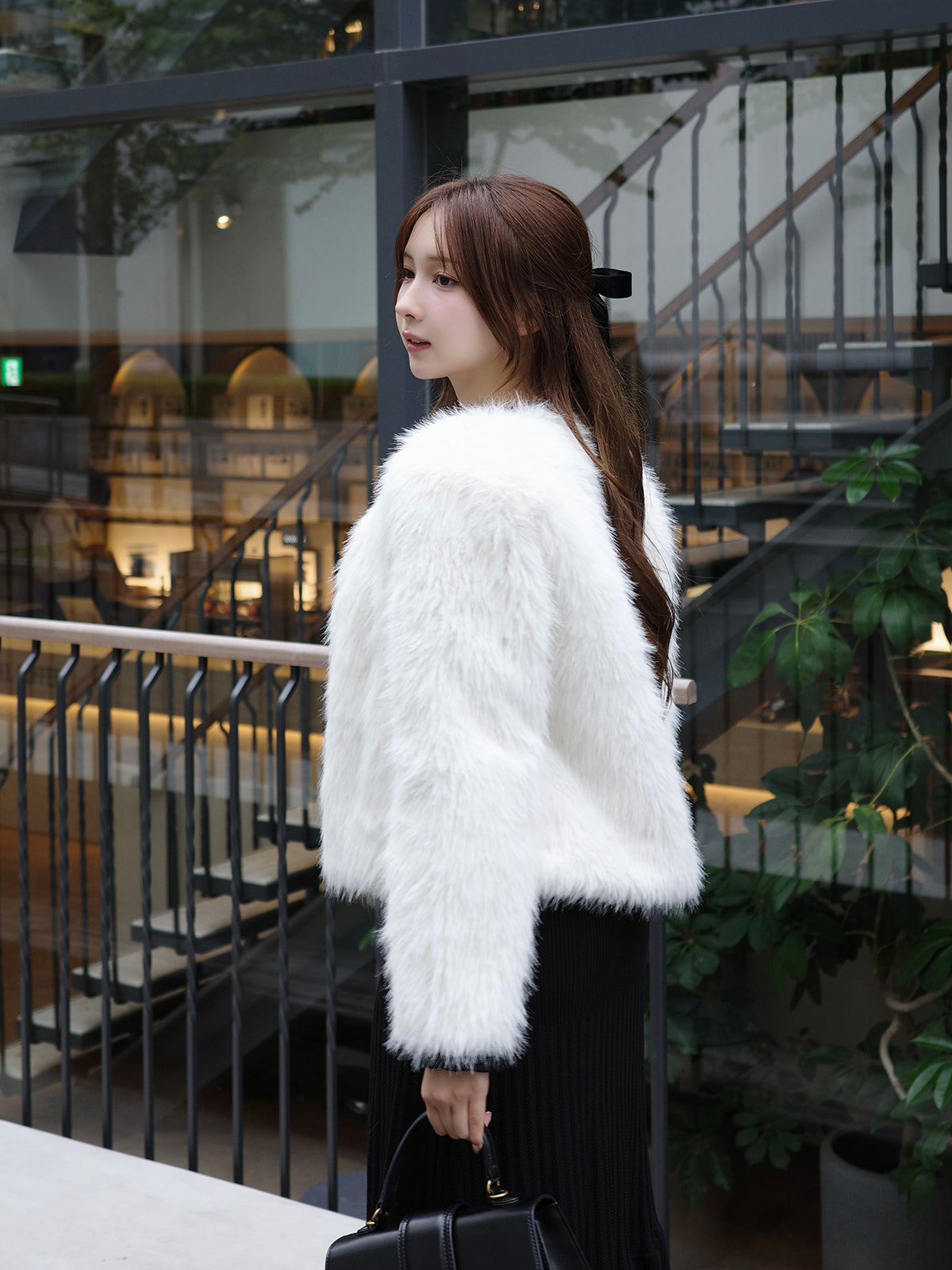 ふんわりとしたファーライク素材のボリューム感と、贅沢な肌触りが魅力のコート。