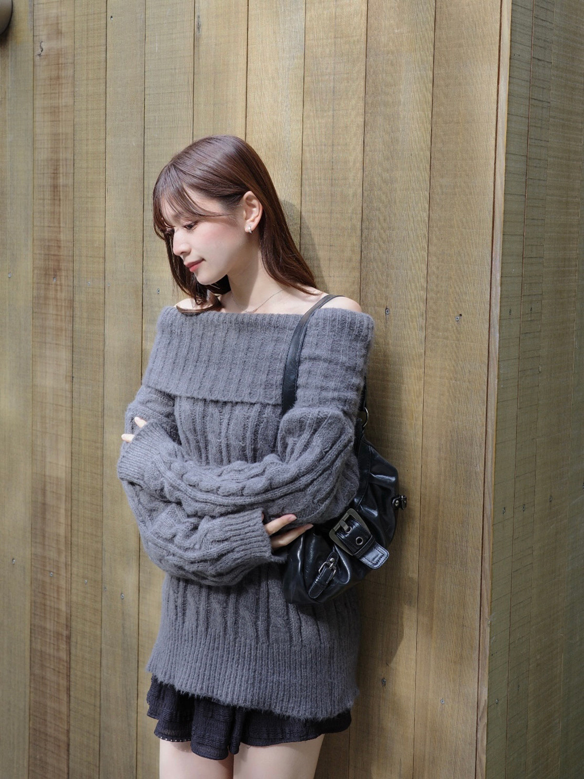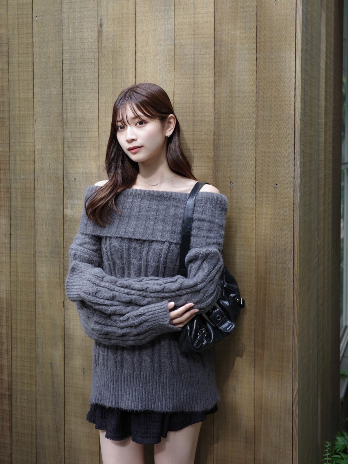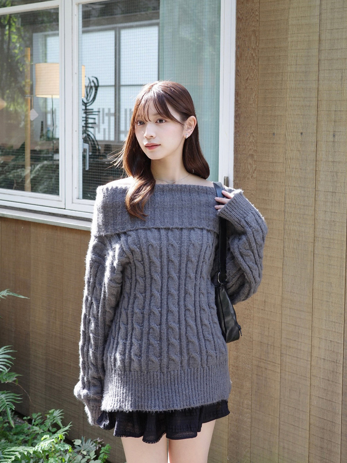 ボリューム感とグレーカラーが優しい印象のオフショルケーブルニット。