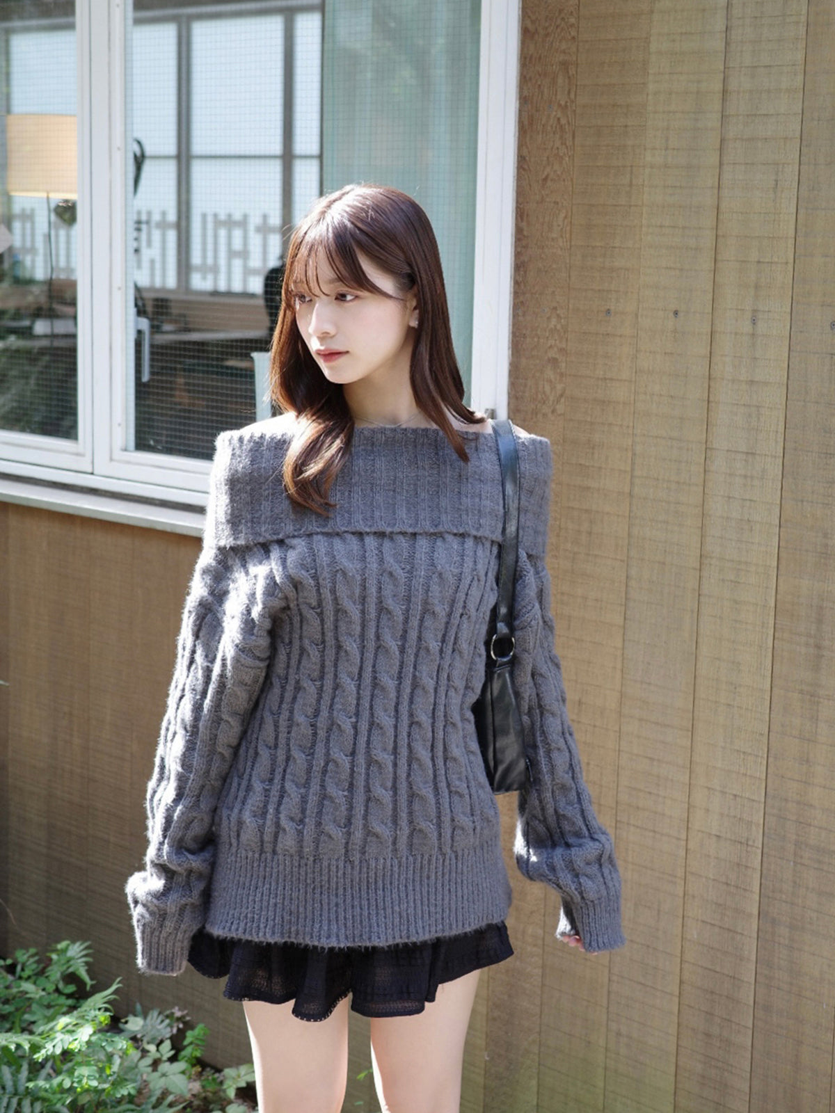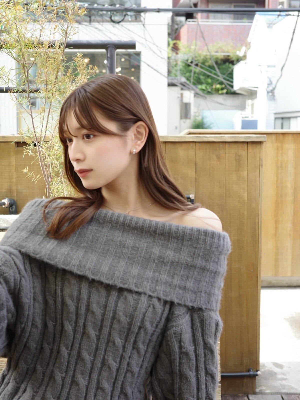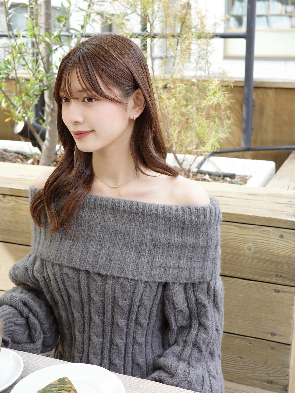 ボリューム感とグレーカラーが優しい印象のオフショルケーブルニット。