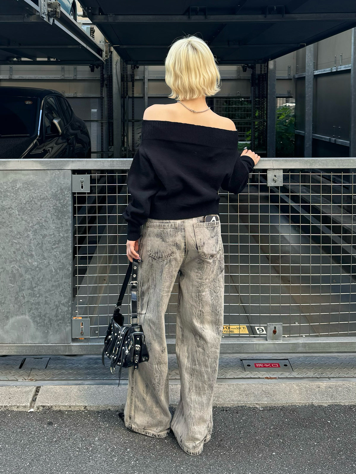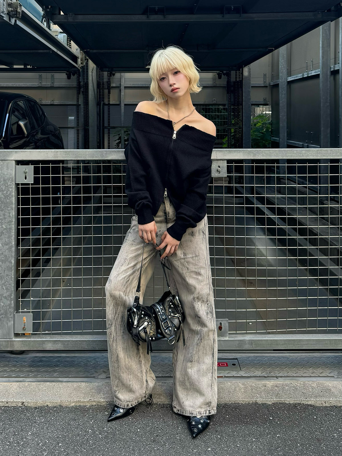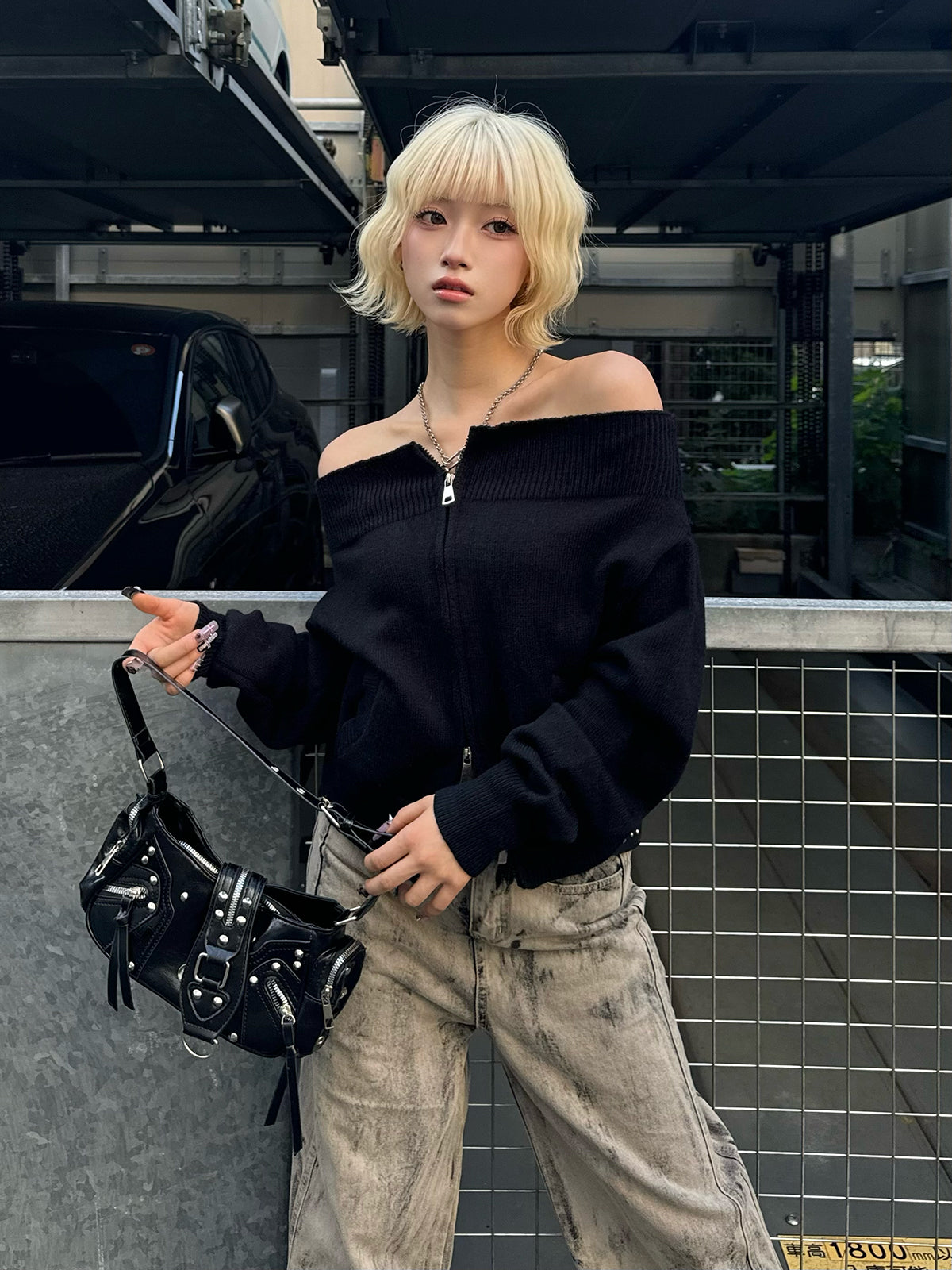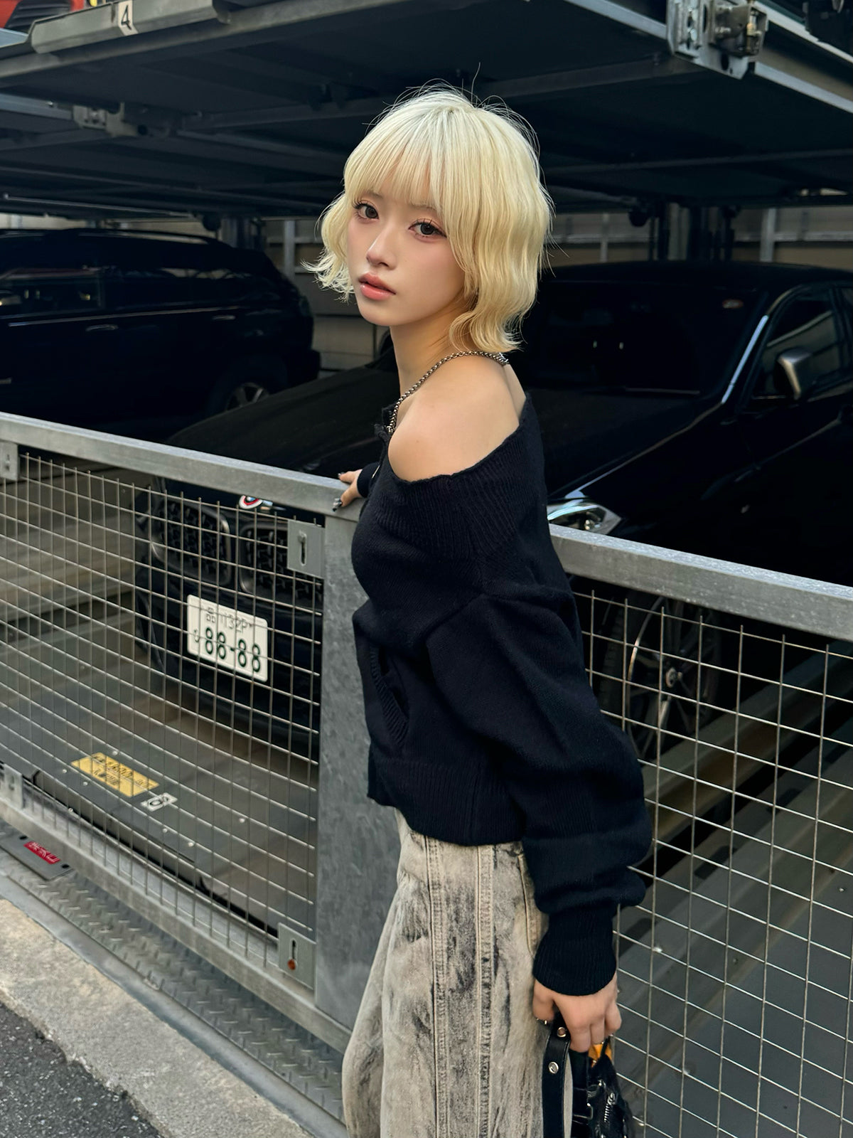 オフショルダブルジップニット