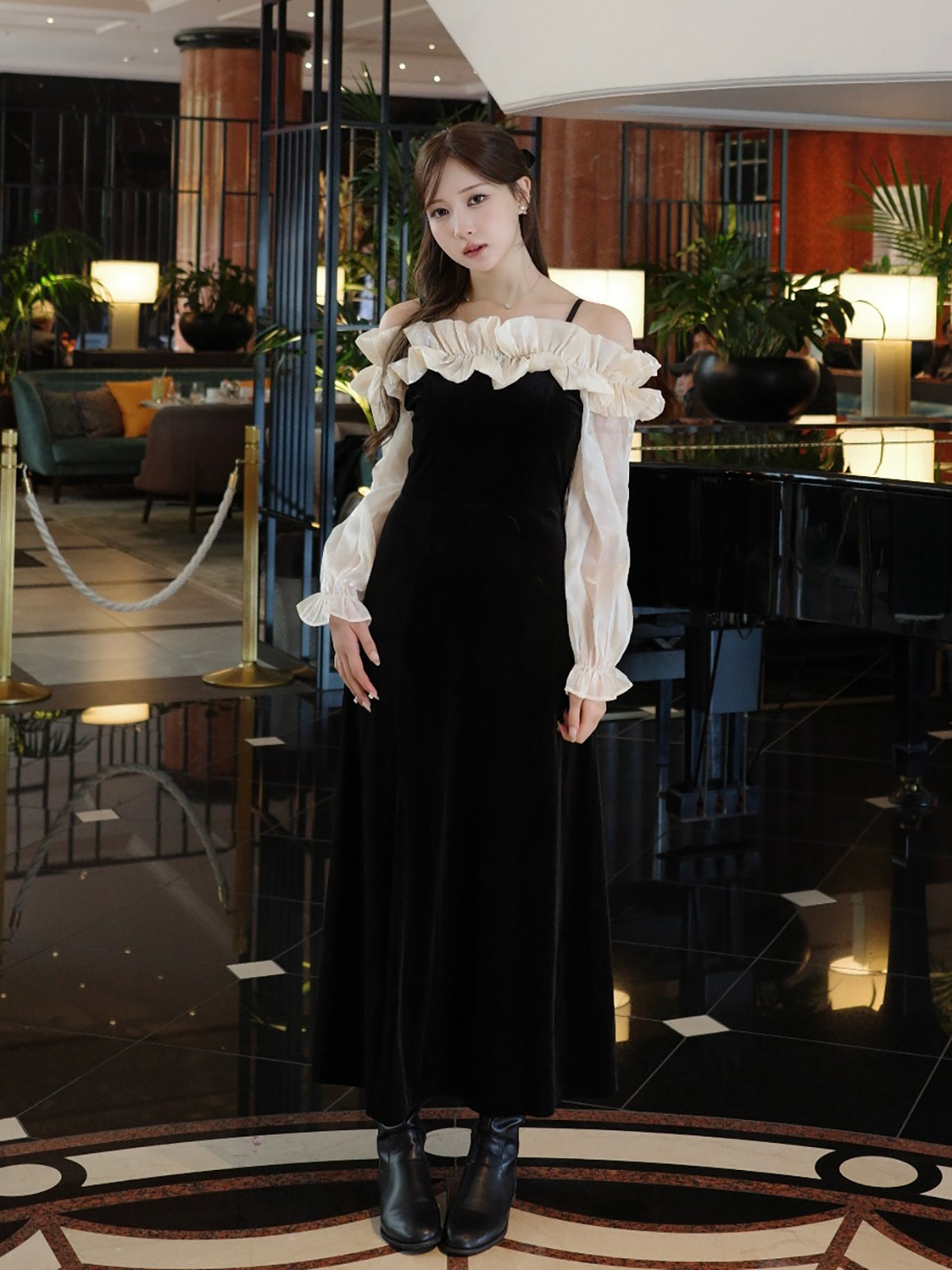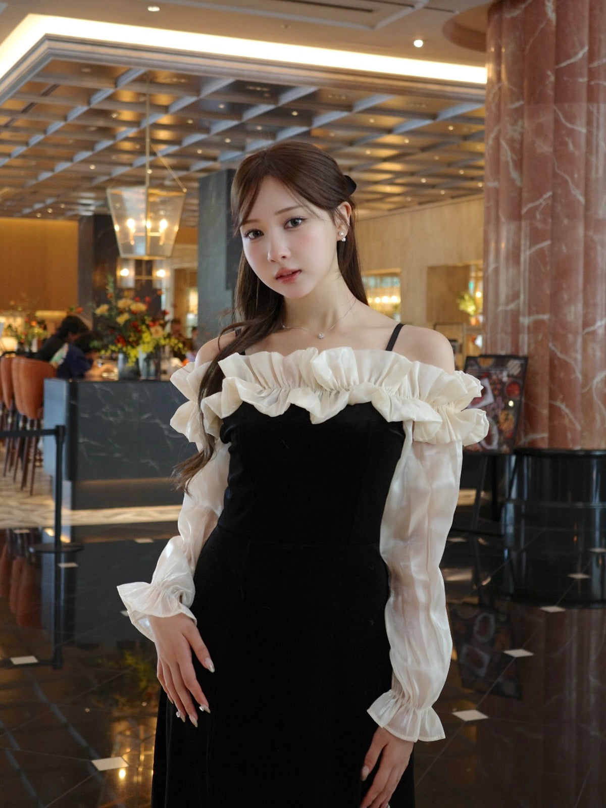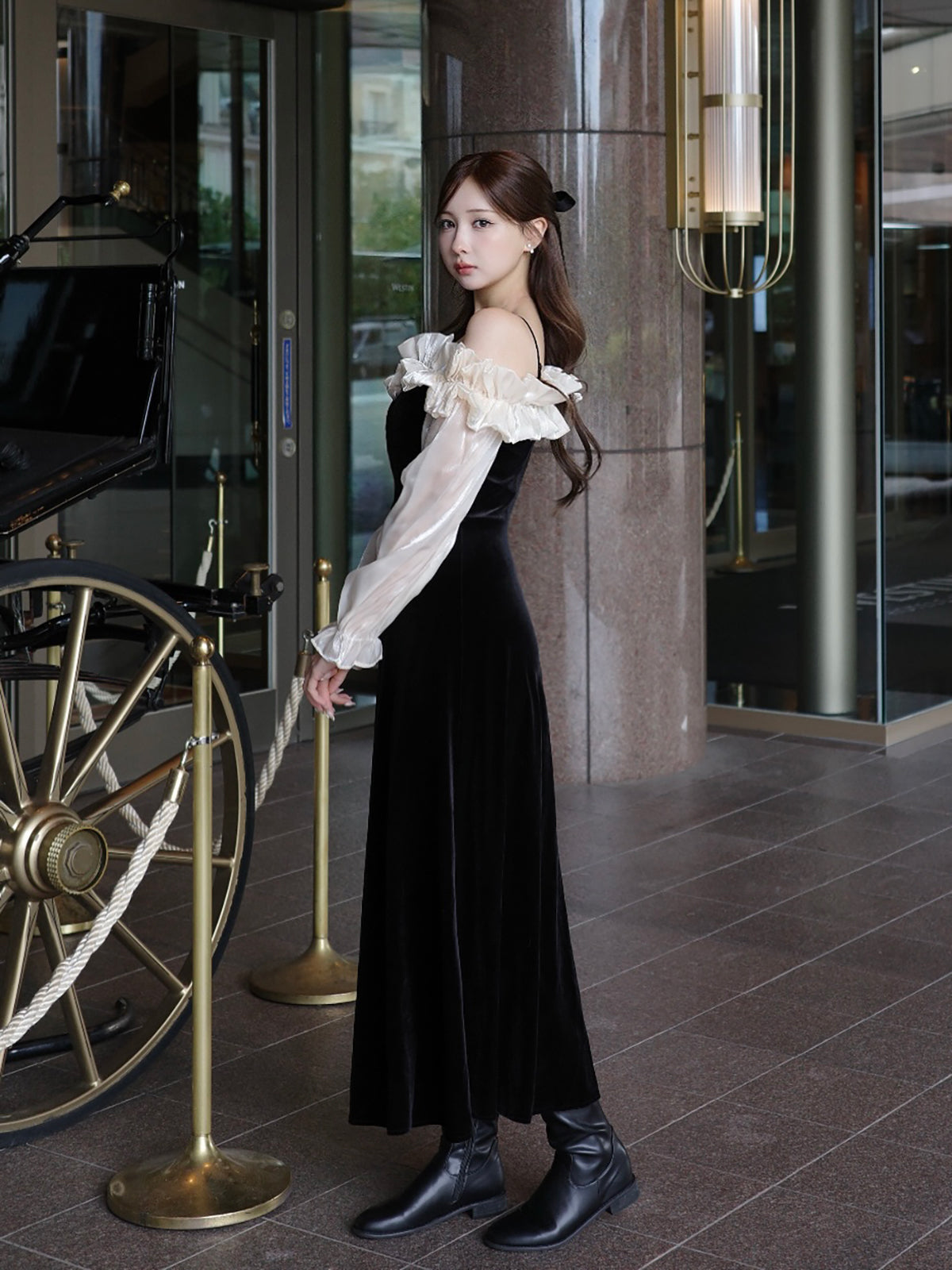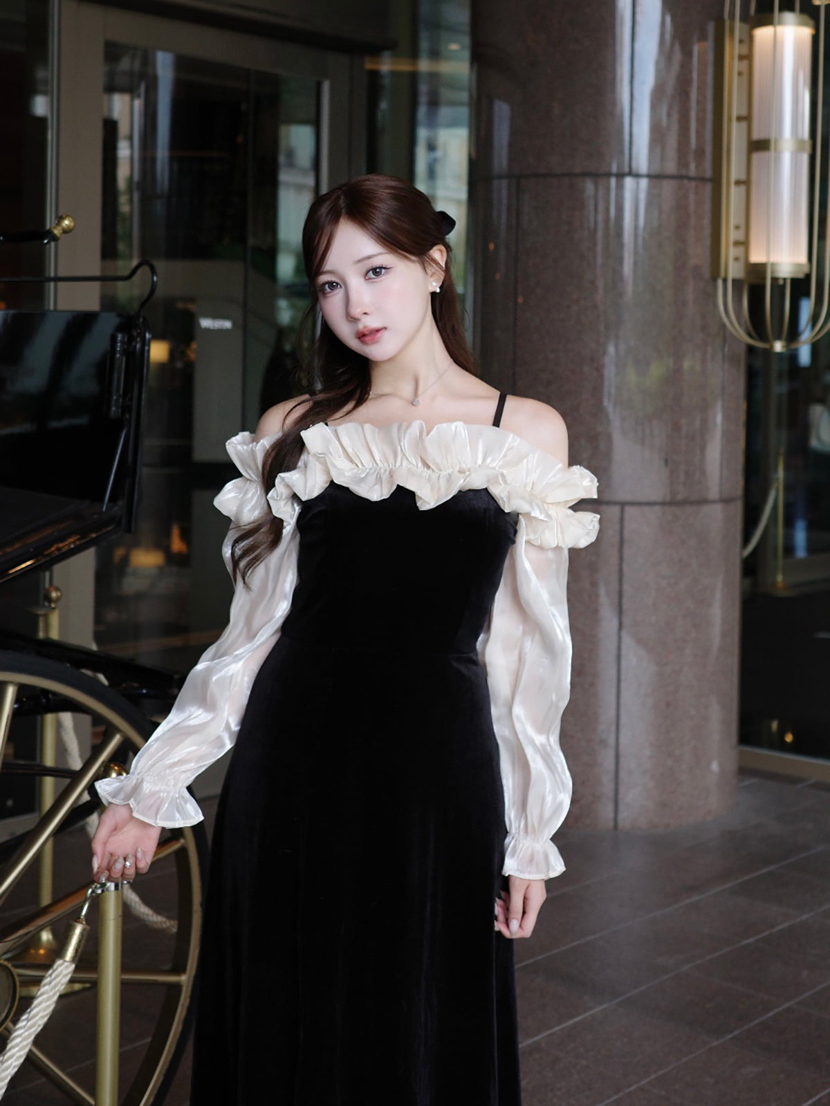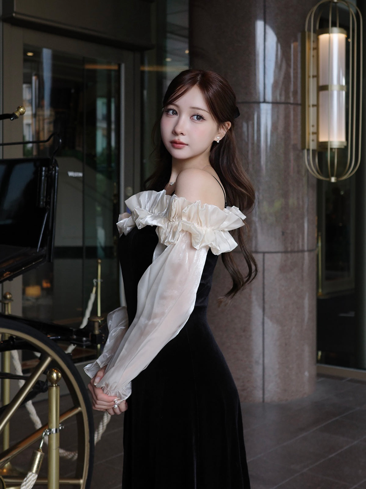 肩まわりにあしらったフリルが目を引く、華やかなオフショルダーワンピース。