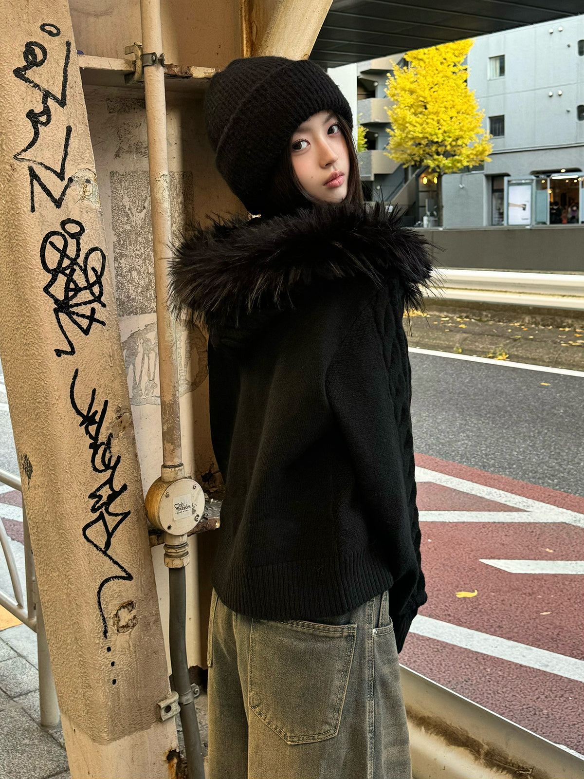ボリューム感のあるファータッチフードが目を惹く、存在感たっぷりのフーディー。