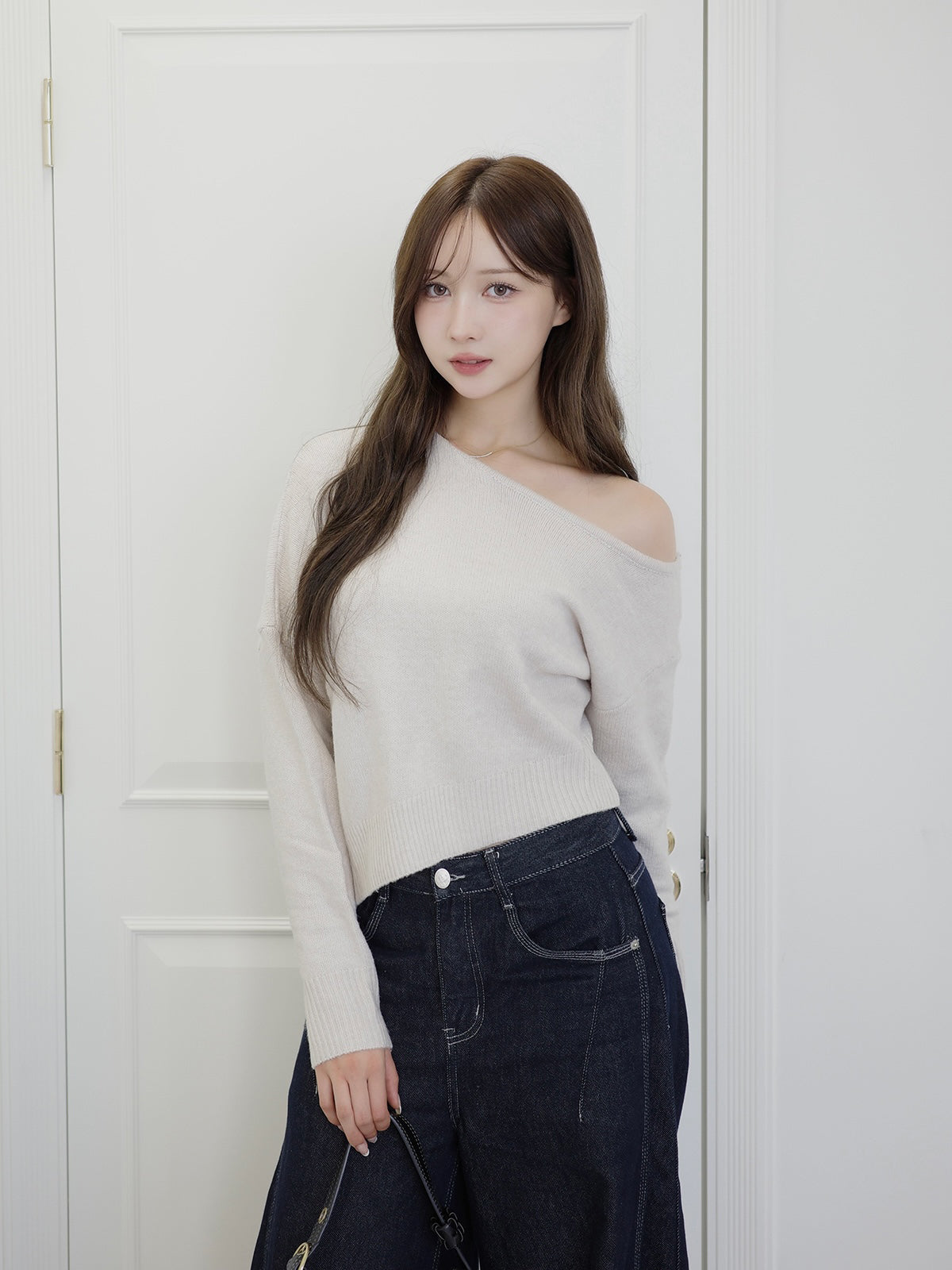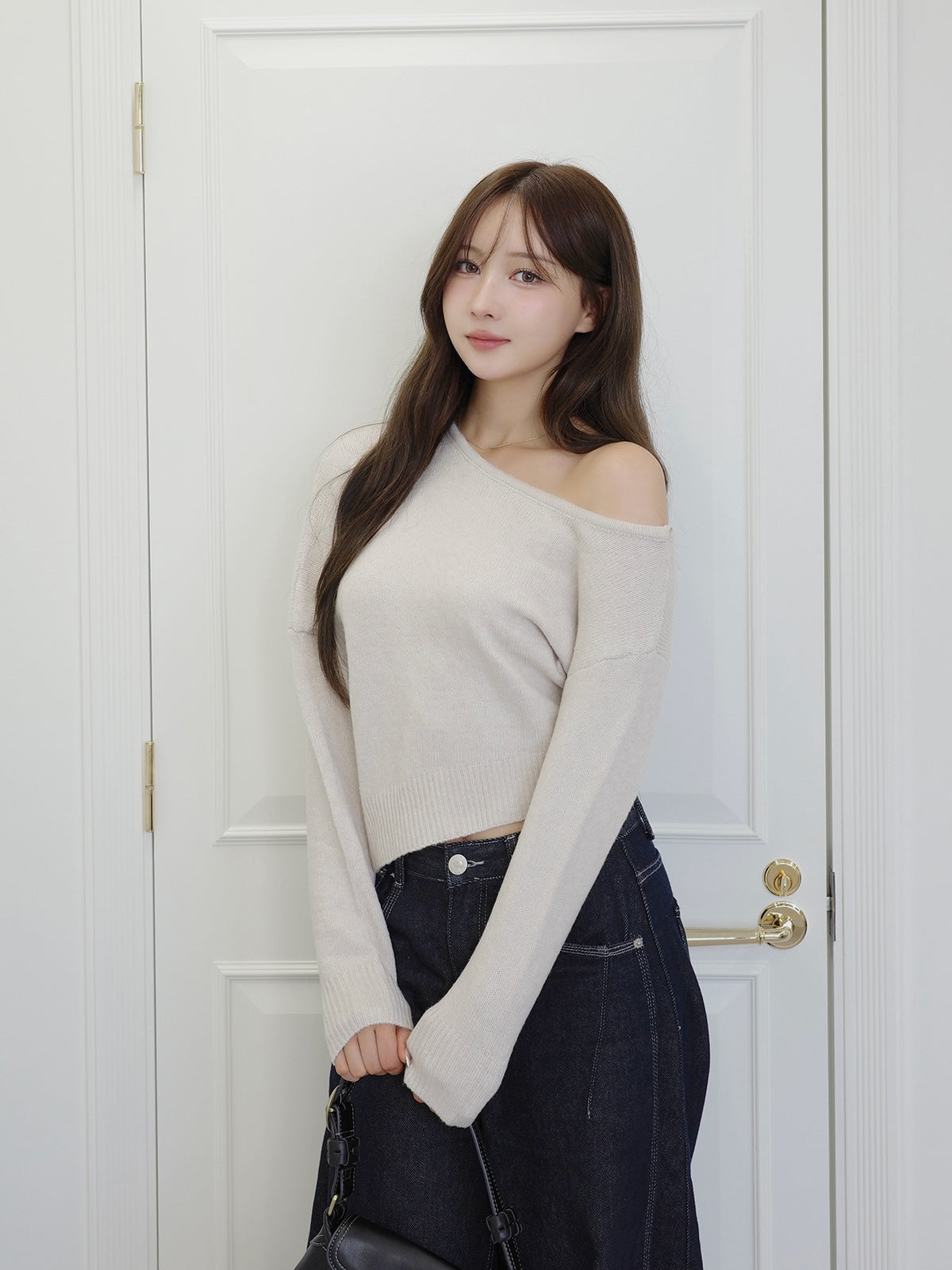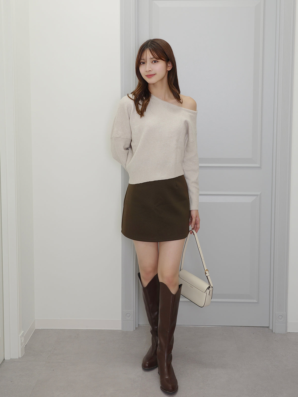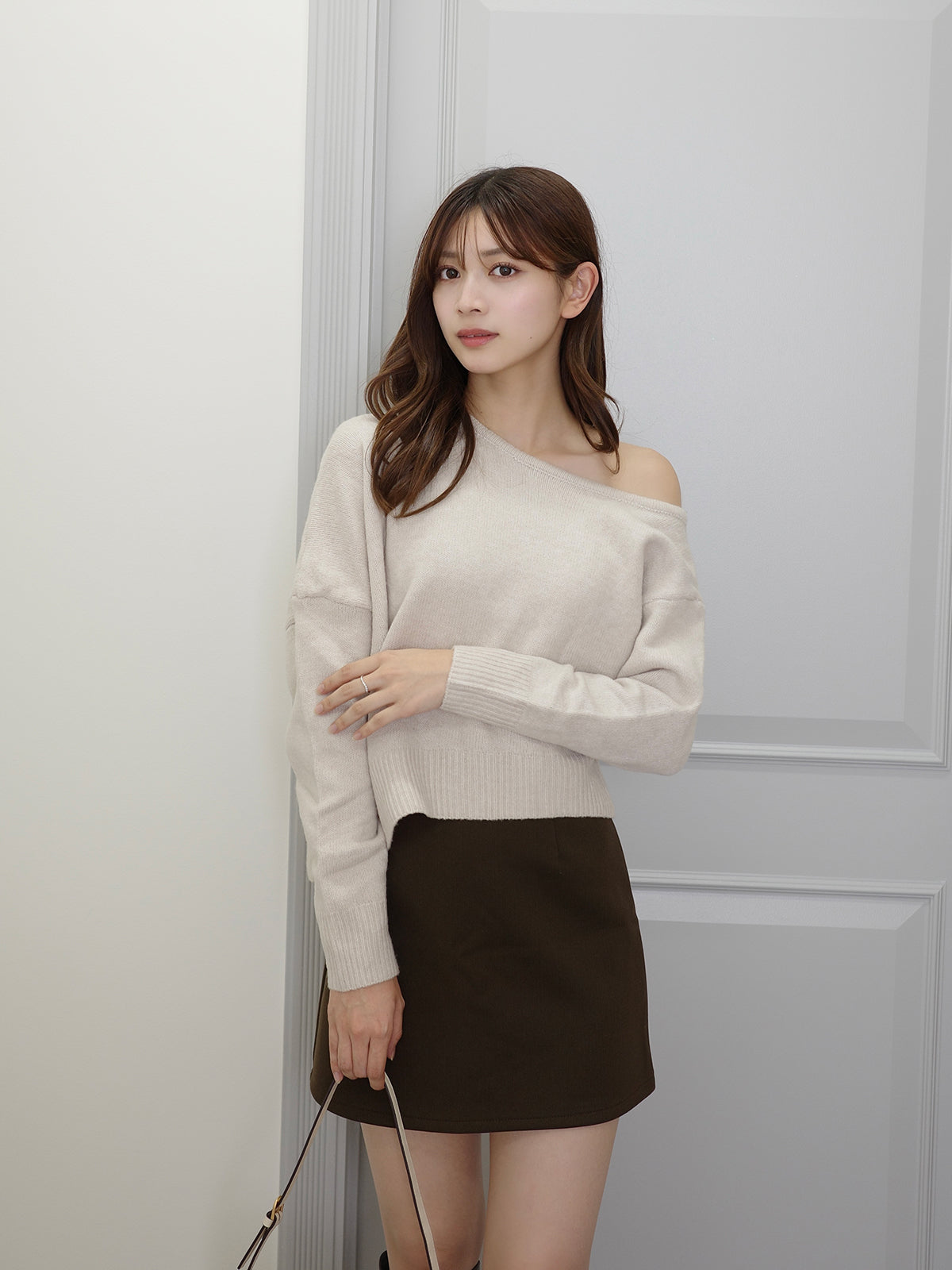 裾のラインが斜めにカットされている一癖ワンショルニット。