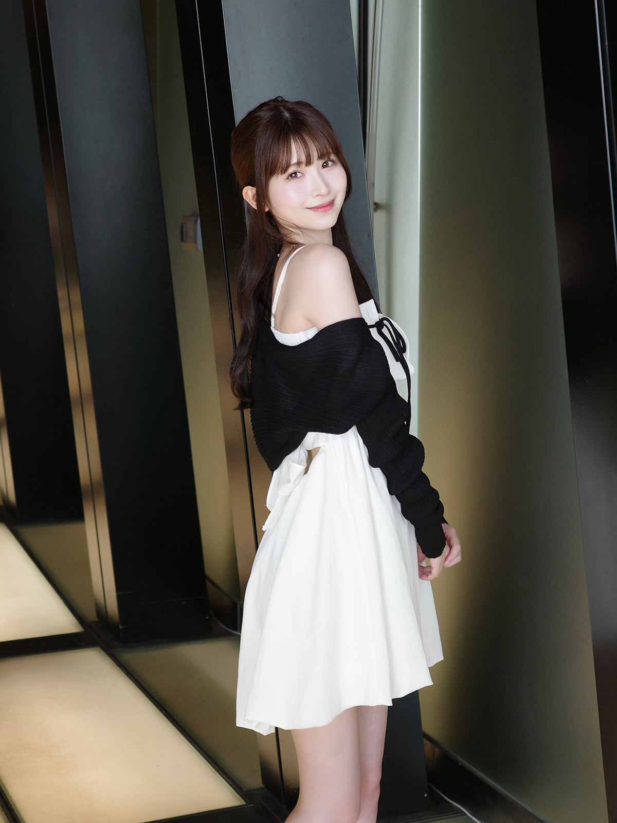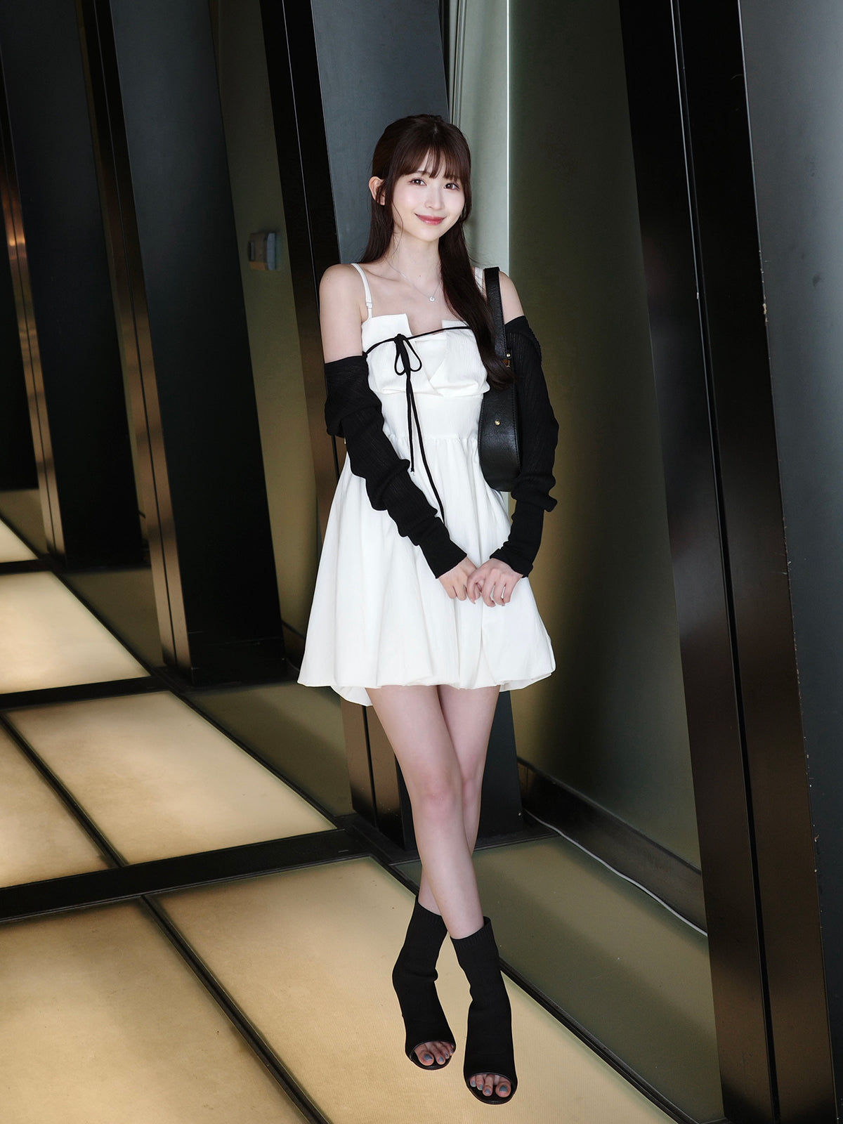 背中の開きとリボンディテールがヘルシーな抜け感を演出しつつ、バルーンシルエットのスカートがふんわりと立体感をプラス。