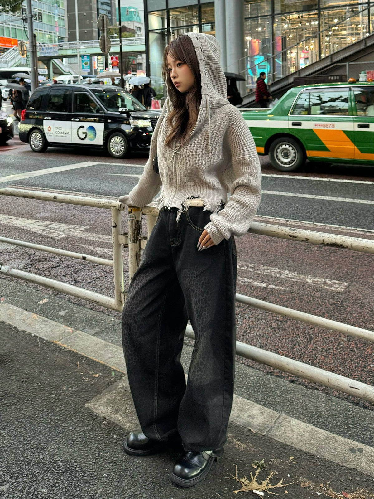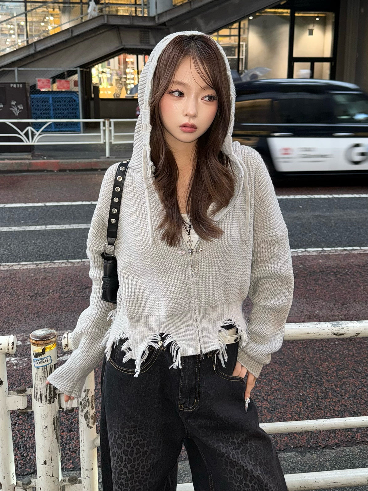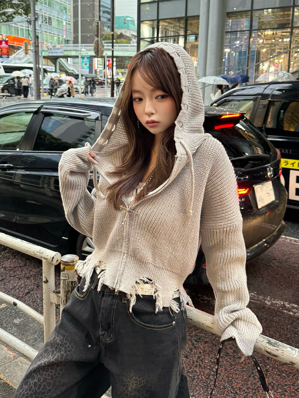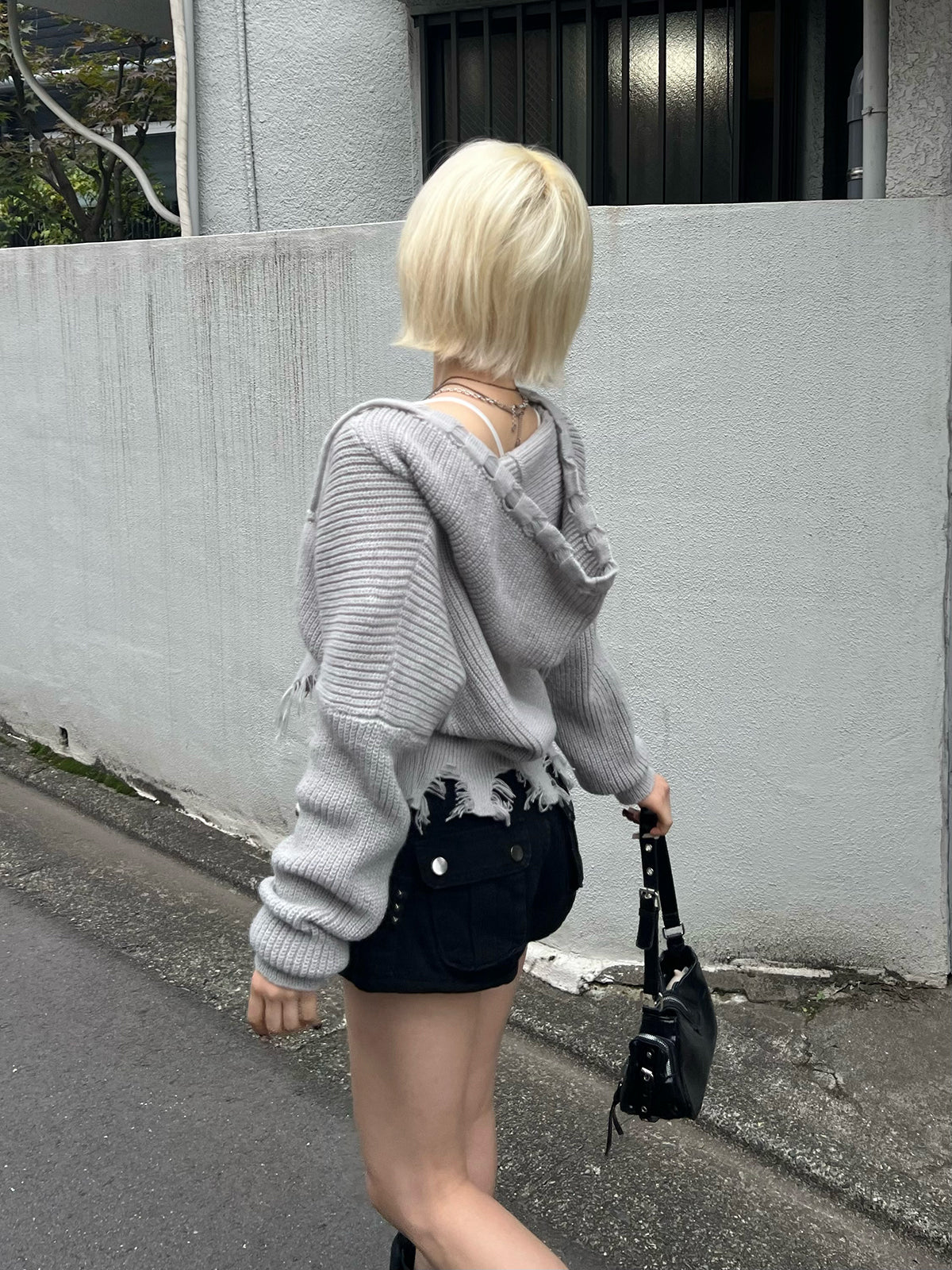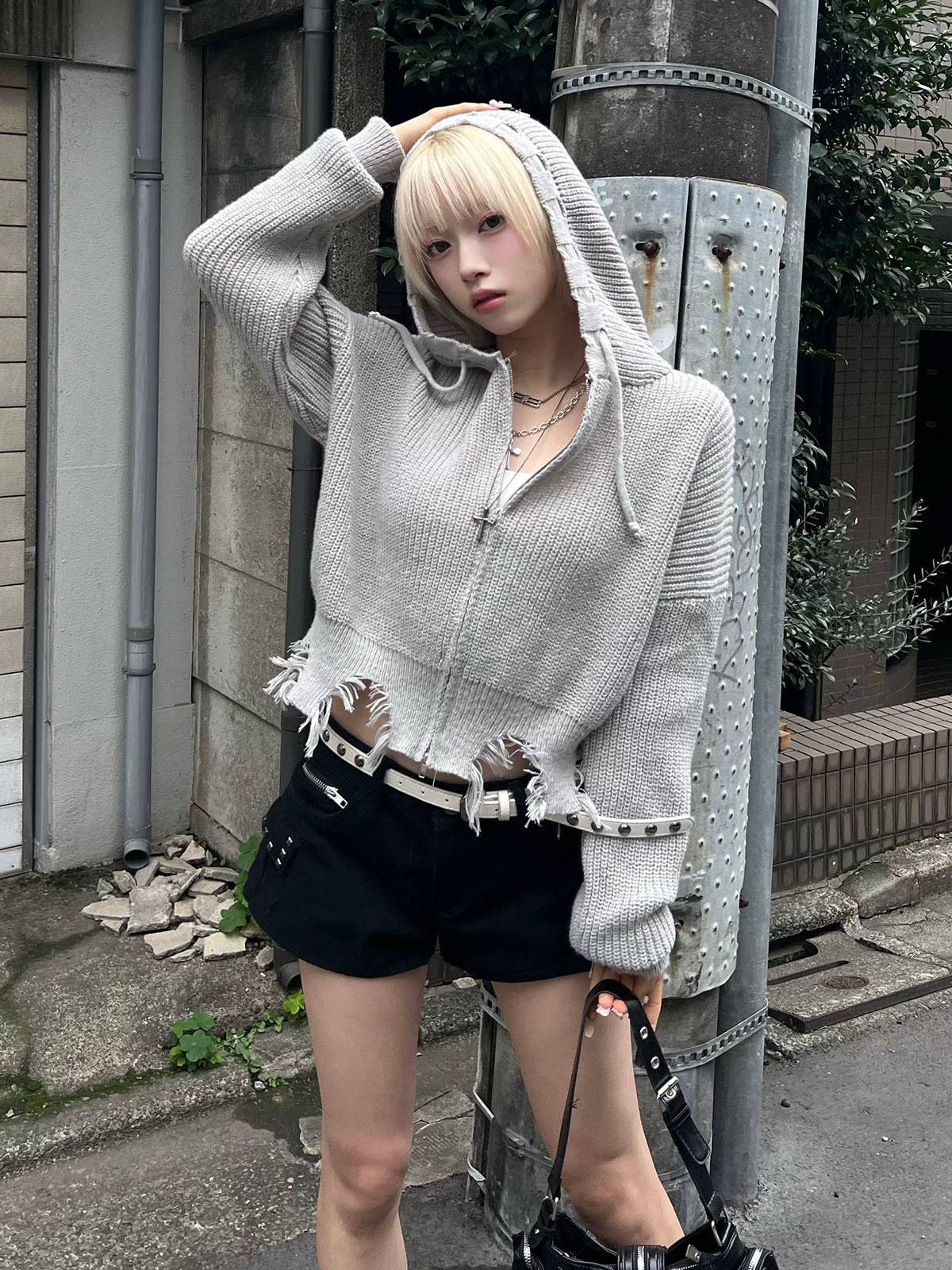 ダメージフリンジニットパーカー