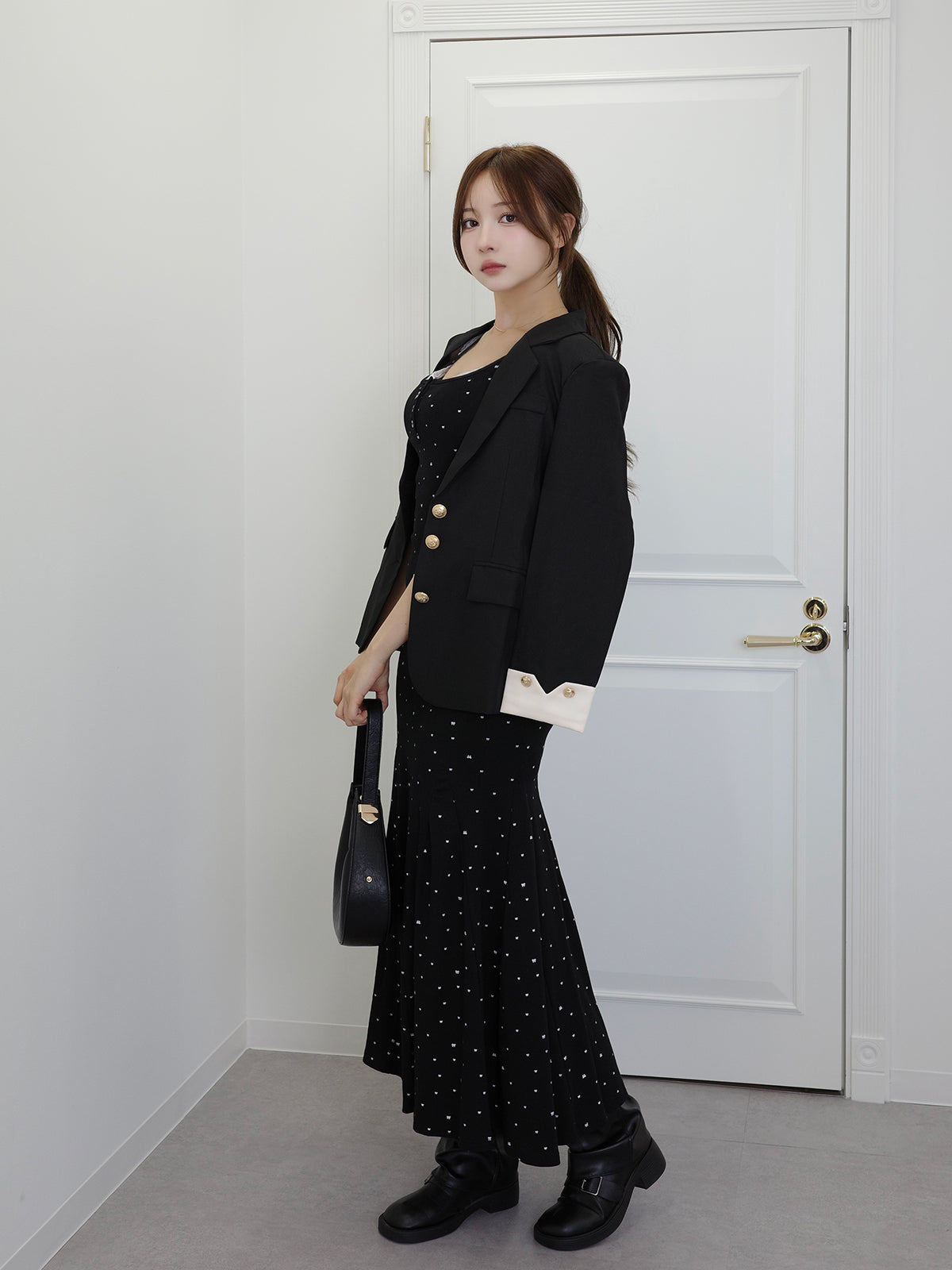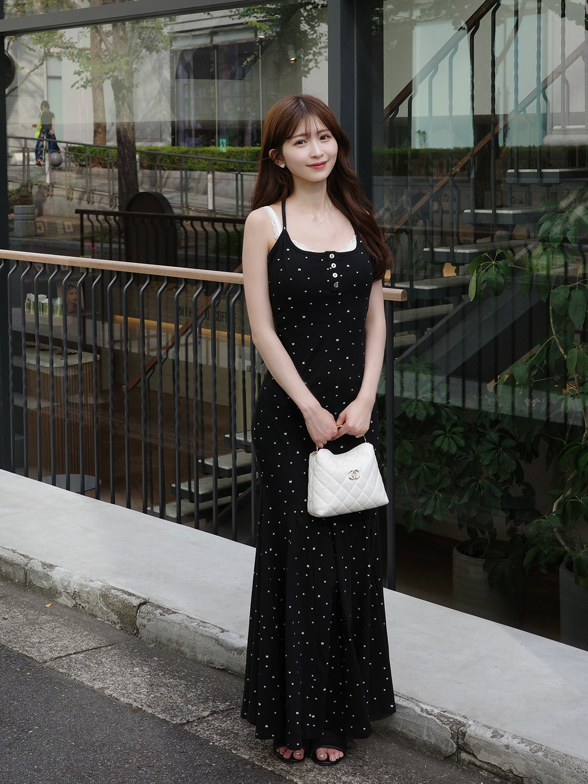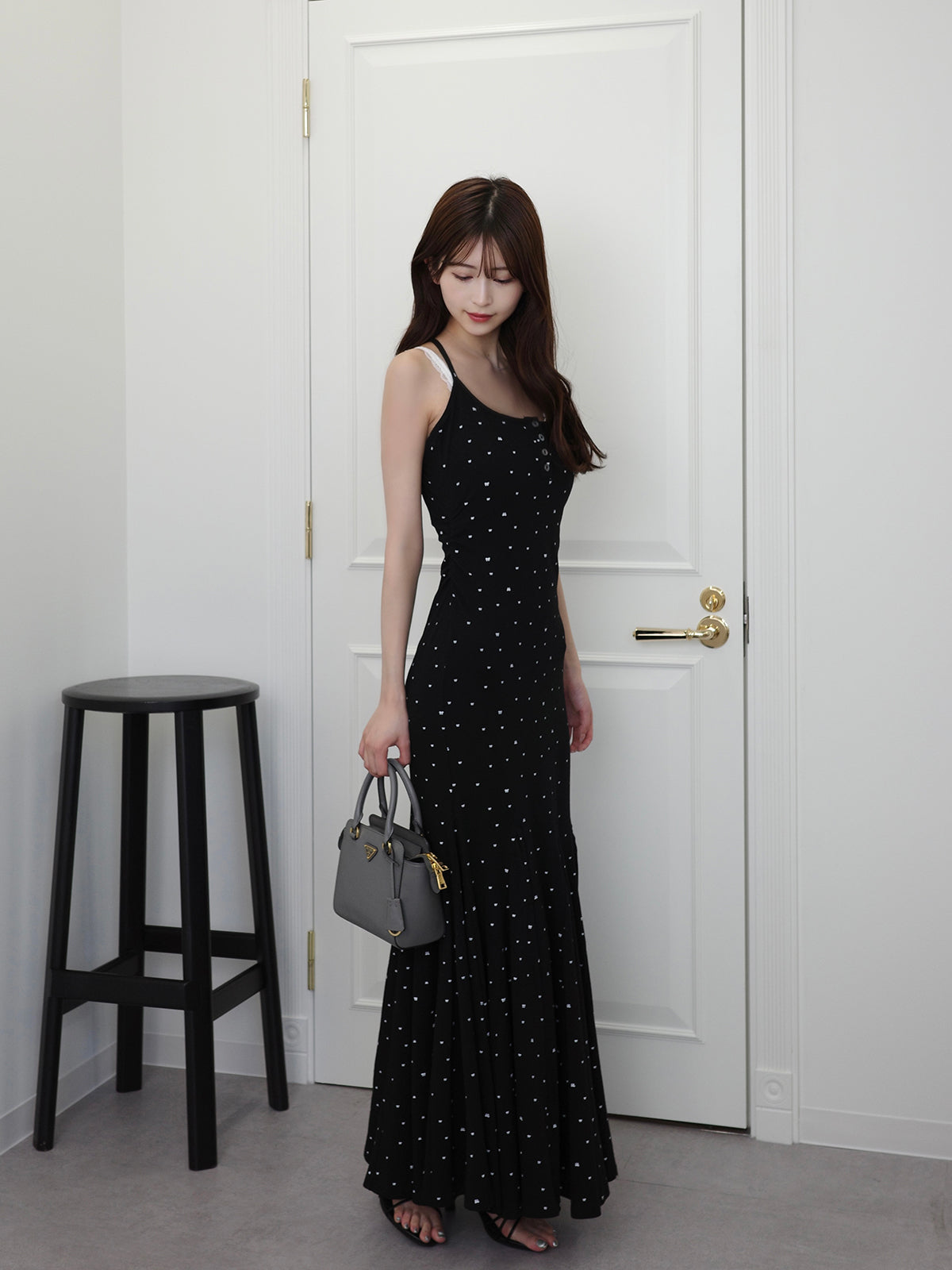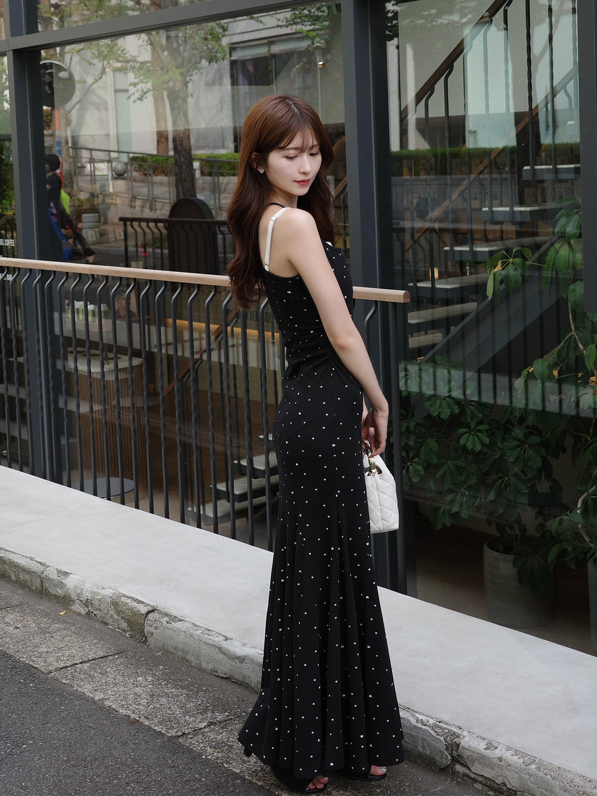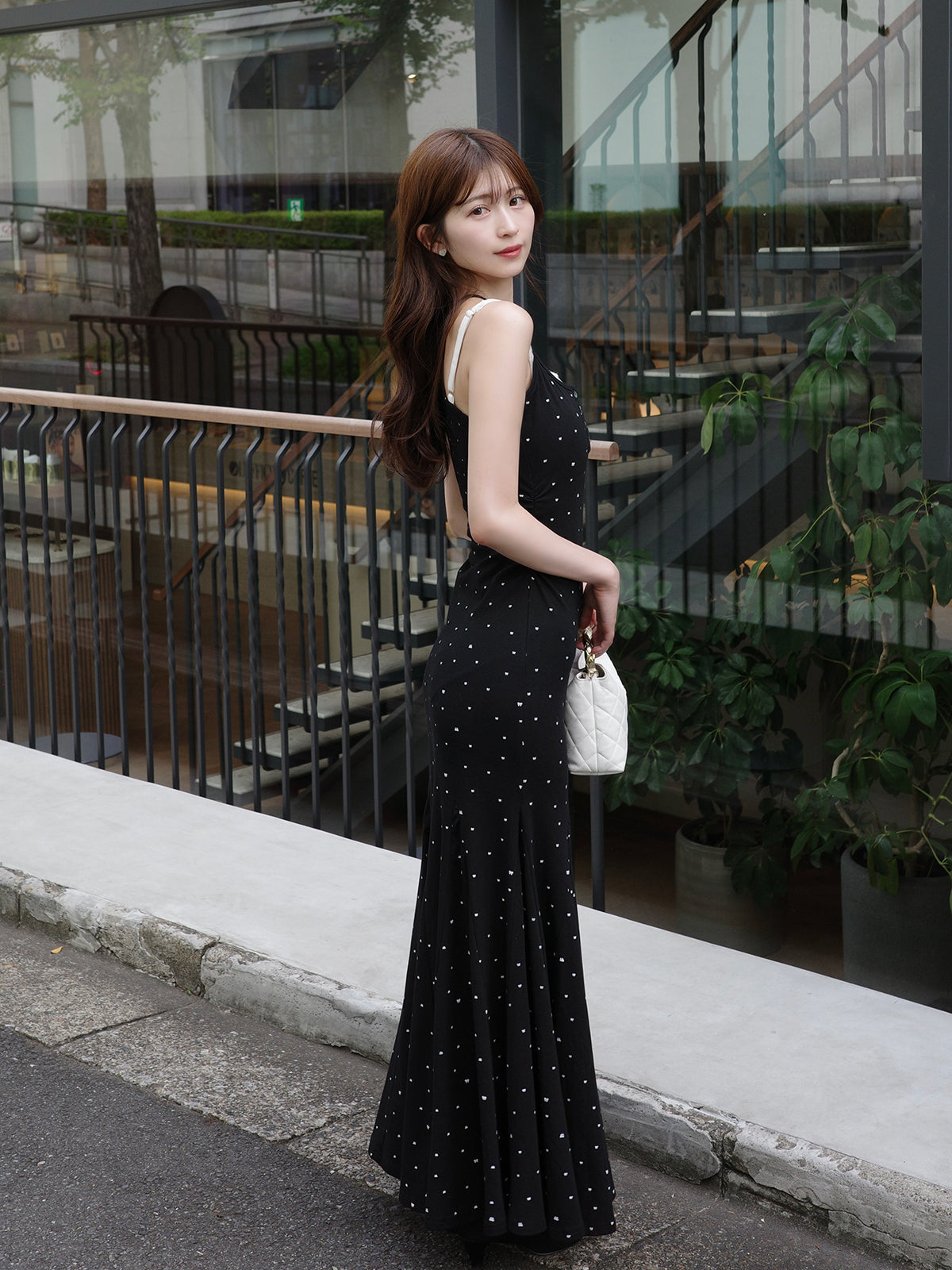 身体のラインに沿って美しく広がるマーメイドシルエットが、歩くたびに揺れて上品な印象を演出します。