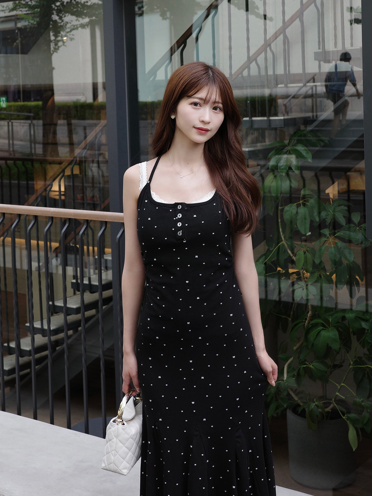 リボンプリントが散りばめられたデザインに、カップ付きのキャミソールをドッキングしたワンピース。