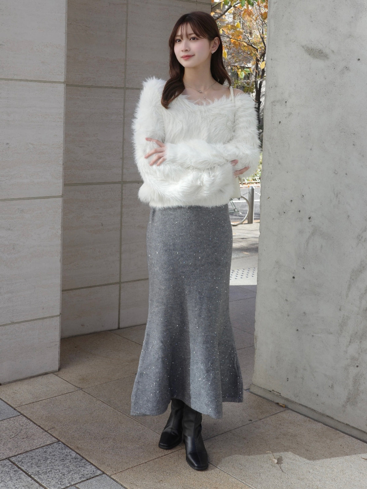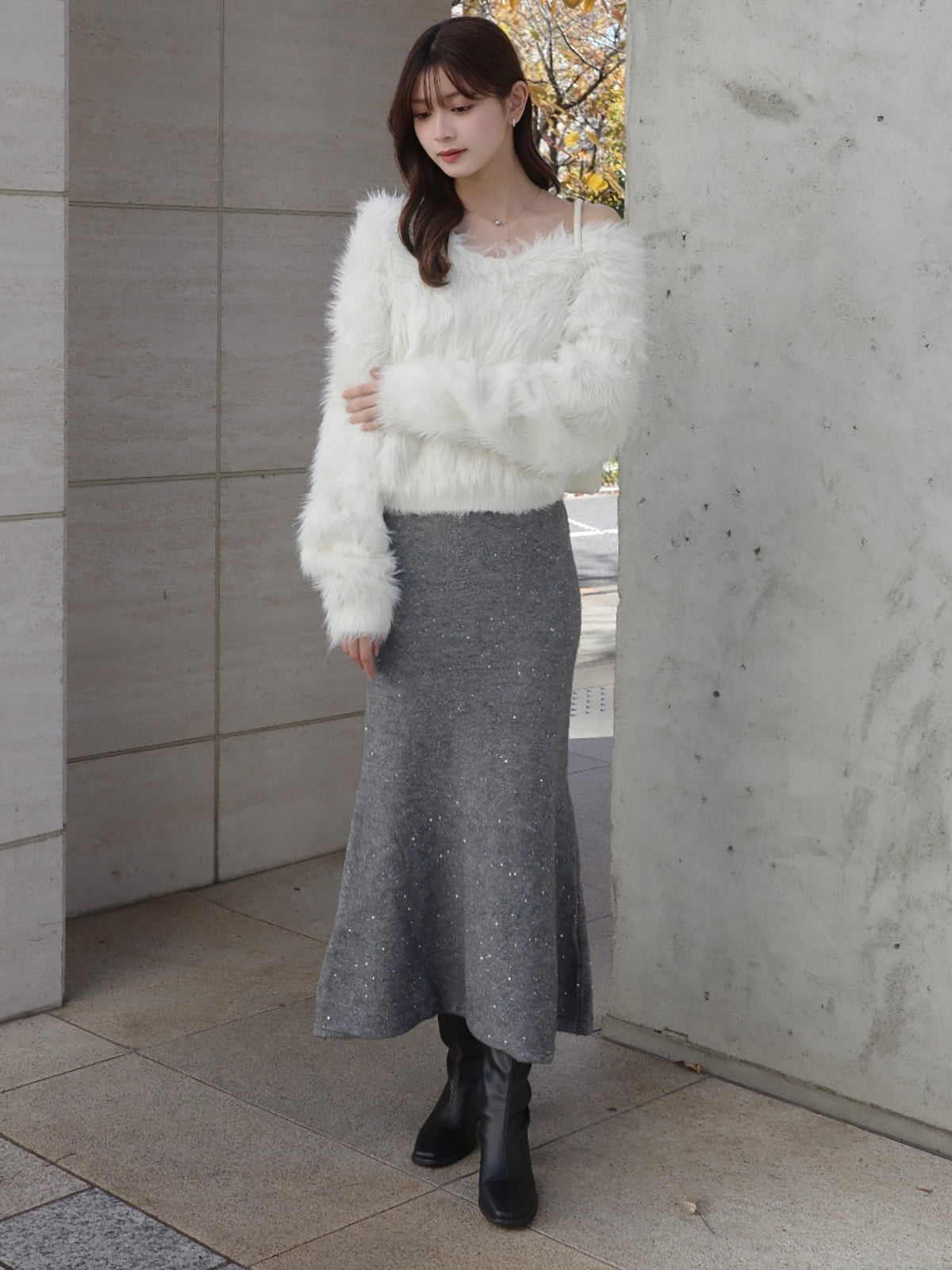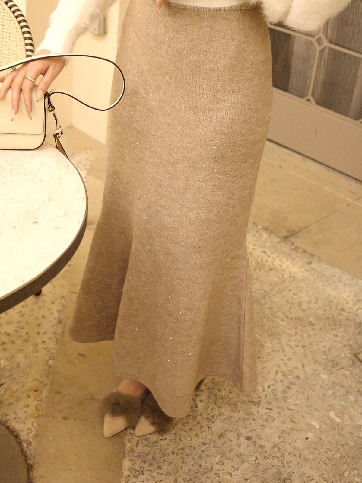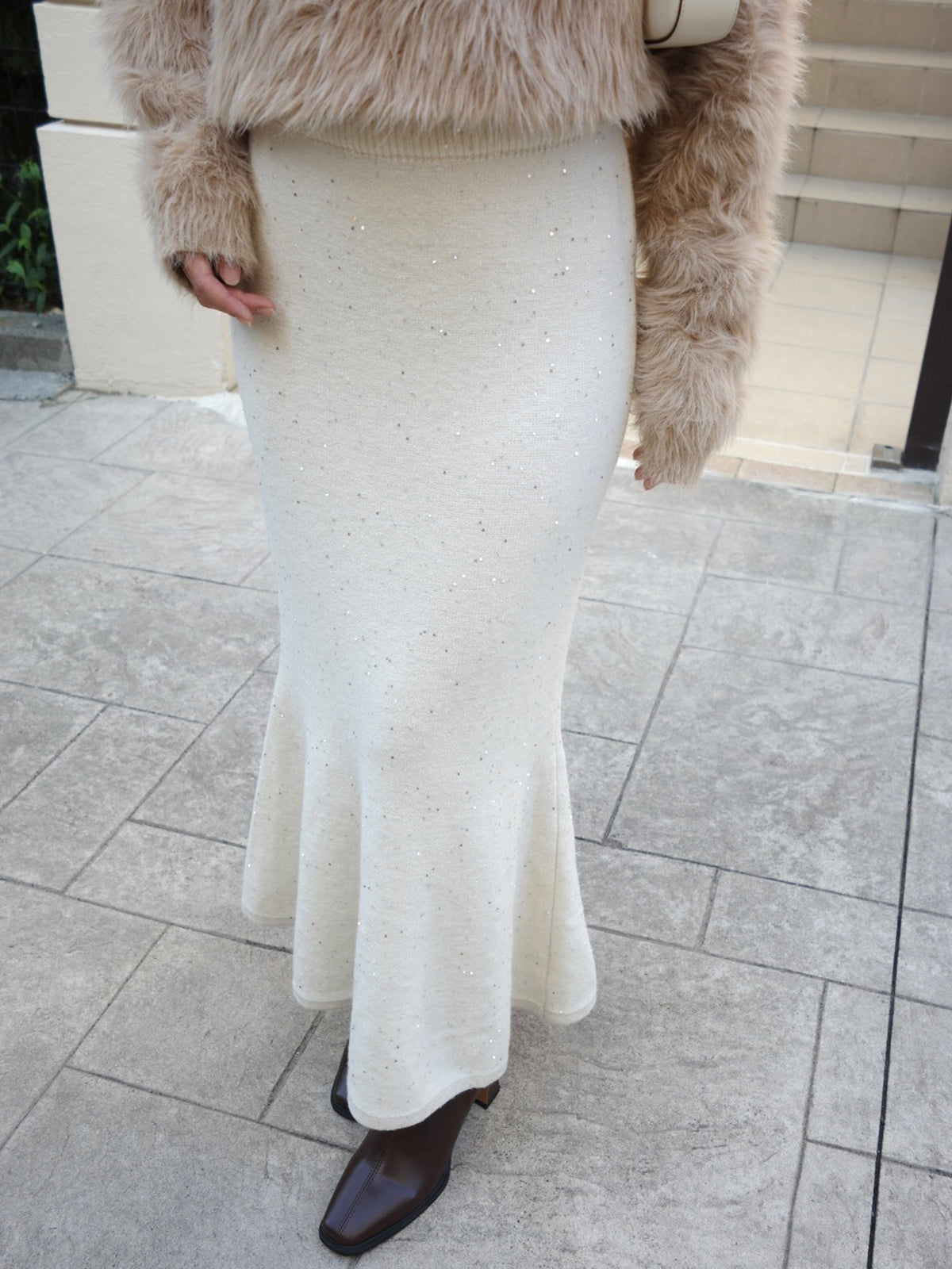 きらめくスパンコールラメが、動くたびにさりげない輝きを添えるニットスカート。