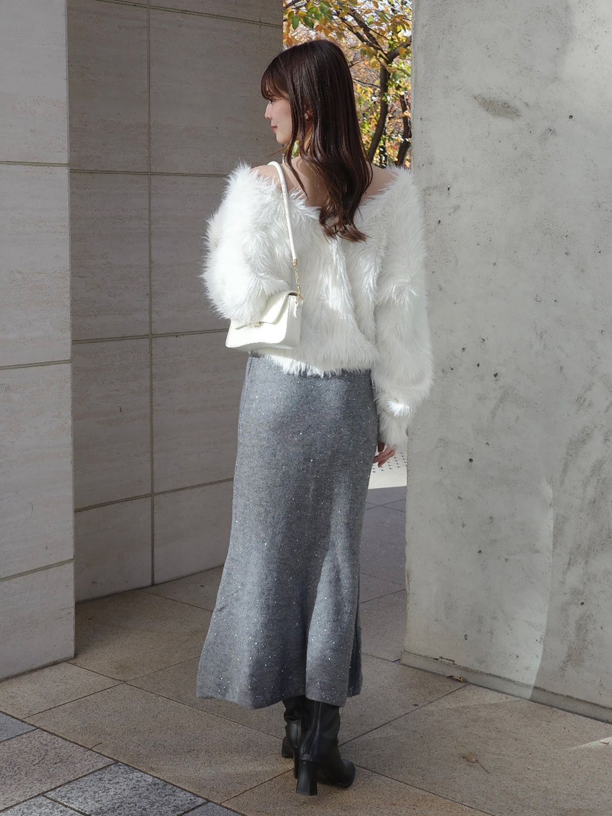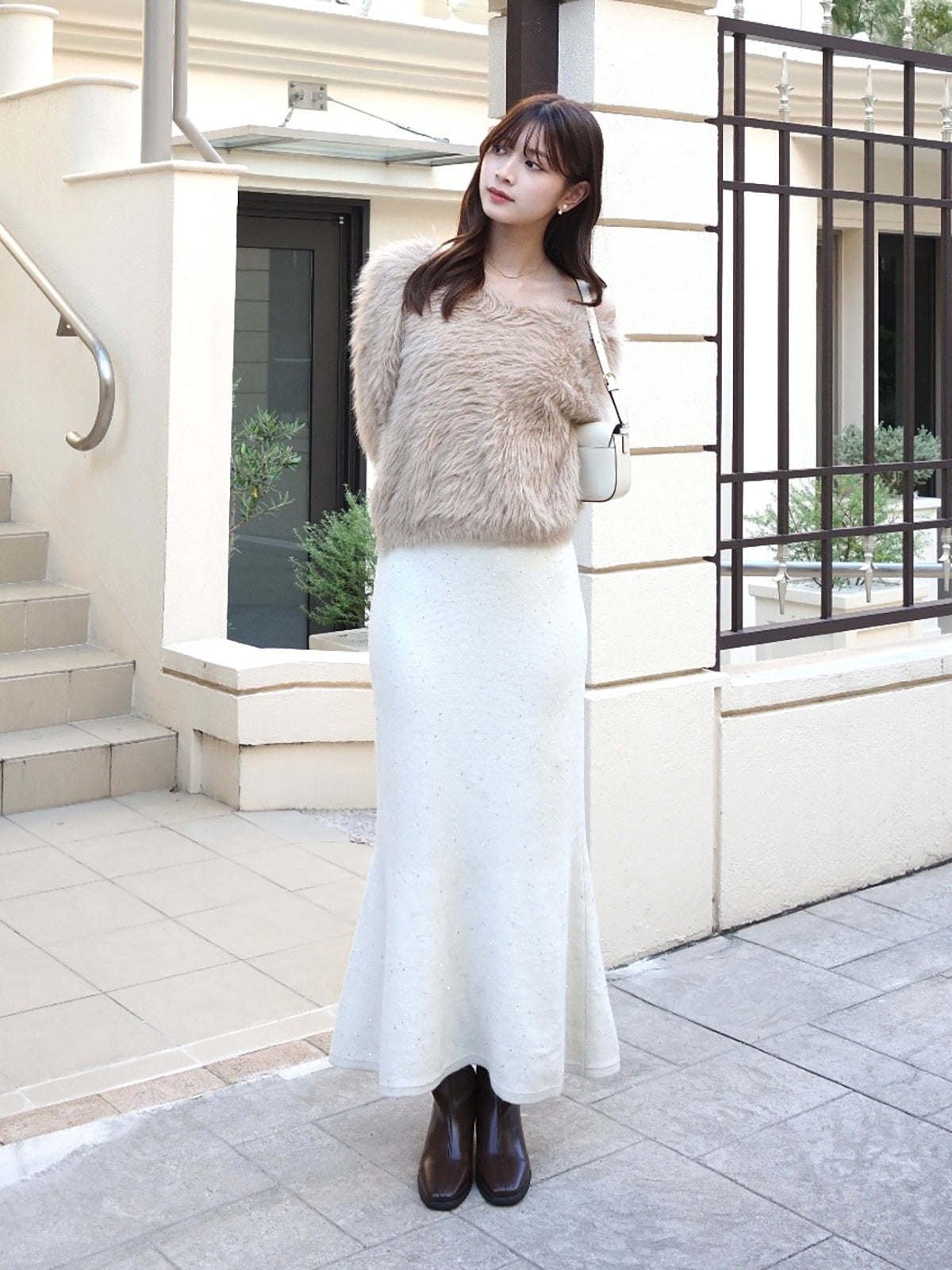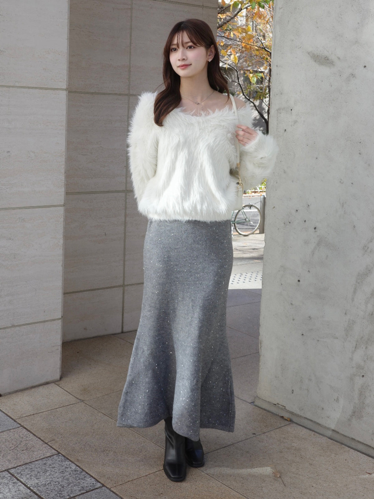 きらめくスパンコールラメが、動くたびにさりげない輝きを添えるニットスカート。