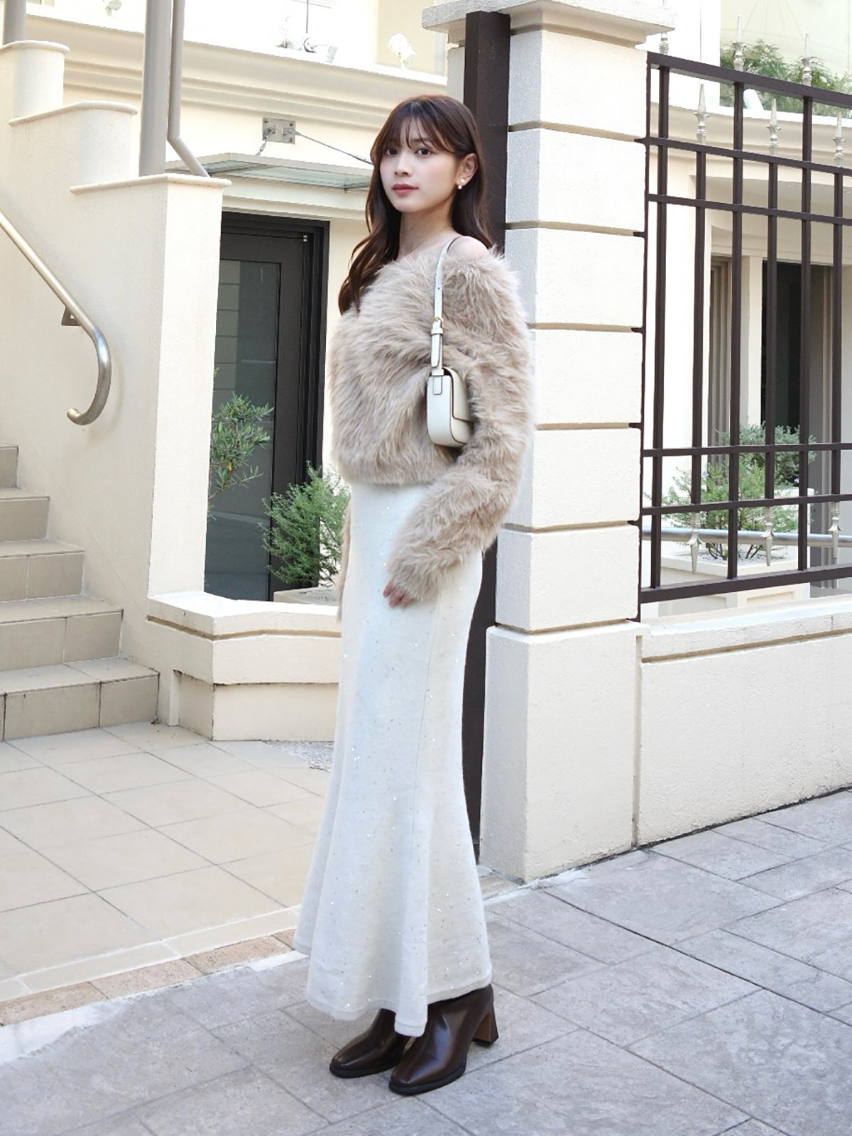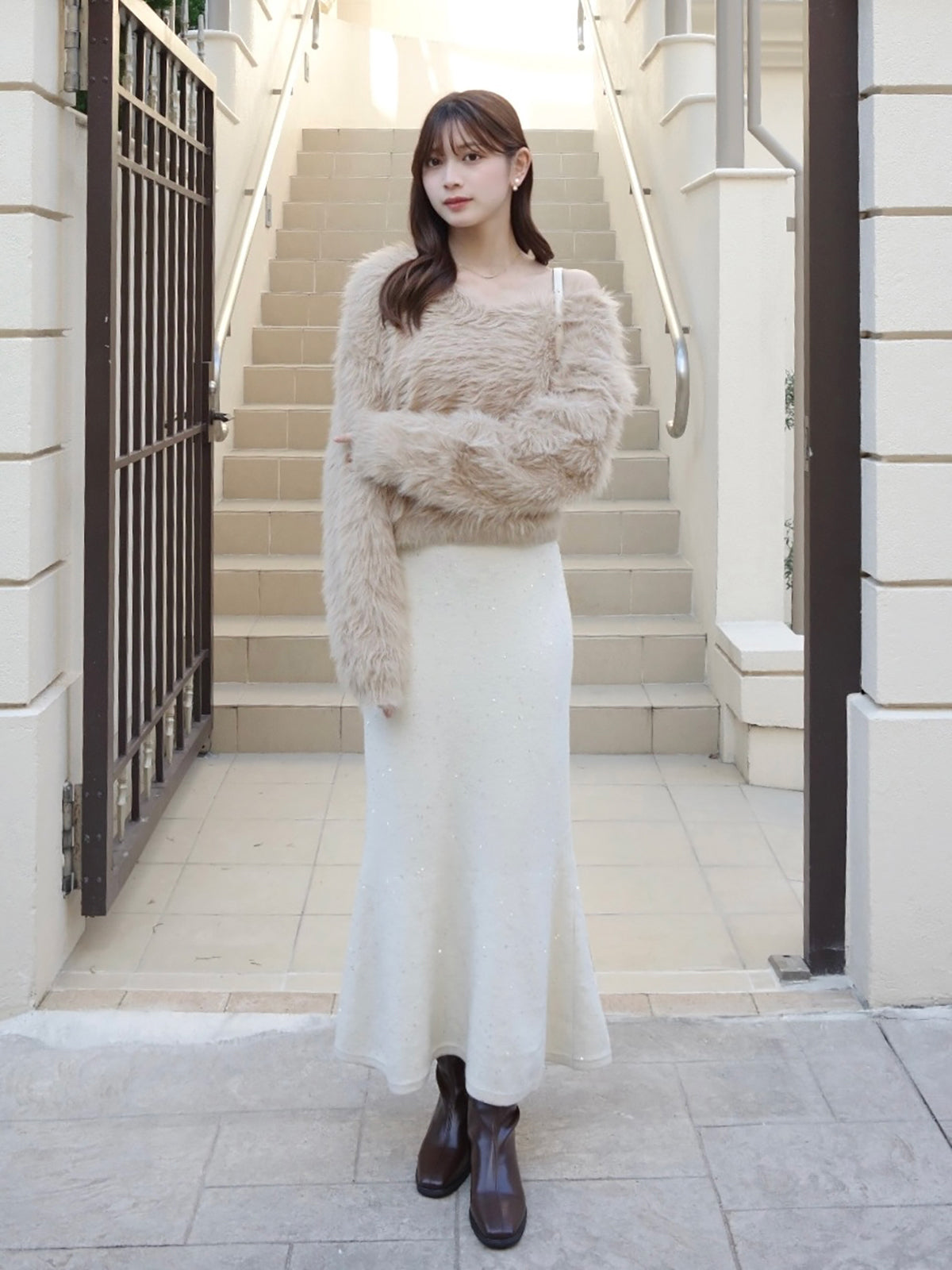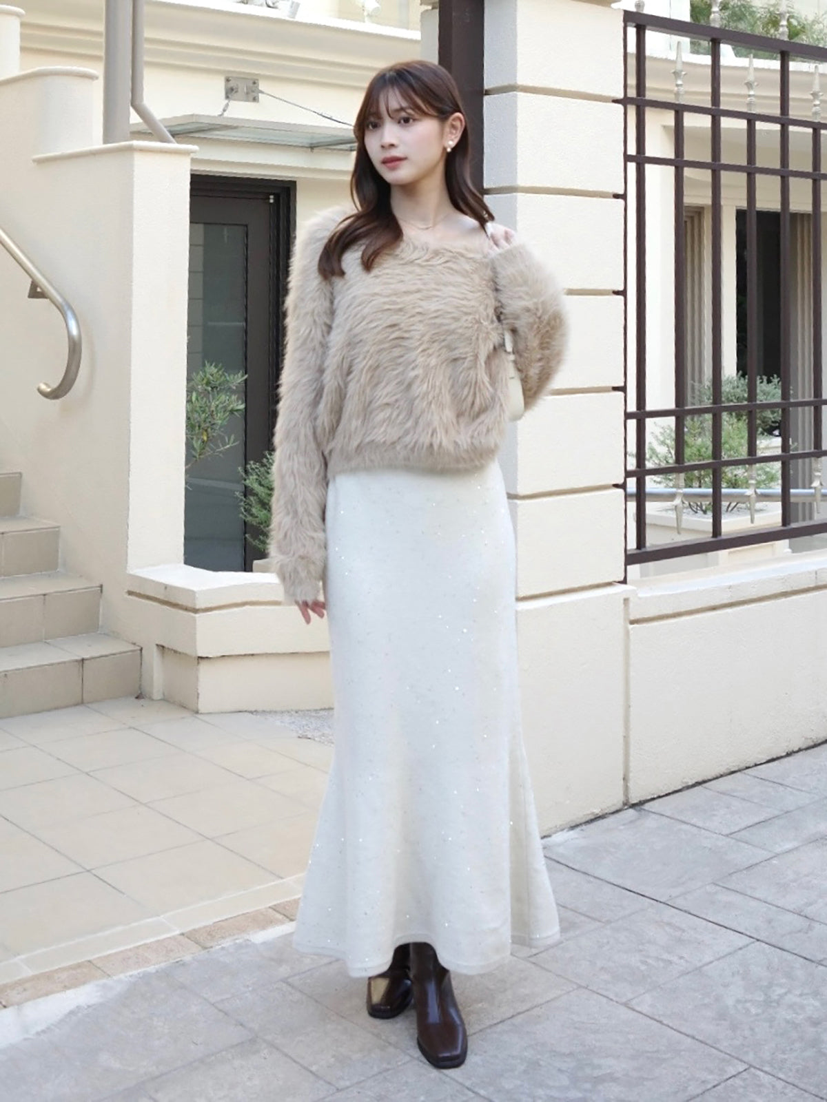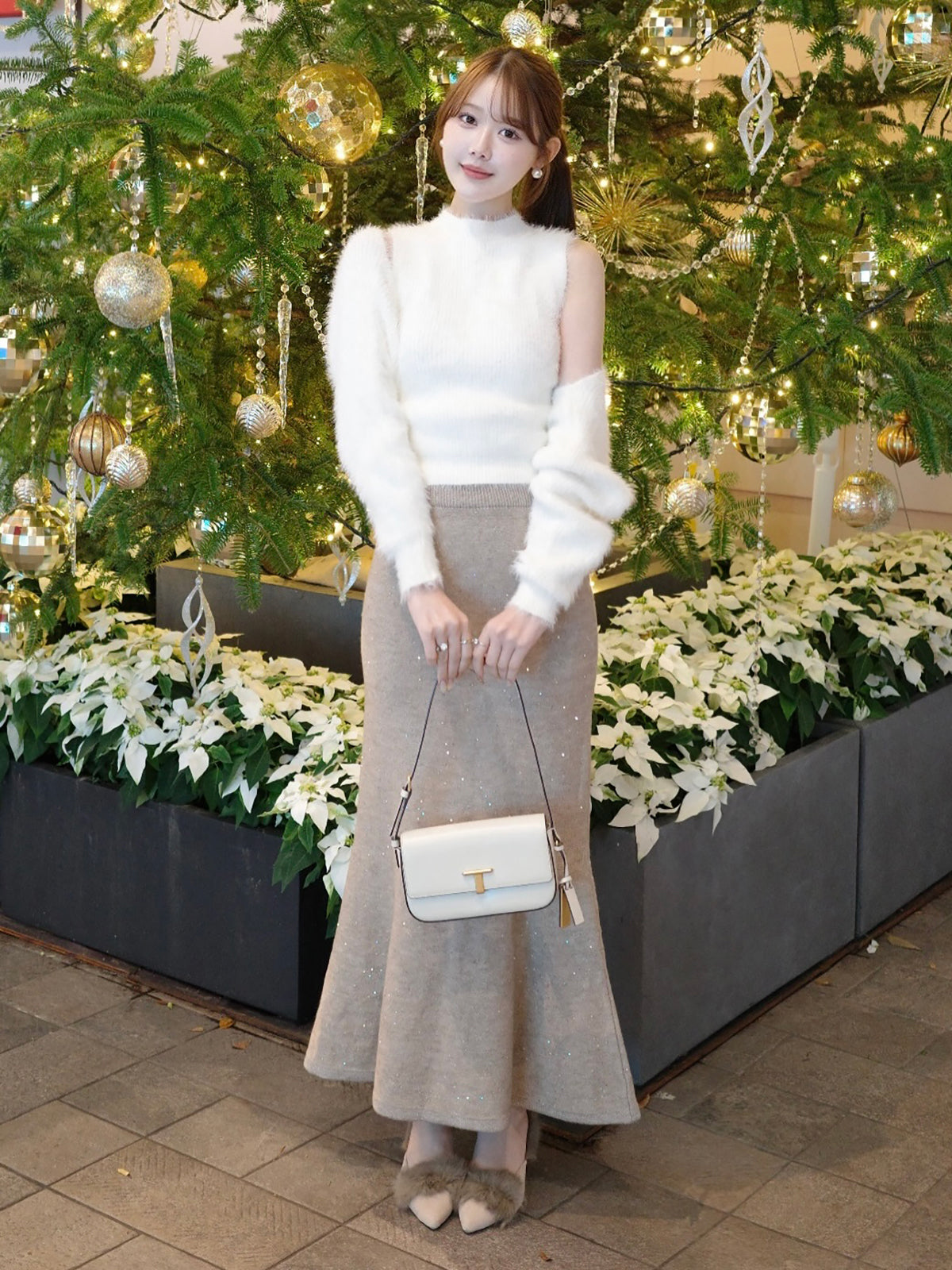 きらめくスパンコールラメが、動くたびにさりげない輝きを添えるニットスカート。