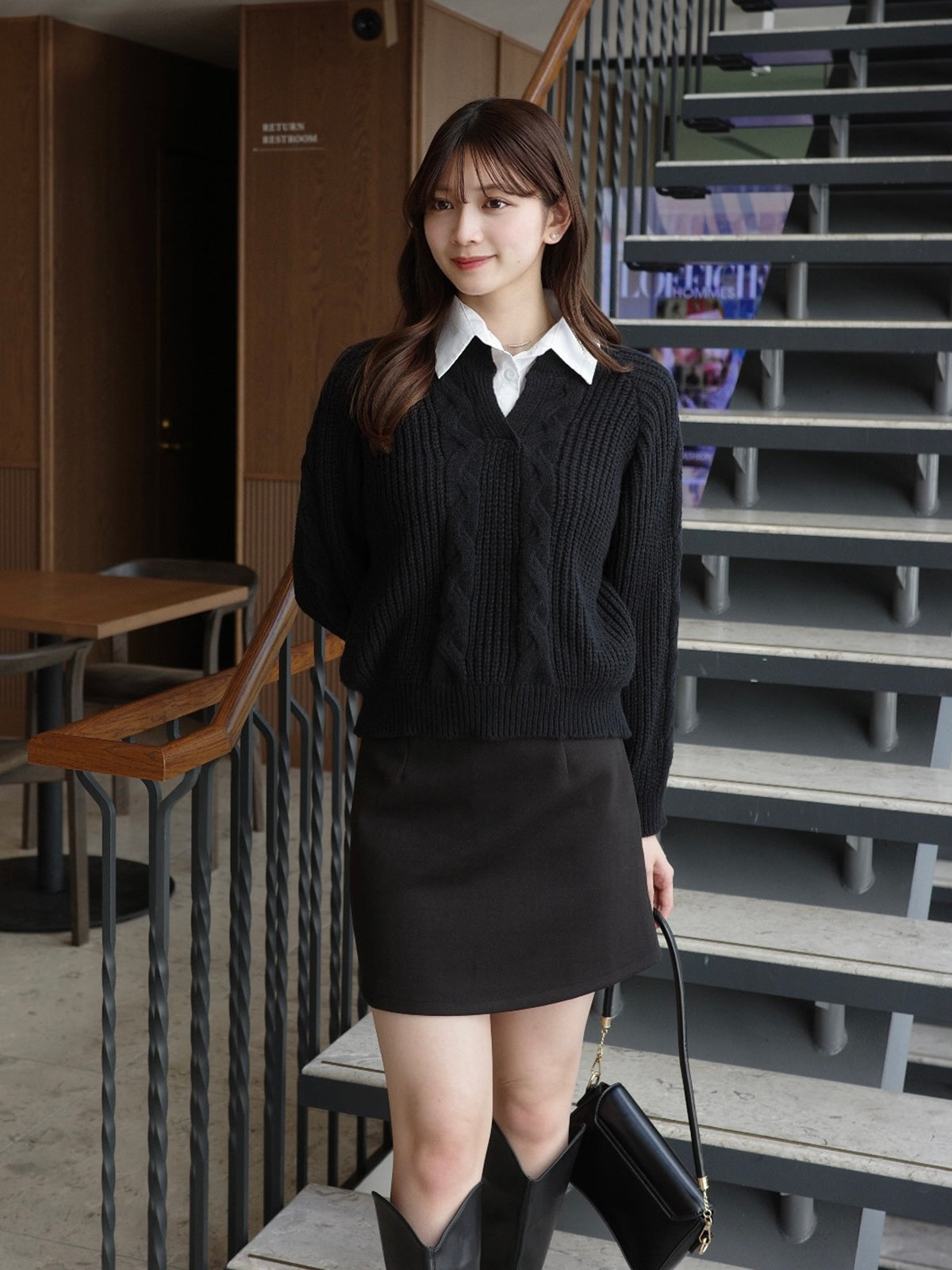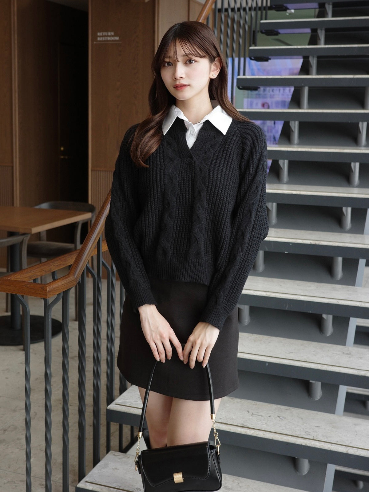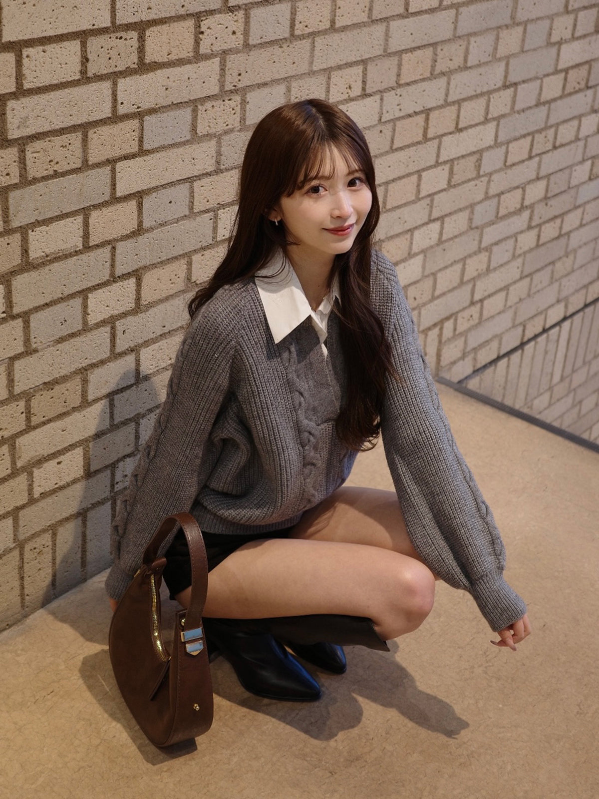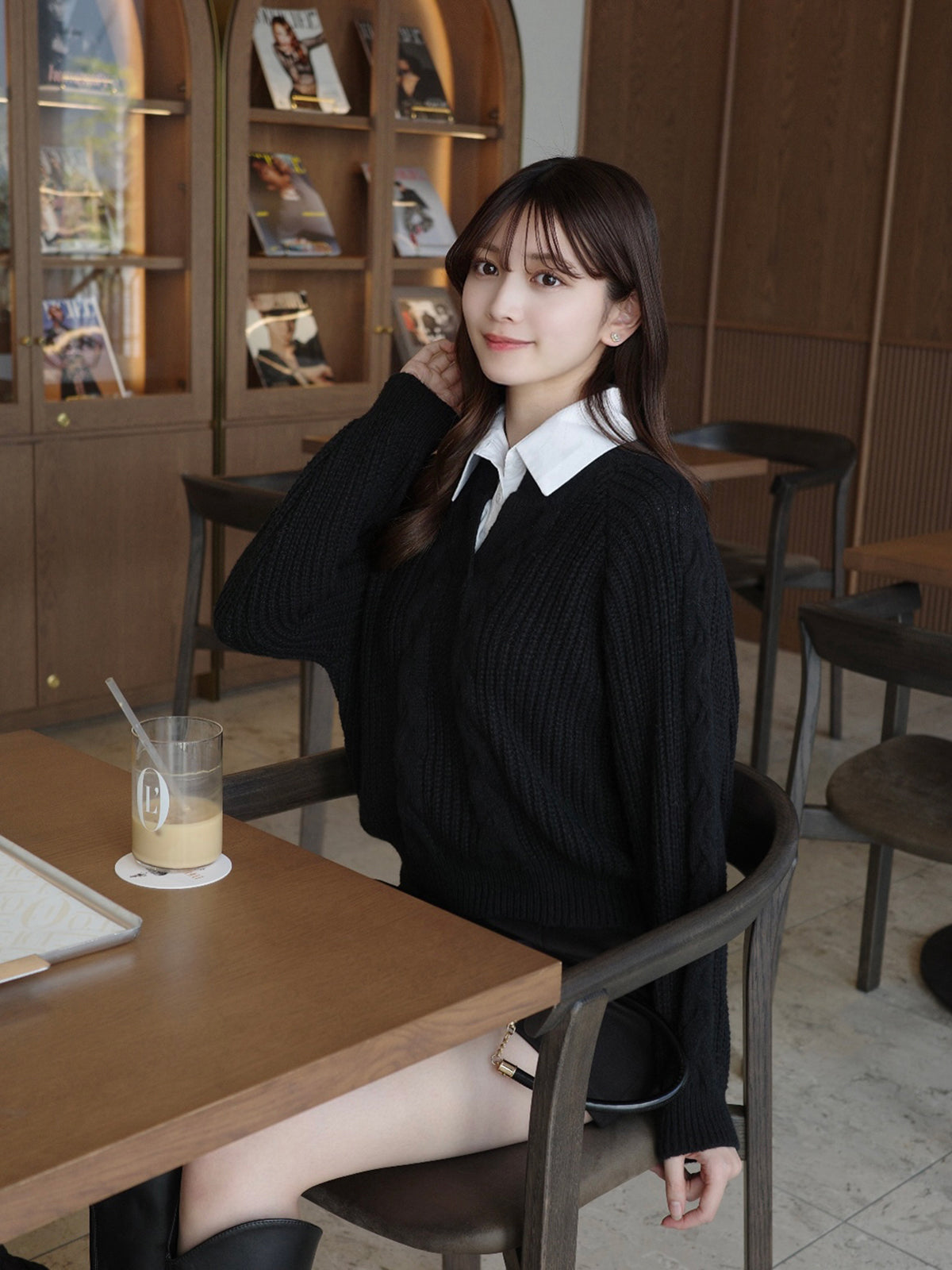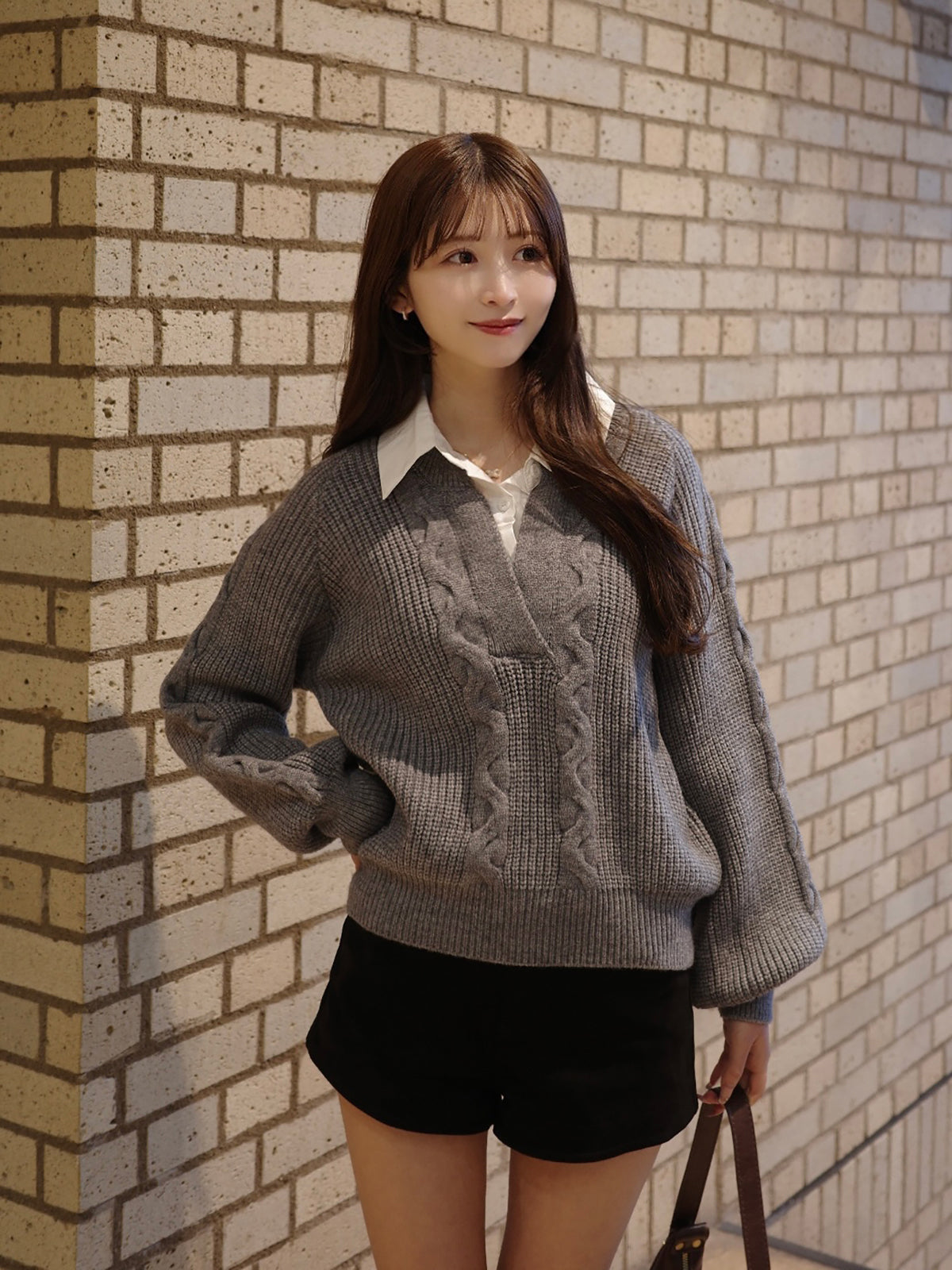 シャツを重ね着したようなドッキングデザインが特徴のニット。