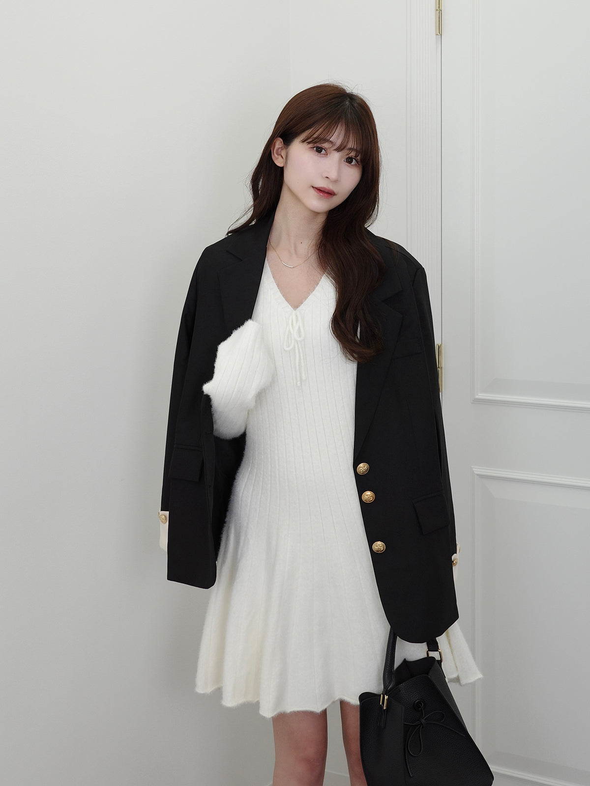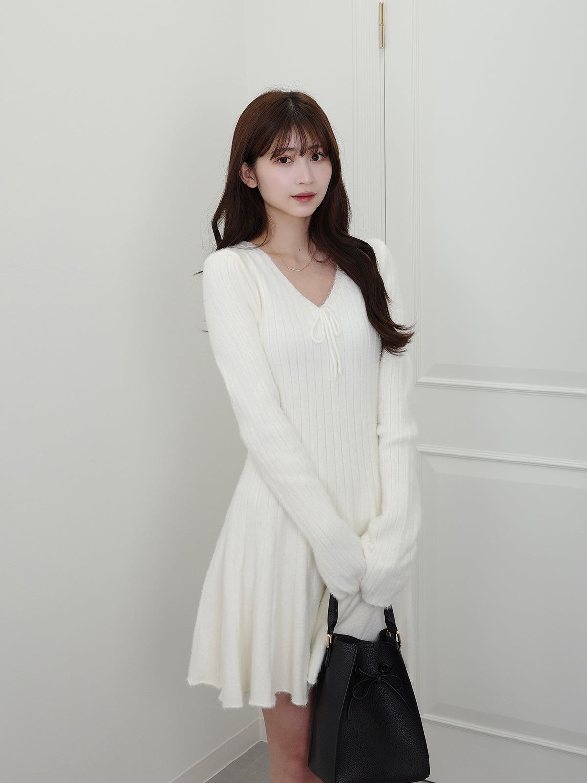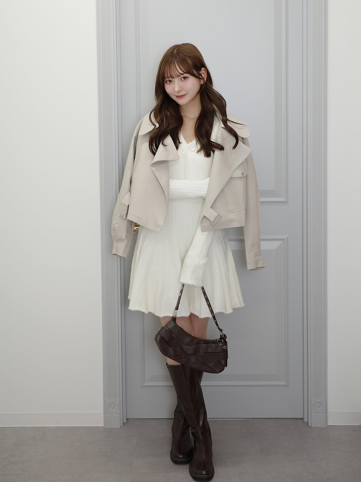 引き締められたウエストと、ミニ丈のフレアスカートが女性らしい印象に。