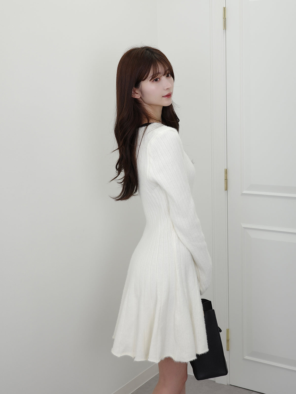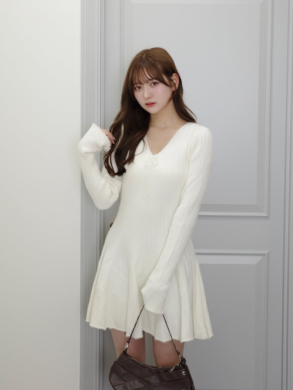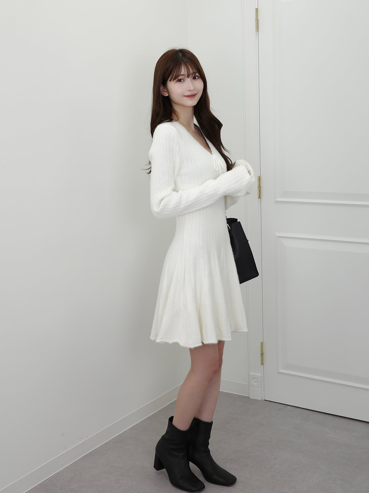 引き締められたウエストと、ミニ丈のフレアスカートが女性らしい印象に。