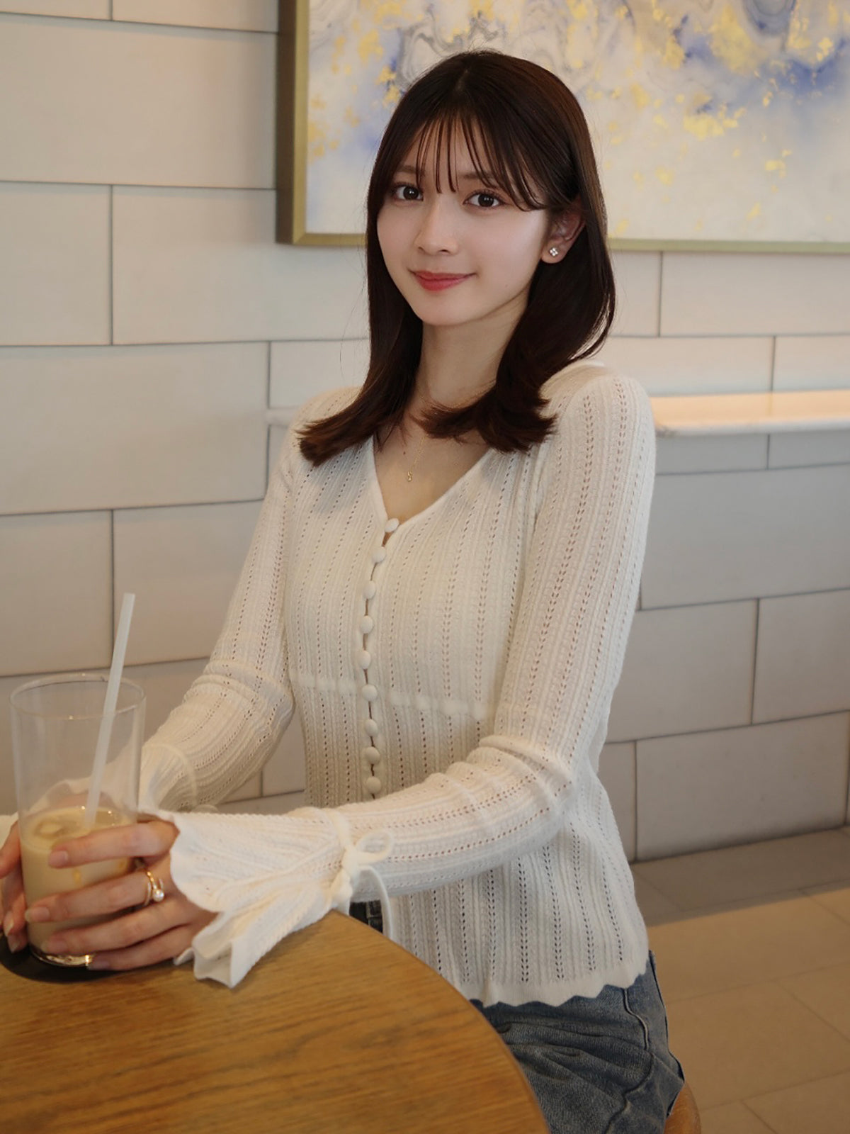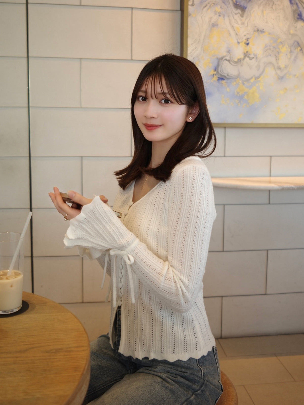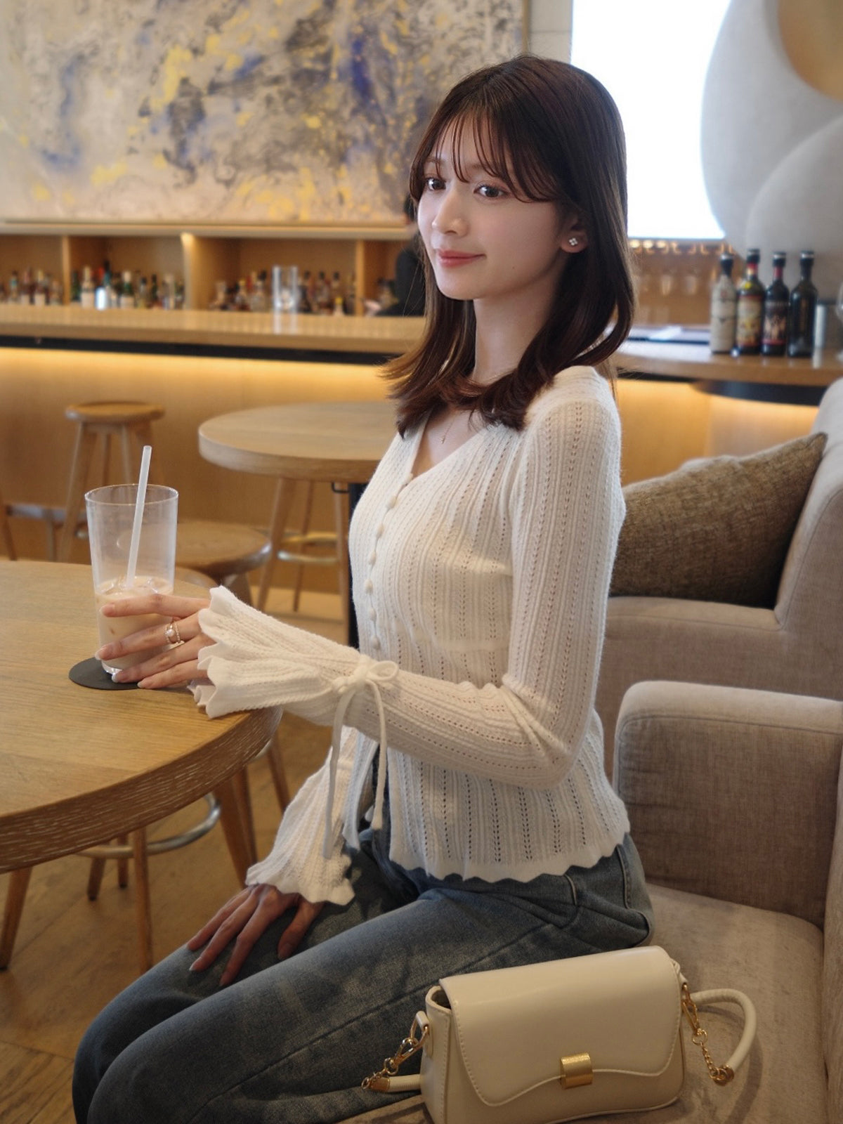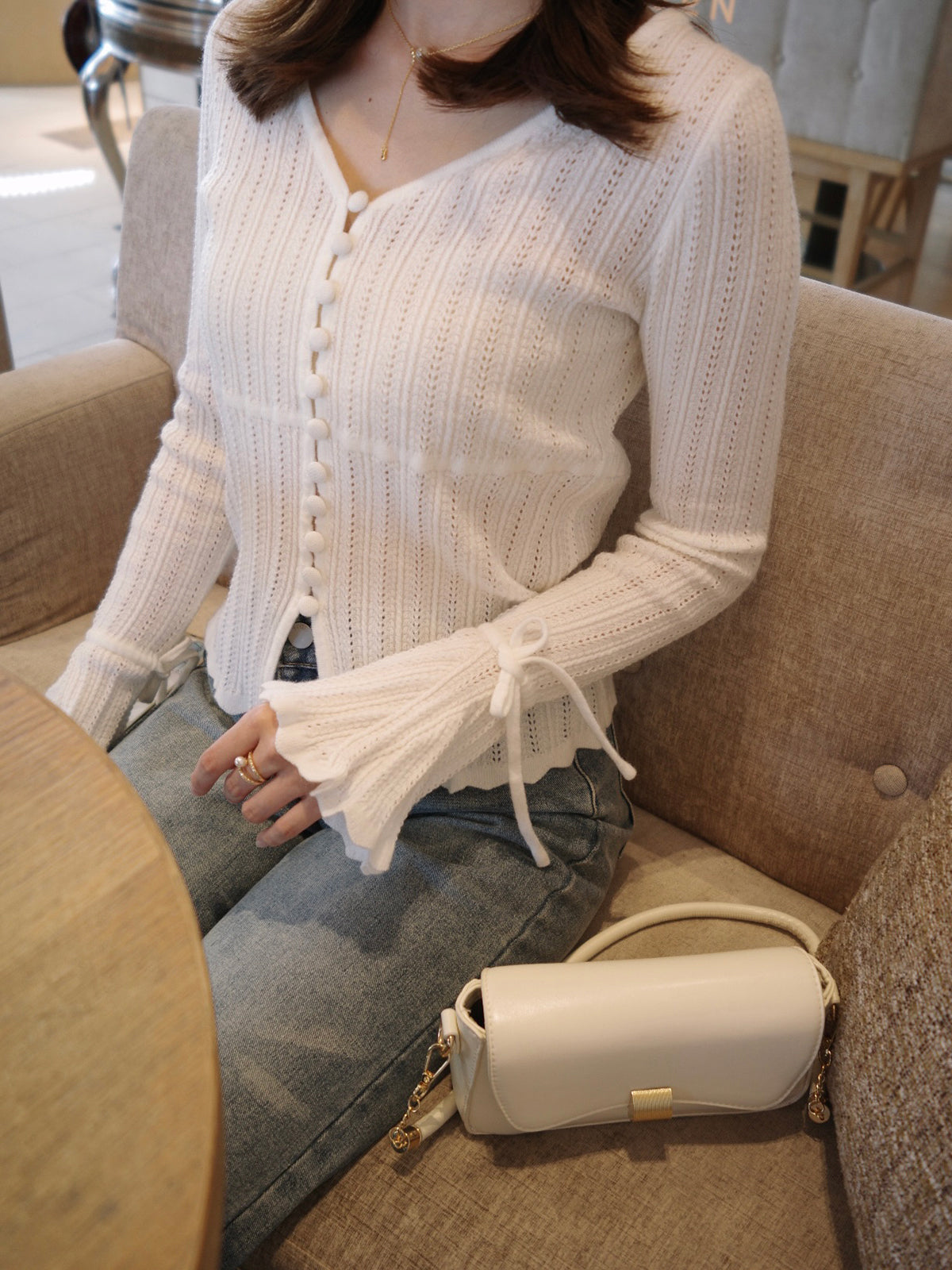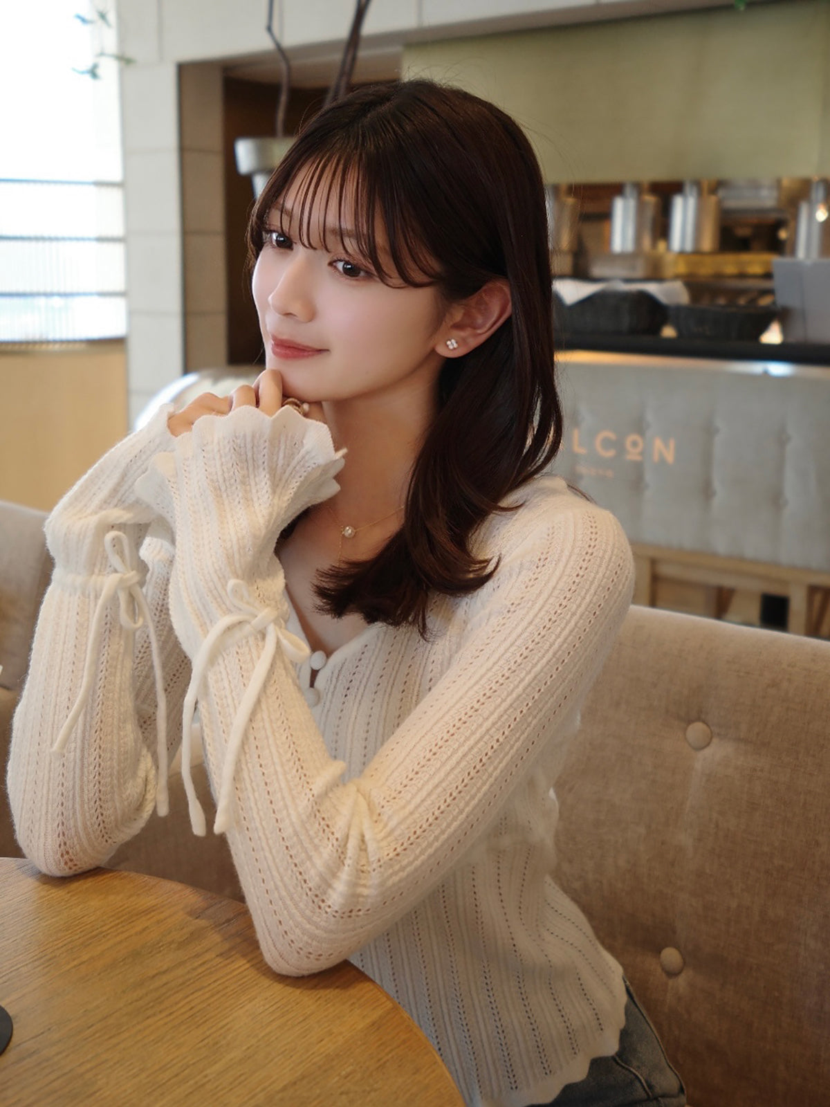 フレアスリーブと袖口の紐が柔らかなニュアンスをプラス。