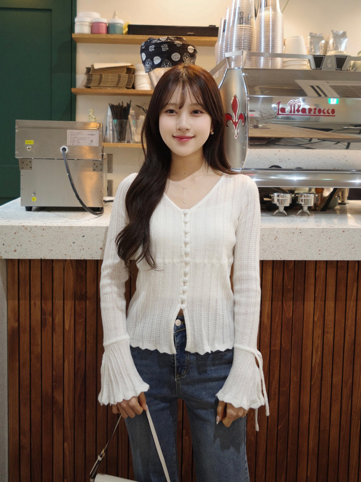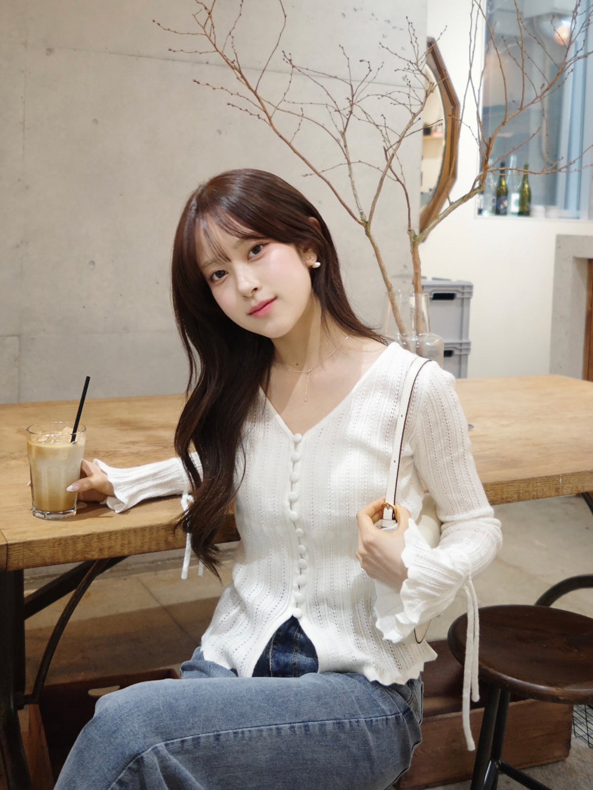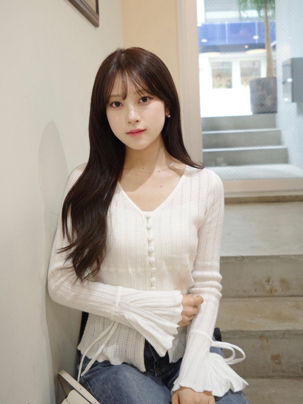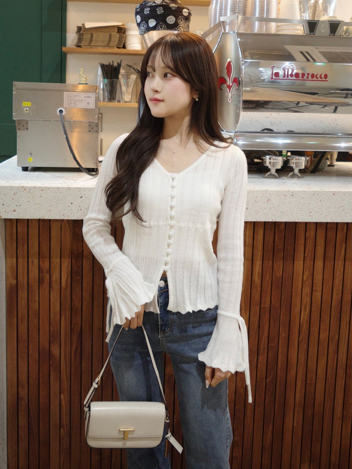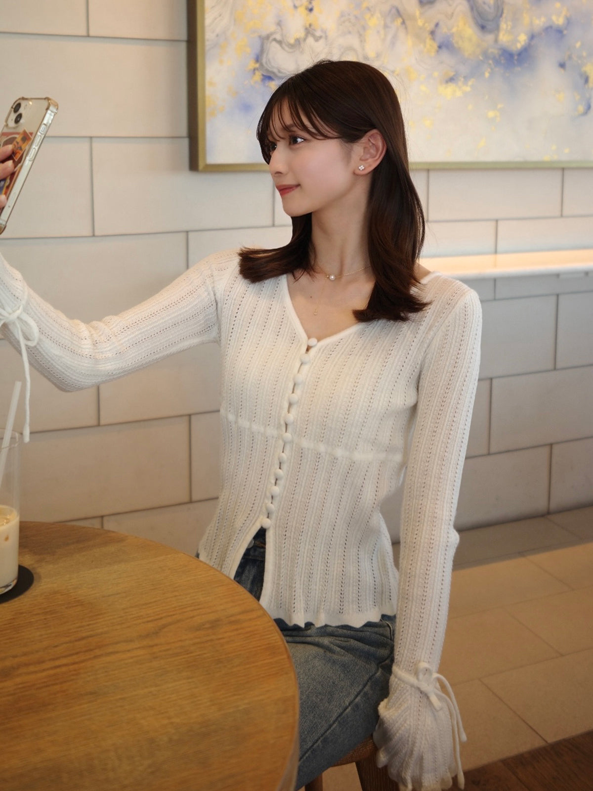 フレアスリーブと袖口の紐が柔らかなニュアンスをプラス。
