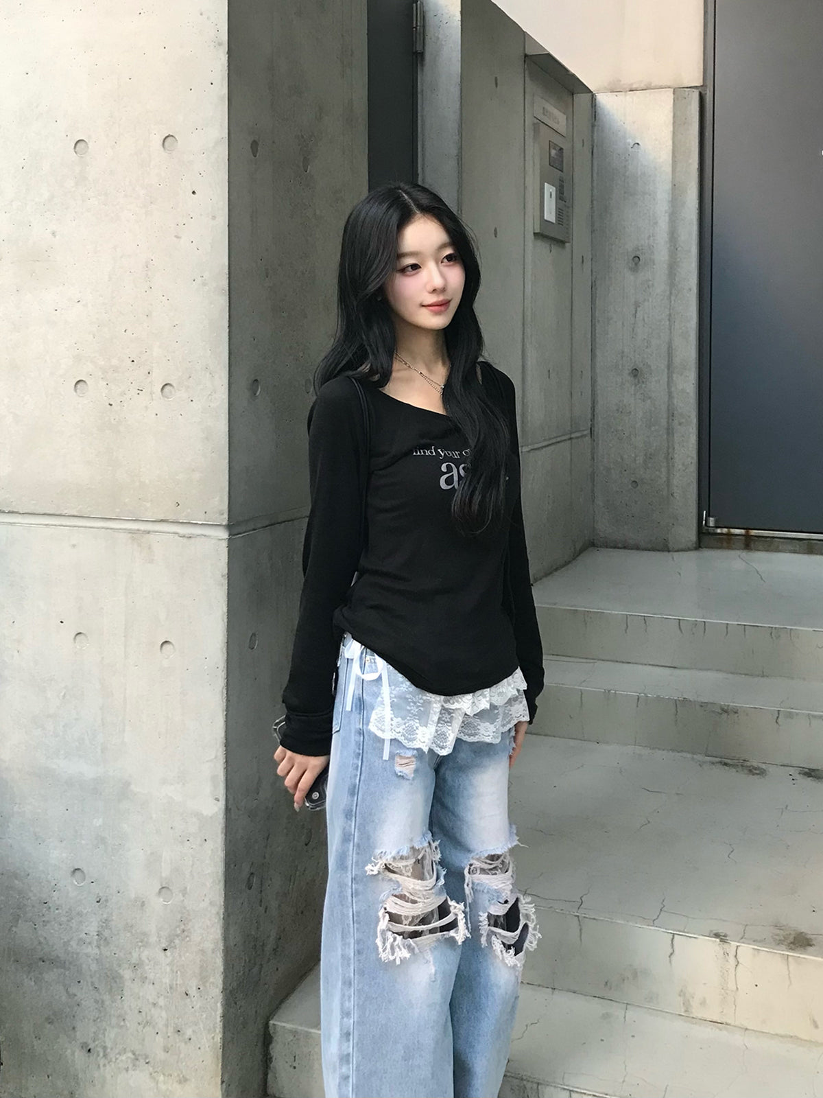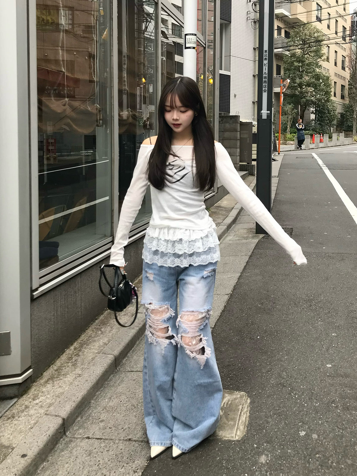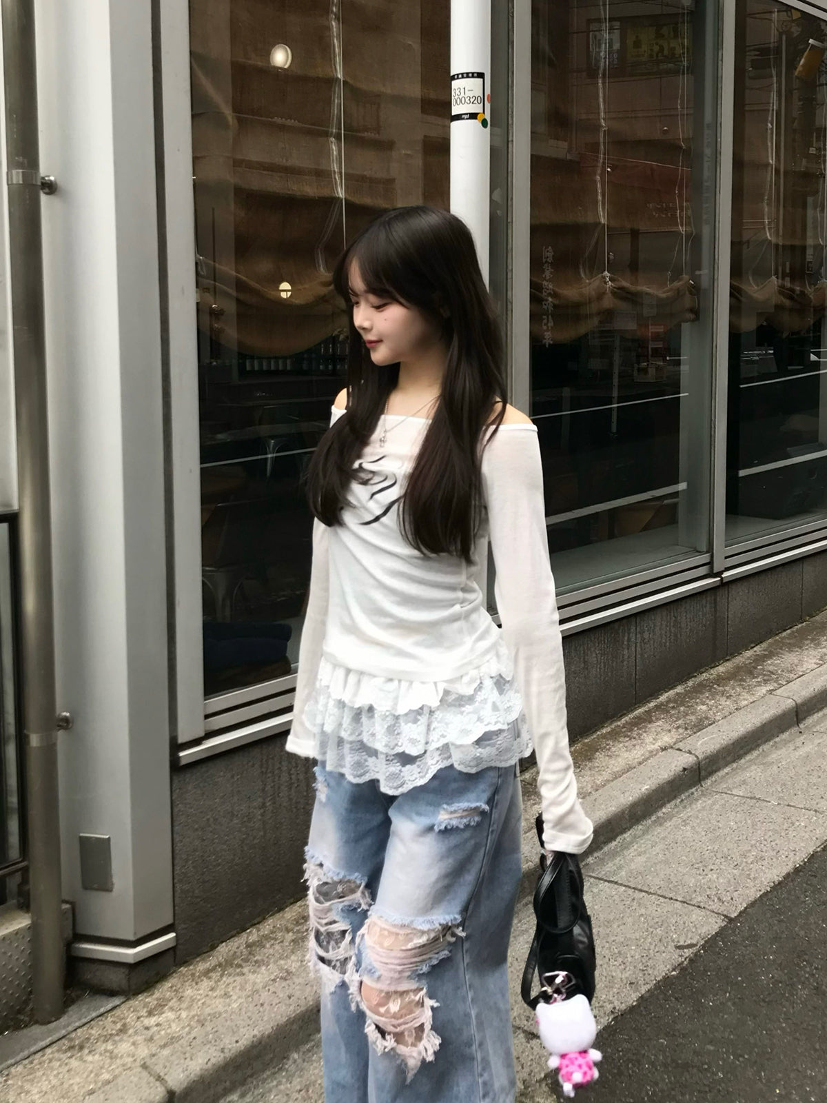 The damaged area features a lace design, soThis is a piece that minimizes skin exposure and is easy to challenge.