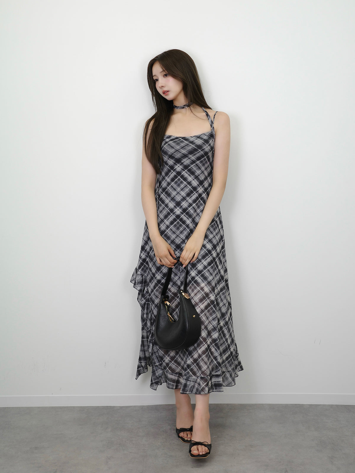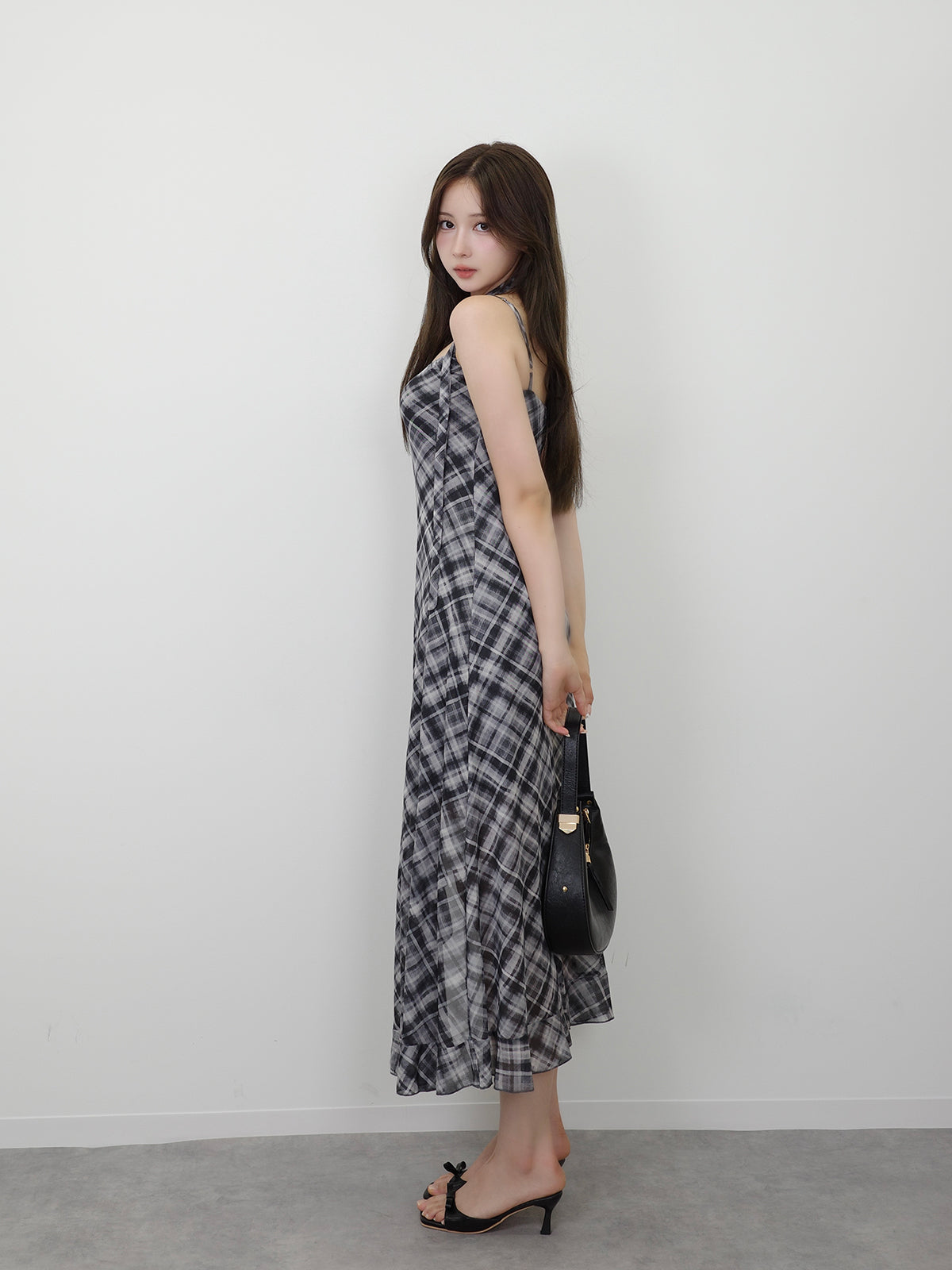 裾にフリルをあしらい、アシンメトリーなカッティングで動きのあるシルエットに仕上げたキャミワンピース。