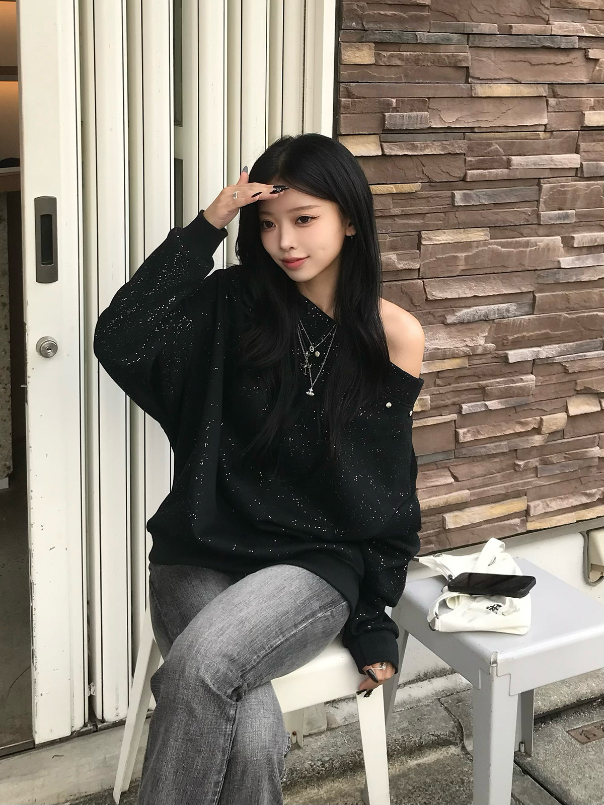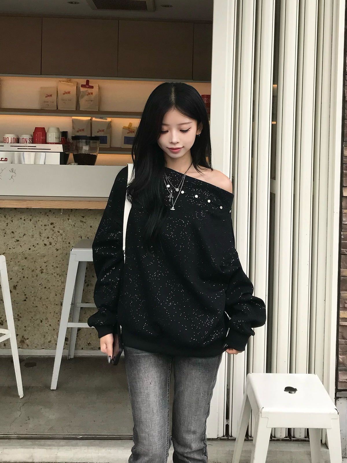 スタッズモチーフをあしらった、オフショルにもワンショルにも着られるラメスウェット。
